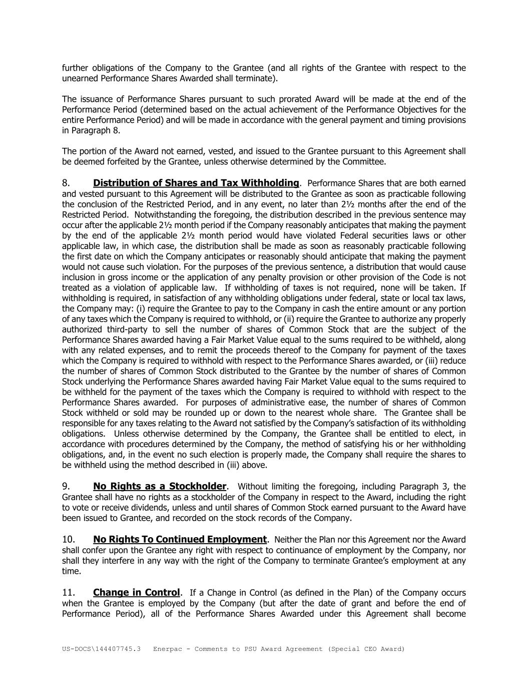 US-DOCS\144407745.3 Enerpac - Comments to PSU Award Agreement (Special CEO Award) further obligations of the Company to the Grantee (and all rights of the Grantee with respect to the unearned Performance Shares Awarded shall terminate). The issuance of Performance Shares pursuant to such prorated Award will be made at the end of the Performance Period (determined based on the actual achievement of the Performance Objectives for the entire Performance Period) and will be made in accordance with the general payment and timing provisions in Paragraph 8. The portion of the Award not earned, vested, and issued to the Grantee pursuant to this Agreement shall be deemed forfeited by the Grantee, unless otherwise determined by the Committee. 8. Distribution of Shares and Tax Withholding. Performance Shares that are both earned and vested pursuant to this Agreement will be distributed to the Grantee as soon as practicable following the conclusion of the Restricted Period, and in any event, no later than 2½ months after the end of the Restricted Period. Notwithstanding the foregoing, the distribution described in the previous sentence may occur after the applicable 2½ month period if the Company reasonably anticipates that making the payment by the end of the applicable 2½ month period would have violated Federal securities laws or other applicable law, in which case, the distribution shall be made as soon as reasonably practicable following the first date on which the Company anticipates or reasonably should anticipate that making the payment would not cause such violation. For the purposes of the previous sentence, a distribution that would cause inclusion in gross income or the application of any penalty provision or other provision of the Code is not treated as a violation of applicable law. If withholding of taxes is not required, none will be taken. If withholding is required, in satisfaction of any withholding obligations under federal, state or local tax laws, the Company may: (i) require the Grantee to pay to the Company in cash the entire amount or any portion of any taxes which the Company is required to withhold, or (ii) require the Grantee to authorize any properly authorized third-party to sell the number of shares of Common Stock that are the subject of the Performance Shares awarded having a Fair Market Value equal to the sums required to be withheld, along with any related expenses, and to remit the proceeds thereof to the Company for payment of the taxes which the Company is required to withhold with respect to the Performance Shares awarded, or (iii) reduce the number of shares of Common Stock distributed to the Grantee by the number of shares of Common Stock underlying the Performance Shares awarded having Fair Market Value equal to the sums required to be withheld for the payment of the taxes which the Company is required to withhold with respect to the Performance Shares awarded. For purposes of administrative ease, the number of shares of Common Stock withheld or sold may be rounded up or down to the nearest whole share. The Grantee shall be responsible for any taxes relating to the Award not satisfied by the Company’s satisfaction of its withholding obligations. Unless otherwise determined by the Company, the Grantee shall be entitled to elect, in accordance with procedures determined by the Company, the method of satisfying his or her withholding obligations, and, in the event no such election is properly made, the Company shall require the shares to be withheld using the method described in (iii) above. 9. No Rights as a Stockholder. Without limiting the foregoing, including Paragraph 3, the Grantee shall have no rights as a stockholder of the Company in respect to the Award, including the right to vote or receive dividends, unless and until shares of Common Stock earned pursuant to the Award have been issued to Grantee, and recorded on the stock records of the Company. 10. No Rights To Continued Employment. Neither the Plan nor this Agreement nor the Award shall confer upon the Grantee any right with respect to continuance of employment by the Company, nor shall they interfere in any way with the right of the Company to terminate Grantee’s employment at any time. 11. Change in Control. If a Change in Control (as defined in the Plan) of the Company occurs when the Grantee is employed by the Company (but after the date of grant and before the end of Performance Period), all of the Performance Shares Awarded under this Agreement shall become