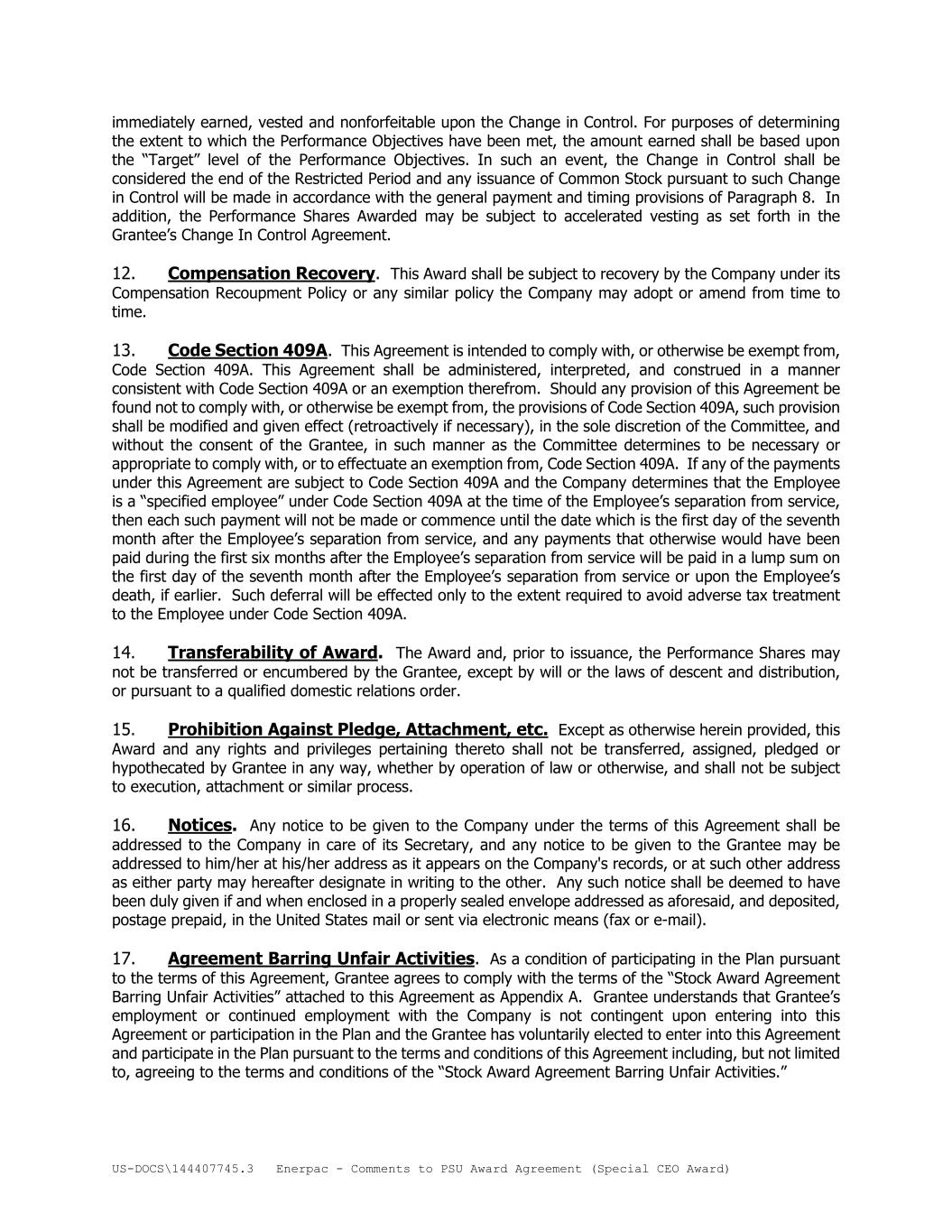 US-DOCS\144407745.3 Enerpac - Comments to PSU Award Agreement (Special CEO Award) immediately earned, vested and nonforfeitable upon the Change in Control. For purposes of determining the extent to which the Performance Objectives have been met, the amount earned shall be based upon the “Target” level of the Performance Objectives. In such an event, the Change in Control shall be considered the end of the Restricted Period and any issuance of Common Stock pursuant to such Change in Control will be made in accordance with the general payment and timing provisions of Paragraph 8. In addition, the Performance Shares Awarded may be subject to accelerated vesting as set forth in the Grantee’s Change In Control Agreement. 12. Compensation Recovery. This Award shall be subject to recovery by the Company under its Compensation Recoupment Policy or any similar policy the Company may adopt or amend from time to time. 13. Code Section 409A. This Agreement is intended to comply with, or otherwise be exempt from, Code Section 409A. This Agreement shall be administered, interpreted, and construed in a manner consistent with Code Section 409A or an exemption therefrom. Should any provision of this Agreement be found not to comply with, or otherwise be exempt from, the provisions of Code Section 409A, such provision shall be modified and given effect (retroactively if necessary), in the sole discretion of the Committee, and without the consent of the Grantee, in such manner as the Committee determines to be necessary or appropriate to comply with, or to effectuate an exemption from, Code Section 409A. If any of the payments under this Agreement are subject to Code Section 409A and the Company determines that the Employee is a “specified employee” under Code Section 409A at the time of the Employee’s separation from service, then each such payment will not be made or commence until the date which is the first day of the seventh month after the Employee’s separation from service, and any payments that otherwise would have been paid during the first six months after the Employee’s separation from service will be paid in a lump sum on the first day of the seventh month after the Employee’s separation from service or upon the Employee’s death, if earlier. Such deferral will be effected only to the extent required to avoid adverse tax treatment to the Employee under Code Section 409A. 14. Transferability of Award. The Award and, prior to issuance, the Performance Shares may not be transferred or encumbered by the Grantee, except by will or the laws of descent and distribution, or pursuant to a qualified domestic relations order. 15. Prohibition Against Pledge, Attachment, etc. Except as otherwise herein provided, this Award and any rights and privileges pertaining thereto shall not be transferred, assigned, pledged or hypothecated by Grantee in any way, whether by operation of law or otherwise, and shall not be subject to execution, attachment or similar process. 16. Notices. Any notice to be given to the Company under the terms of this Agreement shall be addressed to the Company in care of its Secretary, and any notice to be given to the Grantee may be addressed to him/her at his/her address as it appears on the Company's records, or at such other address as either party may hereafter designate in writing to the other. Any such notice shall be deemed to have been duly given if and when enclosed in a properly sealed envelope addressed as aforesaid, and deposited, postage prepaid, in the United States mail or sent via electronic means (fax or e-mail). 17. Agreement Barring Unfair Activities. As a condition of participating in the Plan pursuant to the terms of this Agreement, Grantee agrees to comply with the terms of the “Stock Award Agreement Barring Unfair Activities” attached to this Agreement as Appendix A. Grantee understands that Grantee’s employment or continued employment with the Company is not contingent upon entering into this Agreement or participation in the Plan and the Grantee has voluntarily elected to enter into this Agreement and participate in the Plan pursuant to the terms and conditions of this Agreement including, but not limited to, agreeing to the terms and conditions of the “Stock Award Agreement Barring Unfair Activities.”