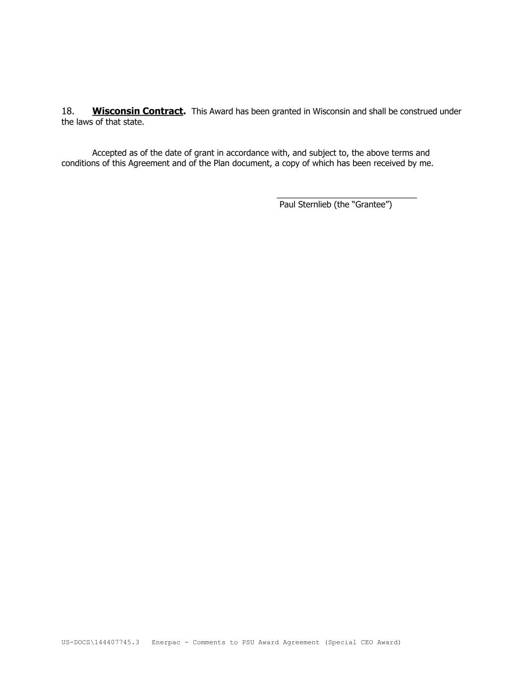 US-DOCS\144407745.3 Enerpac - Comments to PSU Award Agreement (Special CEO Award) 18. Wisconsin Contract. This Award has been granted in Wisconsin and shall be construed under the laws of that state. Accepted as of the date of grant in accordance with, and subject to, the above terms and conditions of this Agreement and of the Plan document, a copy of which has been received by me. ______________________________ Paul Sternlieb (the “Grantee”)