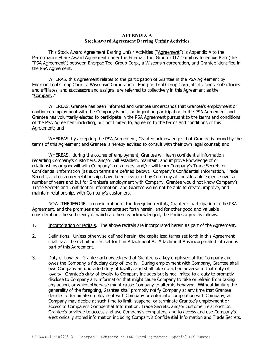 US-DOCS\144407745.3 Enerpac - Comments to PSU Award Agreement (Special CEO Award) APPENDIX A Stock Award Agreement Barring Unfair Activities This Stock Award Agreement Barring Unfair Activities (“Agreement”) is Appendix A to the Performance Share Award Agreement under the Enerpac Tool Group 2017 Omnibus Incentive Plan (the “PSA Agreement”) between Enerpac Tool Group Corp., a Wisconsin corporation, and Grantee identified in the PSA Agreement. WHERAS, this Agreement relates to the participation of Grantee in the PSA Agreement by Enerpac Tool Group Corp., a Wisconsin Corporation. Enerpac Tool Group Corp., its divisions, subsidiaries and affiliates, and successors and assigns, are referred to collectively in this Agreement as the “Company.” WHEREAS, Grantee has been informed and Grantee understands that Grantee’s employment or continued employment with the Company is not contingent on participation in the PSA Agreement and Grantee has voluntarily elected to participate in the PSA Agreement pursuant to the terms and conditions of the PSA Agreement including, but not limited to, agreeing to the terms and conditions of this Agreement; and WHEREAS, by accepting the PSA Agreement, Grantee acknowledges that Grantee is bound by the terms of this Agreement and Grantee is hereby advised to consult with their own legal counsel; and WHEREAS, during the course of employment, Grantee will learn confidential information regarding Company’s customers, and/or will establish, maintain, and improve knowledge of or relationships or goodwill with Company’s customers, and/or will learn Company’s Trade Secrets or Confidential Information (as such terms are defined below). Company’s Confidential Information, Trade Secrets, and customer relationships have been developed by Company at considerable expense over a number of years and but for Grantee’s employment with Company, Grantee would not know Company’s Trade Secrets and Confidential Information, and Grantee would not be able to create, improve, and maintain relationships with Company’s customers. NOW, THEREFORE, in consideration of the foregoing recitals, Grantee’s participation in the PSA Agreement, and the promises and covenants set forth herein, and for other good and valuable consideration, the sufficiency of which are hereby acknowledged, the Parties agree as follows: 1. Incorporation or recitals. The above recitals are incorporated herein as part of the Agreement. 2. Definitions. Unless otherwise defined herein, the capitalized terms set forth in this Agreement shall have the definitions as set forth in Attachment A. Attachment A is incorporated into and is part of this Agreement. 3. Duty of Loyalty. Grantee acknowledges that Grantee is a key employee of the Company and owes the Company a fiduciary duty of loyalty. During employment with Company, Grantee shall owe Company an undivided duty of loyalty, and shall take no action adverse to that duty of loyalty. Grantee’s duty of loyalty to Company includes but is not limited to a duty to promptly disclose to Company any information that might cause Company to take or refrain from taking any action, or which otherwise might cause Company to alter its behavior. Without limiting the generality of the foregoing, Grantee shall promptly notify Company at any time that Grantee decides to terminate employment with Company or enter into competition with Company, as Company may decide at such time to limit, suspend, or terminate Grantee’s employment or access to Company’s Confidential Information, Trade Secrets, and/or customer relationships. Grantee’s privilege to access and use Company’s computers, and to access and use Company’s electronically stored information including Company’s Confidential Information and Trade Secrets,