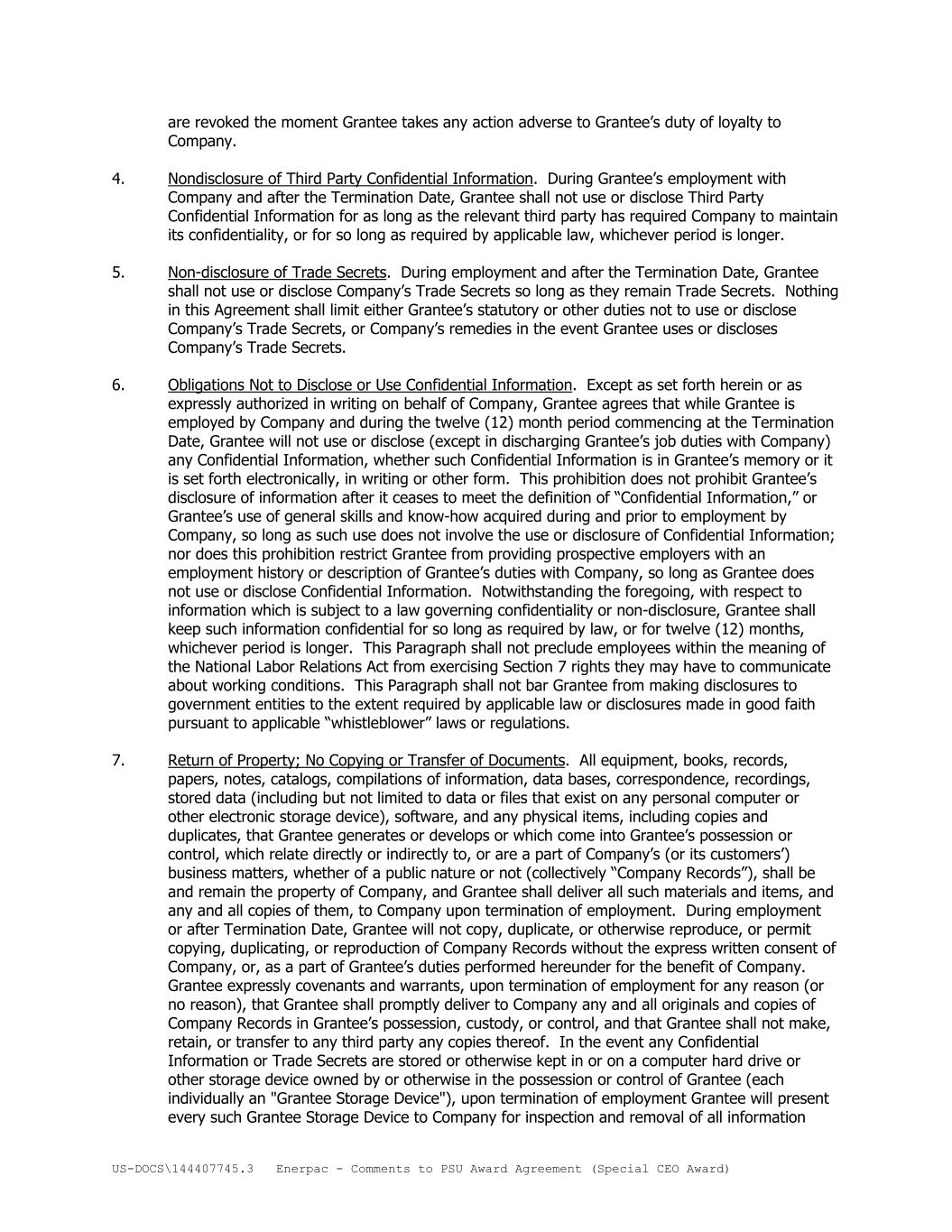 US-DOCS\144407745.3 Enerpac - Comments to PSU Award Agreement (Special CEO Award) are revoked the moment Grantee takes any action adverse to Grantee’s duty of loyalty to Company. 4. Nondisclosure of Third Party Confidential Information. During Grantee’s employment with Company and after the Termination Date, Grantee shall not use or disclose Third Party Confidential Information for as long as the relevant third party has required Company to maintain its confidentiality, or for so long as required by applicable law, whichever period is longer. 5. Non-disclosure of Trade Secrets. During employment and after the Termination Date, Grantee shall not use or disclose Company’s Trade Secrets so long as they remain Trade Secrets. Nothing in this Agreement shall limit either Grantee’s statutory or other duties not to use or disclose Company’s Trade Secrets, or Company’s remedies in the event Grantee uses or discloses Company’s Trade Secrets. 6. Obligations Not to Disclose or Use Confidential Information. Except as set forth herein or as expressly authorized in writing on behalf of Company, Grantee agrees that while Grantee is employed by Company and during the twelve (12) month period commencing at the Termination Date, Grantee will not use or disclose (except in discharging Grantee’s job duties with Company) any Confidential Information, whether such Confidential Information is in Grantee’s memory or it is set forth electronically, in writing or other form. This prohibition does not prohibit Grantee’s disclosure of information after it ceases to meet the definition of “Confidential Information,” or Grantee’s use of general skills and know-how acquired during and prior to employment by Company, so long as such use does not involve the use or disclosure of Confidential Information; nor does this prohibition restrict Grantee from providing prospective employers with an employment history or description of Grantee’s duties with Company, so long as Grantee does not use or disclose Confidential Information. Notwithstanding the foregoing, with respect to information which is subject to a law governing confidentiality or non-disclosure, Grantee shall keep such information confidential for so long as required by law, or for twelve (12) months, whichever period is longer. This Paragraph shall not preclude employees within the meaning of the National Labor Relations Act from exercising Section 7 rights they may have to communicate about working conditions. This Paragraph shall not bar Grantee from making disclosures to government entities to the extent required by applicable law or disclosures made in good faith pursuant to applicable “whistleblower” laws or regulations. 7. Return of Property; No Copying or Transfer of Documents. All equipment, books, records, papers, notes, catalogs, compilations of information, data bases, correspondence, recordings, stored data (including but not limited to data or files that exist on any personal computer or other electronic storage device), software, and any physical items, including copies and duplicates, that Grantee generates or develops or which come into Grantee’s possession or control, which relate directly or indirectly to, or are a part of Company’s (or its customers’) business matters, whether of a public nature or not (collectively “Company Records”), shall be and remain the property of Company, and Grantee shall deliver all such materials and items, and any and all copies of them, to Company upon termination of employment. During employment or after Termination Date, Grantee will not copy, duplicate, or otherwise reproduce, or permit copying, duplicating, or reproduction of Company Records without the express written consent of Company, or, as a part of Grantee’s duties performed hereunder for the benefit of Company. Grantee expressly covenants and warrants, upon termination of employment for any reason (or no reason), that Grantee shall promptly deliver to Company any and all originals and copies of Company Records in Grantee’s possession, custody, or control, and that Grantee shall not make, retain, or transfer to any third party any copies thereof. In the event any Confidential Information or Trade Secrets are stored or otherwise kept in or on a computer hard drive or other storage device owned by or otherwise in the possession or control of Grantee (each individually an "Grantee Storage Device"), upon termination of employment Grantee will present every such Grantee Storage Device to Company for inspection and removal of all information