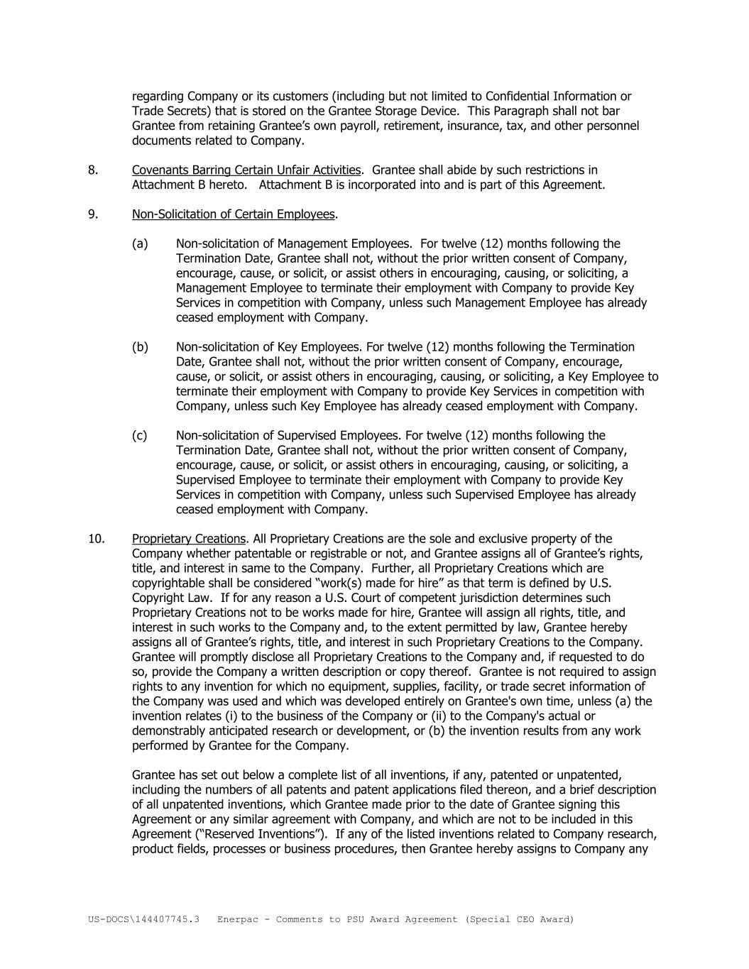 US-DOCS\144407745.3 Enerpac - Comments to PSU Award Agreement (Special CEO Award) regarding Company or its customers (including but not limited to Confidential Information or Trade Secrets) that is stored on the Grantee Storage Device. This Paragraph shall not bar Grantee from retaining Grantee’s own payroll, retirement, insurance, tax, and other personnel documents related to Company. 8. Covenants Barring Certain Unfair Activities. Grantee shall abide by such restrictions in Attachment B hereto. Attachment B is incorporated into and is part of this Agreement. 9. Non-Solicitation of Certain Employees. (a) Non-solicitation of Management Employees. For twelve (12) months following the Termination Date, Grantee shall not, without the prior written consent of Company, encourage, cause, or solicit, or assist others in encouraging, causing, or soliciting, a Management Employee to terminate their employment with Company to provide Key Services in competition with Company, unless such Management Employee has already ceased employment with Company. (b) Non-solicitation of Key Employees. For twelve (12) months following the Termination Date, Grantee shall not, without the prior written consent of Company, encourage, cause, or solicit, or assist others in encouraging, causing, or soliciting, a Key Employee to terminate their employment with Company to provide Key Services in competition with Company, unless such Key Employee has already ceased employment with Company. (c) Non-solicitation of Supervised Employees. For twelve (12) months following the Termination Date, Grantee shall not, without the prior written consent of Company, encourage, cause, or solicit, or assist others in encouraging, causing, or soliciting, a Supervised Employee to terminate their employment with Company to provide Key Services in competition with Company, unless such Supervised Employee has already ceased employment with Company. 10. Proprietary Creations. All Proprietary Creations are the sole and exclusive property of the Company whether patentable or registrable or not, and Grantee assigns all of Grantee’s rights, title, and interest in same to the Company. Further, all Proprietary Creations which are copyrightable shall be considered “work(s) made for hire” as that term is defined by U.S. Copyright Law. If for any reason a U.S. Court of competent jurisdiction determines such Proprietary Creations not to be works made for hire, Grantee will assign all rights, title, and interest in such works to the Company and, to the extent permitted by law, Grantee hereby assigns all of Grantee’s rights, title, and interest in such Proprietary Creations to the Company. Grantee will promptly disclose all Proprietary Creations to the Company and, if requested to do so, provide the Company a written description or copy thereof. Grantee is not required to assign rights to any invention for which no equipment, supplies, facility, or trade secret information of the Company was used and which was developed entirely on Grantee's own time, unless (a) the invention relates (i) to the business of the Company or (ii) to the Company's actual or demonstrably anticipated research or development, or (b) the invention results from any work performed by Grantee for the Company. Grantee has set out below a complete list of all inventions, if any, patented or unpatented, including the numbers of all patents and patent applications filed thereon, and a brief description of all unpatented inventions, which Grantee made prior to the date of Grantee signing this Agreement or any similar agreement with Company, and which are not to be included in this Agreement (“Reserved Inventions”). If any of the listed inventions related to Company research, product fields, processes or business procedures, then Grantee hereby assigns to Company any
