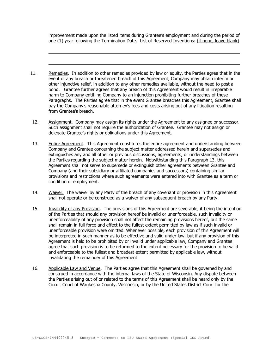 US-DOCS\144407745.3 Enerpac - Comments to PSU Award Agreement (Special CEO Award) improvement made upon the listed items during Grantee’s employment and during the period of one (1) year following the Termination Date. List of Reserved Inventions: (if none, leave blank) ______________________________________________________________________________ ______________________________________________________________________________ 11. Remedies. In addition to other remedies provided by law or equity, the Parties agree that in the event of any breach or threatened breach of this Agreement, Company may obtain interim or other injunctive relief, in addition to any other remedies available, without the need to post a bond. Grantee further agrees that any breach of this Agreement would result in irreparable harm to Company entitling Company to an injunction prohibiting further breaches of these Paragraphs. The Parties agree that in the event Grantee breaches this Agreement, Grantee shall pay the Company’s reasonable attorney’s fees and costs arising out of any litigation resulting from Grantee’s breach. 12. Assignment. Company may assign its rights under the Agreement to any assignee or successor. Such assignment shall not require the authorization of Grantee. Grantee may not assign or delegate Grantee’s rights or obligations under this Agreement. 13. Entire Agreement. This Agreement constitutes the entire agreement and understanding between Company and Grantee concerning the subject matter addressed herein and supersedes and extinguishes any and all other or previous discussions, agreements, or understandings between the Parties regarding the subject matter herein. Notwithstanding this Paragraph 13, this Agreement shall not serve to supersede or extinguish other agreements between Grantee and Company (and their subsidiary or affiliated companies and successors) containing similar provisions and restrictions where such agreements were entered into with Grantee as a term or condition of employment. 14. Waiver. The waiver by any Party of the breach of any covenant or provision in this Agreement shall not operate or be construed as a waiver of any subsequent breach by any Party. 15. Invalidity of any Provision. The provisions of this Agreement are severable, it being the intention of the Parties that should any provision hereof be invalid or unenforceable, such invalidity or unenforceability of any provision shall not affect the remaining provisions hereof, but the same shall remain in full force and effect to the fullest extent permitted by law as if such invalid or unenforceable provision were omitted. Whenever possible, each provision of this Agreement will be interpreted in such manner as to be effective and valid under law, but if any provision of this Agreement is held to be prohibited by or invalid under applicable law, Company and Grantee agree that such provision is to be reformed to the extent necessary for the provision to be valid and enforceable to the fullest and broadest extent permitted by applicable law, without invalidating the remainder of this Agreement 16. Applicable Law and Venue. The Parties agree that this Agreement shall be governed by and construed in accordance with the internal laws of the State of Wisconsin. Any dispute between the Parties arising out of or related to the terms of this Agreement shall be heard only by the Circuit Court of Waukesha County, Wisconsin, or by the United States District Court for the
