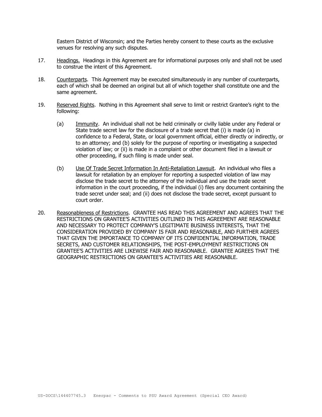 US-DOCS\144407745.3 Enerpac - Comments to PSU Award Agreement (Special CEO Award) Eastern District of Wisconsin; and the Parties hereby consent to these courts as the exclusive venues for resolving any such disputes. 17. Headings. Headings in this Agreement are for informational purposes only and shall not be used to construe the intent of this Agreement. 18. Counterparts. This Agreement may be executed simultaneously in any number of counterparts, each of which shall be deemed an original but all of which together shall constitute one and the same agreement. 19. Reserved Rights. Nothing in this Agreement shall serve to limit or restrict Grantee’s right to the following: (a) Immunity. An individual shall not be held criminally or civilly liable under any Federal or State trade secret law for the disclosure of a trade secret that (i) is made (a) in confidence to a Federal, State, or local government official, either directly or indirectly, or to an attorney; and (b) solely for the purpose of reporting or investigating a suspected violation of law; or (ii) is made in a complaint or other document filed in a lawsuit or other proceeding, if such filing is made under seal. (b) Use Of Trade Secret Information In Anti-Retaliation Lawsuit. An individual who files a lawsuit for retaliation by an employer for reporting a suspected violation of law may disclose the trade secret to the attorney of the individual and use the trade secret information in the court proceeding, if the individual (i) files any document containing the trade secret under seal; and (ii) does not disclose the trade secret, except pursuant to court order. 20. Reasonableness of Restrictions. GRANTEE HAS READ THIS AGREEMENT AND AGREES THAT THE RESTRICTIONS ON GRANTEE’S ACTIVITIES OUTLINED IN THIS AGREEMENT ARE REASONABLE AND NECESSARY TO PROTECT COMPANY’S LEGITIMATE BUSINESS INTERESTS, THAT THE CONSIDERATION PROVIDED BY COMPANY IS FAIR AND REASONABLE, AND FURTHER AGREES THAT GIVEN THE IMPORTANCE TO COMPANY OF ITS CONFIDENTIAL INFORMATION, TRADE SECRETS, AND CUSTOMER RELATIONSHIPS, THE POST-EMPLOYMENT RESTRICTIONS ON GRANTEE’S ACTIVITIES ARE LIKEWISE FAIR AND REASONABLE. GRANTEE AGREES THAT THE GEOGRAPHIC RESTRICTIONS ON GRANTEE’S ACTIVITIES ARE REASONABLE.