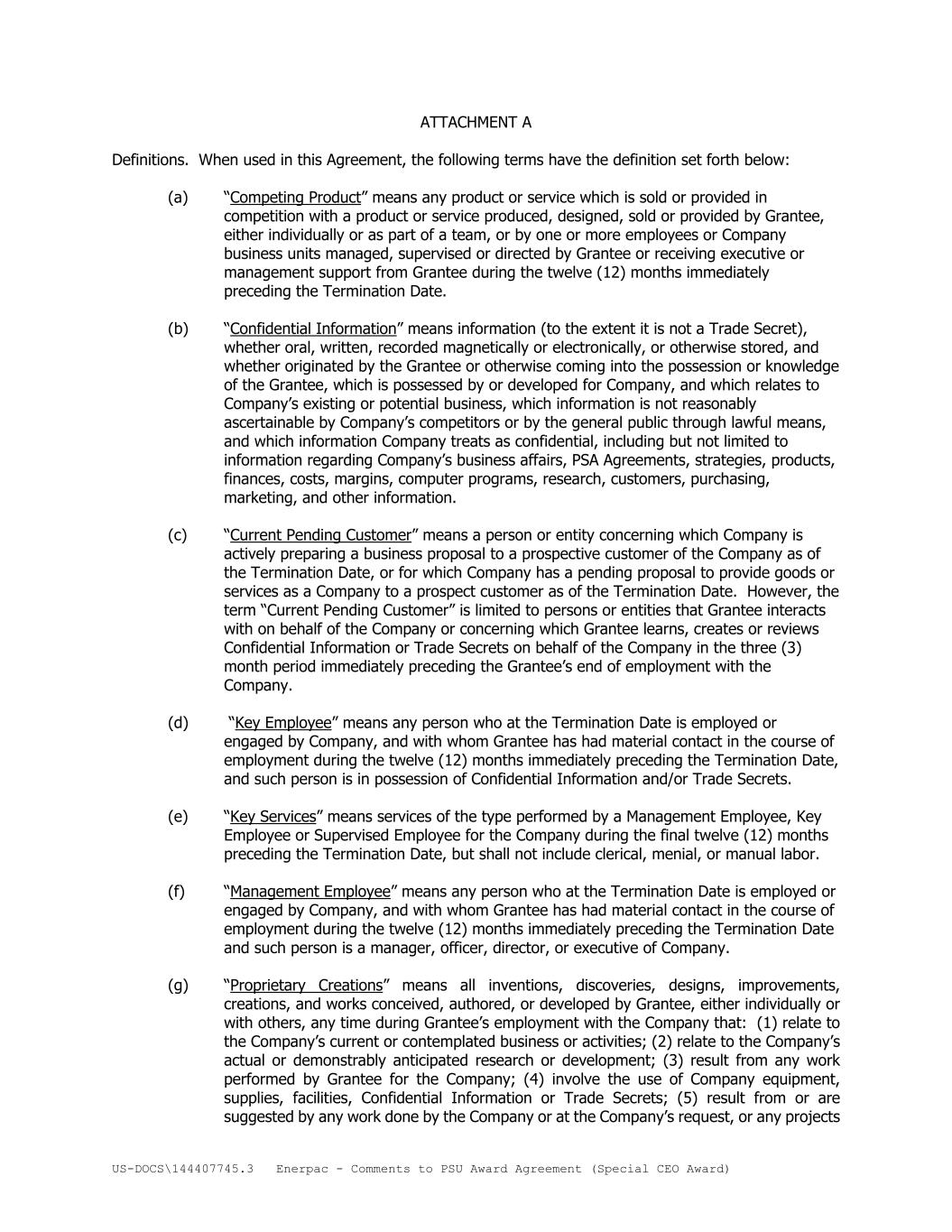 US-DOCS\144407745.3 Enerpac - Comments to PSU Award Agreement (Special CEO Award) ATTACHMENT A Definitions. When used in this Agreement, the following terms have the definition set forth below: (a) “Competing Product” means any product or service which is sold or provided in competition with a product or service produced, designed, sold or provided by Grantee, either individually or as part of a team, or by one or more employees or Company business units managed, supervised or directed by Grantee or receiving executive or management support from Grantee during the twelve (12) months immediately preceding the Termination Date. (b) “Confidential Information” means information (to the extent it is not a Trade Secret), whether oral, written, recorded magnetically or electronically, or otherwise stored, and whether originated by the Grantee or otherwise coming into the possession or knowledge of the Grantee, which is possessed by or developed for Company, and which relates to Company’s existing or potential business, which information is not reasonably ascertainable by Company’s competitors or by the general public through lawful means, and which information Company treats as confidential, including but not limited to information regarding Company’s business affairs, PSA Agreements, strategies, products, finances, costs, margins, computer programs, research, customers, purchasing, marketing, and other information. (c) “Current Pending Customer” means a person or entity concerning which Company is actively preparing a business proposal to a prospective customer of the Company as of the Termination Date, or for which Company has a pending proposal to provide goods or services as a Company to a prospect customer as of the Termination Date. However, the term “Current Pending Customer” is limited to persons or entities that Grantee interacts with on behalf of the Company or concerning which Grantee learns, creates or reviews Confidential Information or Trade Secrets on behalf of the Company in the three (3) month period immediately preceding the Grantee’s end of employment with the Company. (d) “Key Employee” means any person who at the Termination Date is employed or engaged by Company, and with whom Grantee has had material contact in the course of employment during the twelve (12) months immediately preceding the Termination Date, and such person is in possession of Confidential Information and/or Trade Secrets. (e) “Key Services” means services of the type performed by a Management Employee, Key Employee or Supervised Employee for the Company during the final twelve (12) months preceding the Termination Date, but shall not include clerical, menial, or manual labor. (f) “Management Employee” means any person who at the Termination Date is employed or engaged by Company, and with whom Grantee has had material contact in the course of employment during the twelve (12) months immediately preceding the Termination Date and such person is a manager, officer, director, or executive of Company. (g) “Proprietary Creations” means all inventions, discoveries, designs, improvements, creations, and works conceived, authored, or developed by Grantee, either individually or with others, any time during Grantee’s employment with the Company that: (1) relate to the Company’s current or contemplated business or activities; (2) relate to the Company’s actual or demonstrably anticipated research or development; (3) result from any work performed by Grantee for the Company; (4) involve the use of Company equipment, supplies, facilities, Confidential Information or Trade Secrets; (5) result from or are suggested by any work done by the Company or at the Company’s request, or any projects