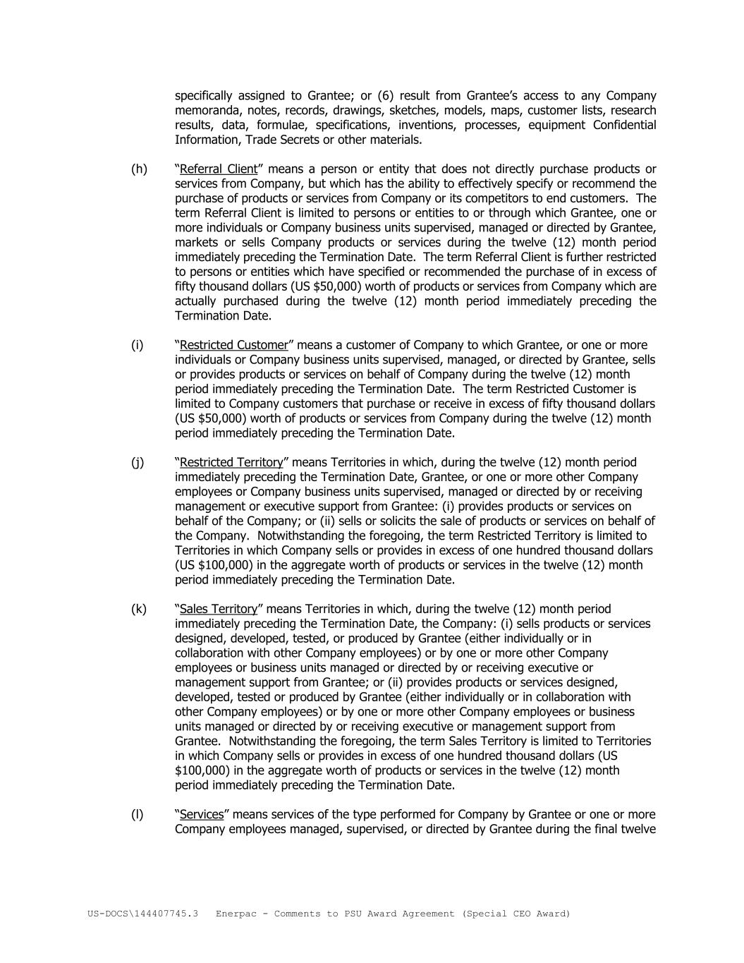 US-DOCS\144407745.3 Enerpac - Comments to PSU Award Agreement (Special CEO Award) specifically assigned to Grantee; or (6) result from Grantee’s access to any Company memoranda, notes, records, drawings, sketches, models, maps, customer lists, research results, data, formulae, specifications, inventions, processes, equipment Confidential Information, Trade Secrets or other materials. (h) “Referral Client” means a person or entity that does not directly purchase products or services from Company, but which has the ability to effectively specify or recommend the purchase of products or services from Company or its competitors to end customers. The term Referral Client is limited to persons or entities to or through which Grantee, one or more individuals or Company business units supervised, managed or directed by Grantee, markets or sells Company products or services during the twelve (12) month period immediately preceding the Termination Date. The term Referral Client is further restricted to persons or entities which have specified or recommended the purchase of in excess of fifty thousand dollars (US $50,000) worth of products or services from Company which are actually purchased during the twelve (12) month period immediately preceding the Termination Date. (i) “Restricted Customer” means a customer of Company to which Grantee, or one or more individuals or Company business units supervised, managed, or directed by Grantee, sells or provides products or services on behalf of Company during the twelve (12) month period immediately preceding the Termination Date. The term Restricted Customer is limited to Company customers that purchase or receive in excess of fifty thousand dollars (US $50,000) worth of products or services from Company during the twelve (12) month period immediately preceding the Termination Date. (j) “Restricted Territory” means Territories in which, during the twelve (12) month period immediately preceding the Termination Date, Grantee, or one or more other Company employees or Company business units supervised, managed or directed by or receiving management or executive support from Grantee: (i) provides products or services on behalf of the Company; or (ii) sells or solicits the sale of products or services on behalf of the Company. Notwithstanding the foregoing, the term Restricted Territory is limited to Territories in which Company sells or provides in excess of one hundred thousand dollars (US $100,000) in the aggregate worth of products or services in the twelve (12) month period immediately preceding the Termination Date. (k) “Sales Territory” means Territories in which, during the twelve (12) month period immediately preceding the Termination Date, the Company: (i) sells products or services designed, developed, tested, or produced by Grantee (either individually or in collaboration with other Company employees) or by one or more other Company employees or business units managed or directed by or receiving executive or management support from Grantee; or (ii) provides products or services designed, developed, tested or produced by Grantee (either individually or in collaboration with other Company employees) or by one or more other Company employees or business units managed or directed by or receiving executive or management support from Grantee. Notwithstanding the foregoing, the term Sales Territory is limited to Territories in which Company sells or provides in excess of one hundred thousand dollars (US $100,000) in the aggregate worth of products or services in the twelve (12) month period immediately preceding the Termination Date. (l) “Services” means services of the type performed for Company by Grantee or one or more Company employees managed, supervised, or directed by Grantee during the final twelve