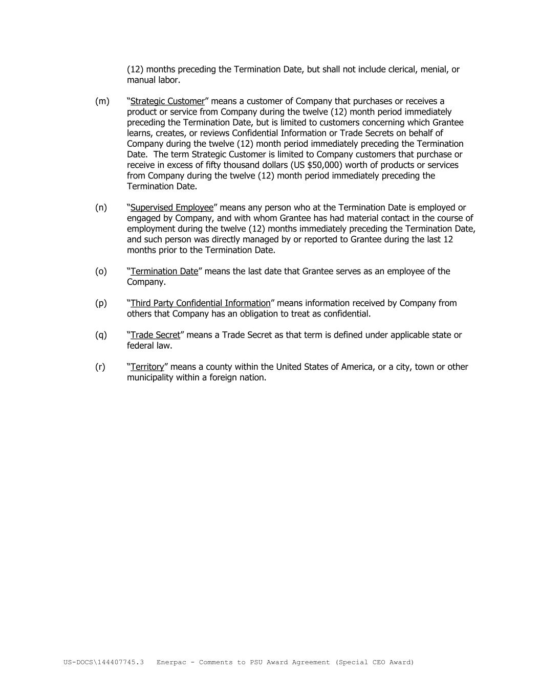 US-DOCS\144407745.3 Enerpac - Comments to PSU Award Agreement (Special CEO Award) (12) months preceding the Termination Date, but shall not include clerical, menial, or manual labor. (m) “Strategic Customer” means a customer of Company that purchases or receives a product or service from Company during the twelve (12) month period immediately preceding the Termination Date, but is limited to customers concerning which Grantee learns, creates, or reviews Confidential Information or Trade Secrets on behalf of Company during the twelve (12) month period immediately preceding the Termination Date. The term Strategic Customer is limited to Company customers that purchase or receive in excess of fifty thousand dollars (US $50,000) worth of products or services from Company during the twelve (12) month period immediately preceding the Termination Date. (n) “Supervised Employee” means any person who at the Termination Date is employed or engaged by Company, and with whom Grantee has had material contact in the course of employment during the twelve (12) months immediately preceding the Termination Date, and such person was directly managed by or reported to Grantee during the last 12 months prior to the Termination Date. (o) “Termination Date” means the last date that Grantee serves as an employee of the Company. (p) “Third Party Confidential Information” means information received by Company from others that Company has an obligation to treat as confidential. (q) “Trade Secret” means a Trade Secret as that term is defined under applicable state or federal law. (r) “Territory” means a county within the United States of America, or a city, town or other municipality within a foreign nation.