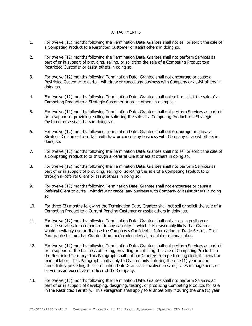 US-DOCS\144407745.3 Enerpac - Comments to PSU Award Agreement (Special CEO Award) ATTACHMENT B 1. For twelve (12) months following the Termination Date, Grantee shall not sell or solicit the sale of a Competing Product to a Restricted Customer or assist others in doing so. 2. For twelve (12) months following the Termination Date, Grantee shall not perform Services as part of or in support of providing, selling, or soliciting the sale of a Competing Product to a Restricted Customer or assist others in doing so. 3. For twelve (12) months following Termination Date, Grantee shall not encourage or cause a Restricted Customer to curtail, withdraw or cancel any business with Company or assist others in doing so. 4. For twelve (12) months following Termination Date, Grantee shall not sell or solicit the sale of a Competing Product to a Strategic Customer or assist others in doing so. 5. For twelve (12) months following Termination Date, Grantee shall not perform Services as part of or in support of providing, selling or soliciting the sale of a Competing Product to a Strategic Customer or assist others in doing so. 6. For twelve (12) months following Termination Date, Grantee shall not encourage or cause a Strategic Customer to curtail, withdraw or cancel any business with Company or assist others in doing so. 7. For twelve (12) months following the Termination Date, Grantee shall not sell or solicit the sale of a Competing Product to or through a Referral Client or assist others in doing so. 8. For twelve (12) months following the Termination Date, Grantee shall not perform Services as part of or in support of providing, selling or soliciting the sale of a Competing Product to or through a Referral Client or assist others in doing so. 9. For twelve (12) months following Termination Date, Grantee shall not encourage or cause a Referral Client to curtail, withdraw or cancel any business with Company or assist others in doing so. 10. For three (3) months following the Termination Date, Grantee shall not sell or solicit the sale of a Competing Product to a Current Pending Customer or assist others in doing so. 11. For twelve (12) months following Termination Date, Grantee shall not accept a position or provide services to a competitor in any capacity in which it is reasonably likely that Grantee would inevitably use or disclose the Company’s Confidential Information or Trade Secrets. This Paragraph shall not bar Grantee from performing clerical, menial or manual labor. 12. For twelve (12) months following Termination Date, Grantee shall not perform Services as part of or in support of the business of selling, providing or soliciting the sale of Competing Products in the Restricted Territory. This Paragraph shall not bar Grantee from performing clerical, menial or manual labor. This Paragraph shall apply to Grantee only if during the one (1) year period immediately preceding the Termination Date Grantee is involved in sales, sales management, or served as an executive or officer of the Company. 13. For twelve (12) months following the Termination Date, Grantee shall not perform Services as part of or in support of developing, designing, testing, or producing Competing Products for sale in the Restricted Territory. This Paragraph shall apply to Grantee only if during the one (1) year