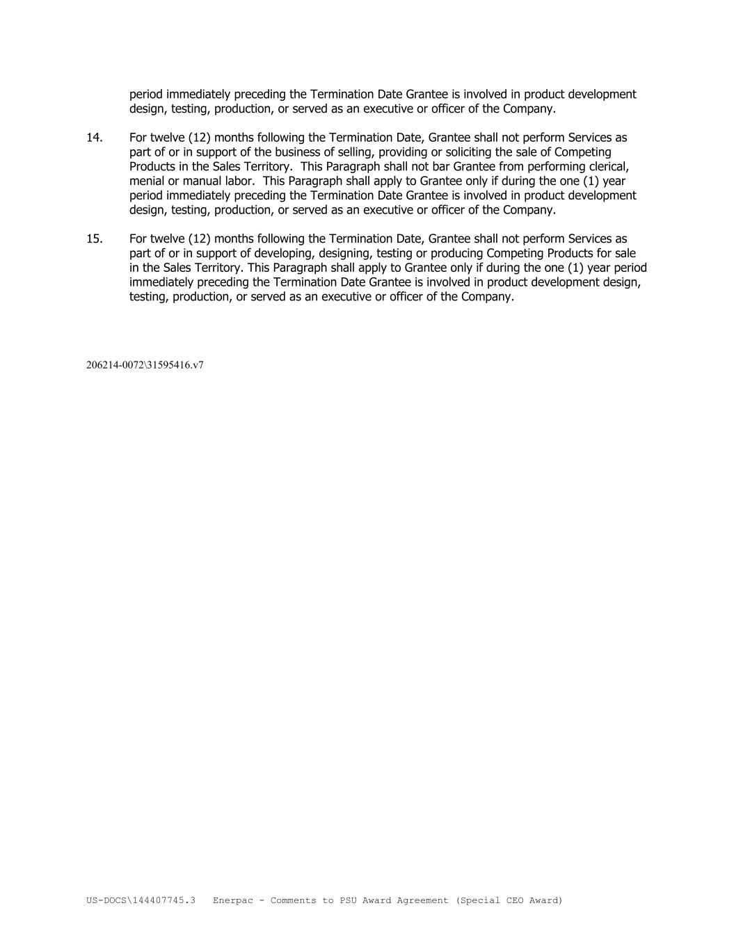 US-DOCS\144407745.3 Enerpac - Comments to PSU Award Agreement (Special CEO Award) period immediately preceding the Termination Date Grantee is involved in product development design, testing, production, or served as an executive or officer of the Company. 14. For twelve (12) months following the Termination Date, Grantee shall not perform Services as part of or in support of the business of selling, providing or soliciting the sale of Competing Products in the Sales Territory. This Paragraph shall not bar Grantee from performing clerical, menial or manual labor. This Paragraph shall apply to Grantee only if during the one (1) year period immediately preceding the Termination Date Grantee is involved in product development design, testing, production, or served as an executive or officer of the Company. 15. For twelve (12) months following the Termination Date, Grantee shall not perform Services as part of or in support of developing, designing, testing or producing Competing Products for sale in the Sales Territory. This Paragraph shall apply to Grantee only if during the one (1) year period immediately preceding the Termination Date Grantee is involved in product development design, testing, production, or served as an executive or officer of the Company. 206214-0072\31595416.v7