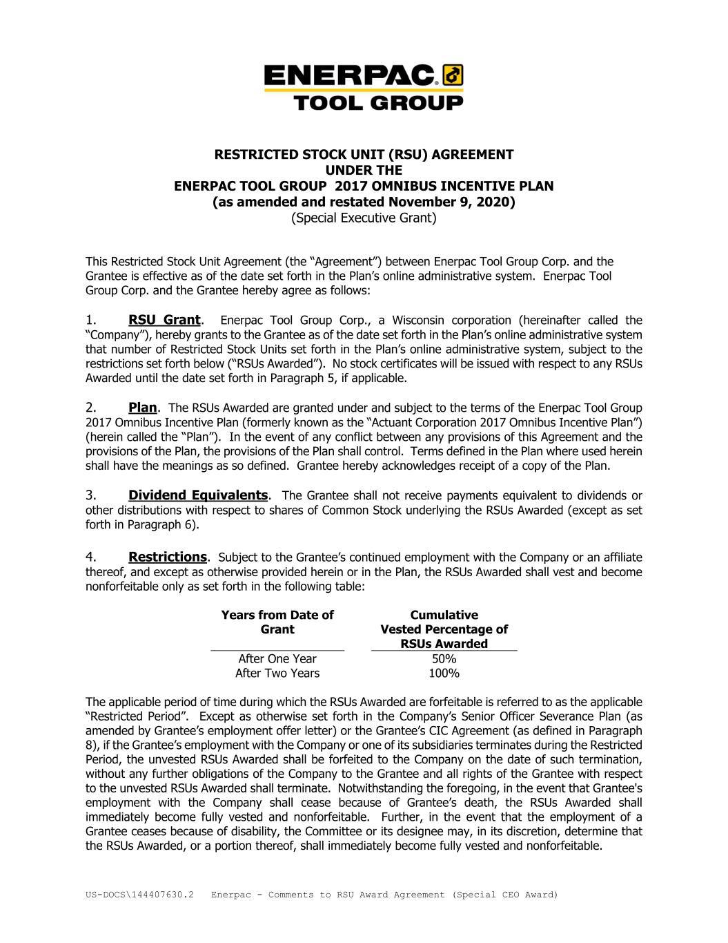 US-DOCS\144407630.2 Enerpac - Comments to RSU Award Agreement (Special CEO Award) RESTRICTED STOCK UNIT (RSU) AGREEMENT UNDER THE ENERPAC TOOL GROUP 2017 OMNIBUS INCENTIVE PLAN (as amended and restated November 9, 2020) (Special Executive Grant) This Restricted Stock Unit Agreement (the “Agreement”) between Enerpac Tool Group Corp. and the Grantee is effective as of the date set forth in the Plan’s online administrative system. Enerpac Tool Group Corp. and the Grantee hereby agree as follows: 1. RSU Grant. Enerpac Tool Group Corp., a Wisconsin corporation (hereinafter called the “Company”), hereby grants to the Grantee as of the date set forth in the Plan’s online administrative system that number of Restricted Stock Units set forth in the Plan’s online administrative system, subject to the restrictions set forth below (“RSUs Awarded”). No stock certificates will be issued with respect to any RSUs Awarded until the date set forth in Paragraph 5, if applicable. 2. Plan. The RSUs Awarded are granted under and subject to the terms of the Enerpac Tool Group 2017 Omnibus Incentive Plan (formerly known as the “Actuant Corporation 2017 Omnibus Incentive Plan”) (herein called the “Plan”). In the event of any conflict between any provisions of this Agreement and the provisions of the Plan, the provisions of the Plan shall control. Terms defined in the Plan where used herein shall have the meanings as so defined. Grantee hereby acknowledges receipt of a copy of the Plan. 3. Dividend Equivalents. The Grantee shall not receive payments equivalent to dividends or other distributions with respect to shares of Common Stock underlying the RSUs Awarded (except as set forth in Paragraph 6). 4. Restrictions. Subject to the Grantee’s continued employment with the Company or an affiliate thereof, and except as otherwise provided herein or in the Plan, the RSUs Awarded shall vest and become nonforfeitable only as set forth in the following table: Years from Date of Grant Cumulative Vested Percentage of RSUs Awarded After One Year 50% After Two Years 100% The applicable period of time during which the RSUs Awarded are forfeitable is referred to as the applicable “Restricted Period”. Except as otherwise set forth in the Company’s Senior Officer Severance Plan (as amended by Grantee’s employment offer letter) or the Grantee’s CIC Agreement (as defined in Paragraph 8), if the Grantee’s employment with the Company or one of its subsidiaries terminates during the Restricted Period, the unvested RSUs Awarded shall be forfeited to the Company on the date of such termination, without any further obligations of the Company to the Grantee and all rights of the Grantee with respect to the unvested RSUs Awarded shall terminate. Notwithstanding the foregoing, in the event that Grantee's employment with the Company shall cease because of Grantee’s death, the RSUs Awarded shall immediately become fully vested and nonforfeitable. Further, in the event that the employment of a Grantee ceases because of disability, the Committee or its designee may, in its discretion, determine that the RSUs Awarded, or a portion thereof, shall immediately become fully vested and nonforfeitable.