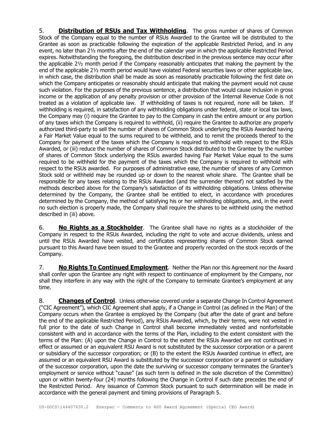 US-DOCS\144407630.2 Enerpac - Comments to RSU Award Agreement (Special CEO Award) 5. Distribution of RSUs and Tax Withholding. The gross number of shares of Common Stock of the Company equal to the number of RSUs Awarded to the Grantee will be distributed to the Grantee as soon as practicable following the expiration of the applicable Restricted Period, and in any event, no later than 2½ months after the end of the calendar year in which the applicable Restricted Period expires. Notwithstanding the foregoing, the distribution described in the previous sentence may occur after the applicable 2½ month period if the Company reasonably anticipates that making the payment by the end of the applicable 2½ month period would have violated Federal securities laws or other applicable law, in which case, the distribution shall be made as soon as reasonably practicable following the first date on which the Company anticipates or reasonably should anticipate that making the payment would not cause such violation. For the purposes of the previous sentence, a distribution that would cause inclusion in gross income or the application of any penalty provision or other provision of the Internal Revenue Code is not treated as a violation of applicable law. If withholding of taxes is not required, none will be taken. If withholding is required, in satisfaction of any withholding obligations under federal, state or local tax laws, the Company may (i) require the Grantee to pay to the Company in cash the entire amount or any portion of any taxes which the Company is required to withhold, (ii) require the Grantee to authorize any properly authorized third-party to sell the number of shares of Common Stock underlying the RSUs Awarded having a Fair Market Value equal to the sums required to be withheld, and to remit the proceeds thereof to the Company for payment of the taxes which the Company is required to withhold with respect to the RSUs Awarded, or (iii) reduce the number of shares of Common Stock distributed to the Grantee by the number of shares of Common Stock underlying the RSUs awarded having Fair Market Value equal to the sums required to be withheld for the payment of the taxes which the Company is required to withhold with respect to the RSUs awarded. For purposes of administrative ease, the number of shares of any Common Stock sold or withheld may be rounded up or down to the nearest whole share. The Grantee shall be responsible for any taxes relating to the RSUs Awarded (and the surrender thereof) not satisfied by the methods described above for the Company’s satisfaction of its withholding obligations. Unless otherwise determined by the Company, the Grantee shall be entitled to elect, in accordance with procedures determined by the Company, the method of satisfying his or her withholding obligations, and, in the event no such election is properly made, the Company shall require the shares to be withheld using the method described in (iii) above. 6. No Rights as a Stockholder. The Grantee shall have no rights as a stockholder of the Company in respect to the RSUs Awarded, including the right to vote and accrue dividends, unless and until the RSUs Awarded have vested, and certificates representing shares of Common Stock earned pursuant to this Award have been issued to the Grantee and properly recorded on the stock records of the Company. 7. No Rights To Continued Employment. Neither the Plan nor this Agreement nor the Award shall confer upon the Grantee any right with respect to continuance of employment by the Company, nor shall they interfere in any way with the right of the Company to terminate Grantee’s employment at any time. 8. Changes of Control. Unless otherwise covered under a separate Change In Control Agreement (“CIC Agreement”), which CIC Agreement shall apply, if a Change in Control (as defined in the Plan) of the Company occurs when the Grantee is employed by the Company (but after the date of grant and before the end of the applicable Restricted Period), any RSUs Awarded, which, by their terms, were not vested in full prior to the date of such Change in Control shall become immediately vested and nonforfeitable consistent with and in accordance with the terms of the Plan, including to the extent consistent with the terms of the Plan: (A) upon the Change in Control to the extent the RSUs Awarded are not continued in effect or assumed or an equivalent RSU Award is not substituted by the successor corporation or a parent or subsidiary of the successor corporation; or (B) to the extent the RSUs Awarded continue in effect, are assumed or an equivalent RSU Award is substituted by the successor corporation or a parent or subsidiary of the successor corporation, upon the date the surviving or successor company terminates the Grantee’s employment or service without “cause” (as such term is defined in the sole discretion of the Committee) upon or within twenty-four (24) months following the Change in Control if such date precedes the end of the Restricted Period. Any issuance of Common Stock pursuant to such determination will be made in accordance with the general payment and timing provisions of Paragraph 5.