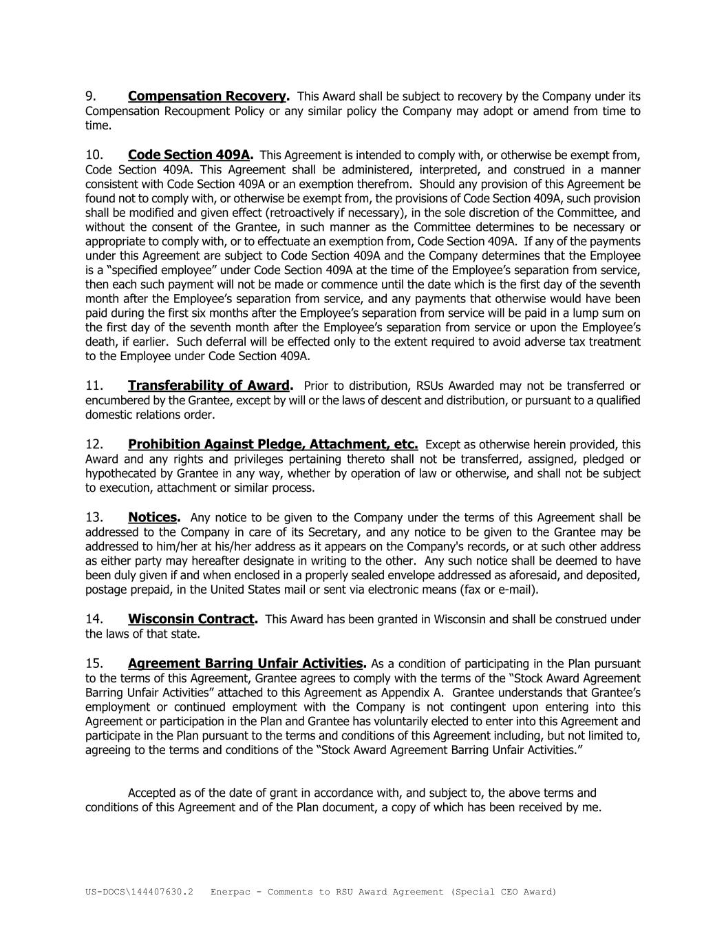 US-DOCS\144407630.2 Enerpac - Comments to RSU Award Agreement (Special CEO Award) 9. Compensation Recovery. This Award shall be subject to recovery by the Company under its Compensation Recoupment Policy or any similar policy the Company may adopt or amend from time to time. 10. Code Section 409A. This Agreement is intended to comply with, or otherwise be exempt from, Code Section 409A. This Agreement shall be administered, interpreted, and construed in a manner consistent with Code Section 409A or an exemption therefrom. Should any provision of this Agreement be found not to comply with, or otherwise be exempt from, the provisions of Code Section 409A, such provision shall be modified and given effect (retroactively if necessary), in the sole discretion of the Committee, and without the consent of the Grantee, in such manner as the Committee determines to be necessary or appropriate to comply with, or to effectuate an exemption from, Code Section 409A. If any of the payments under this Agreement are subject to Code Section 409A and the Company determines that the Employee is a “specified employee” under Code Section 409A at the time of the Employee’s separation from service, then each such payment will not be made or commence until the date which is the first day of the seventh month after the Employee’s separation from service, and any payments that otherwise would have been paid during the first six months after the Employee’s separation from service will be paid in a lump sum on the first day of the seventh month after the Employee’s separation from service or upon the Employee’s death, if earlier. Such deferral will be effected only to the extent required to avoid adverse tax treatment to the Employee under Code Section 409A. 11. Transferability of Award. Prior to distribution, RSUs Awarded may not be transferred or encumbered by the Grantee, except by will or the laws of descent and distribution, or pursuant to a qualified domestic relations order. 12. Prohibition Against Pledge, Attachment, etc. Except as otherwise herein provided, this Award and any rights and privileges pertaining thereto shall not be transferred, assigned, pledged or hypothecated by Grantee in any way, whether by operation of law or otherwise, and shall not be subject to execution, attachment or similar process. 13. Notices. Any notice to be given to the Company under the terms of this Agreement shall be addressed to the Company in care of its Secretary, and any notice to be given to the Grantee may be addressed to him/her at his/her address as it appears on the Company's records, or at such other address as either party may hereafter designate in writing to the other. Any such notice shall be deemed to have been duly given if and when enclosed in a properly sealed envelope addressed as aforesaid, and deposited, postage prepaid, in the United States mail or sent via electronic means (fax or e-mail). 14. Wisconsin Contract. This Award has been granted in Wisconsin and shall be construed under the laws of that state. 15. Agreement Barring Unfair Activities. As a condition of participating in the Plan pursuant to the terms of this Agreement, Grantee agrees to comply with the terms of the “Stock Award Agreement Barring Unfair Activities” attached to this Agreement as Appendix A. Grantee understands that Grantee’s employment or continued employment with the Company is not contingent upon entering into this Agreement or participation in the Plan and Grantee has voluntarily elected to enter into this Agreement and participate in the Plan pursuant to the terms and conditions of this Agreement including, but not limited to, agreeing to the terms and conditions of the “Stock Award Agreement Barring Unfair Activities.” Accepted as of the date of grant in accordance with, and subject to, the above terms and conditions of this Agreement and of the Plan document, a copy of which has been received by me.