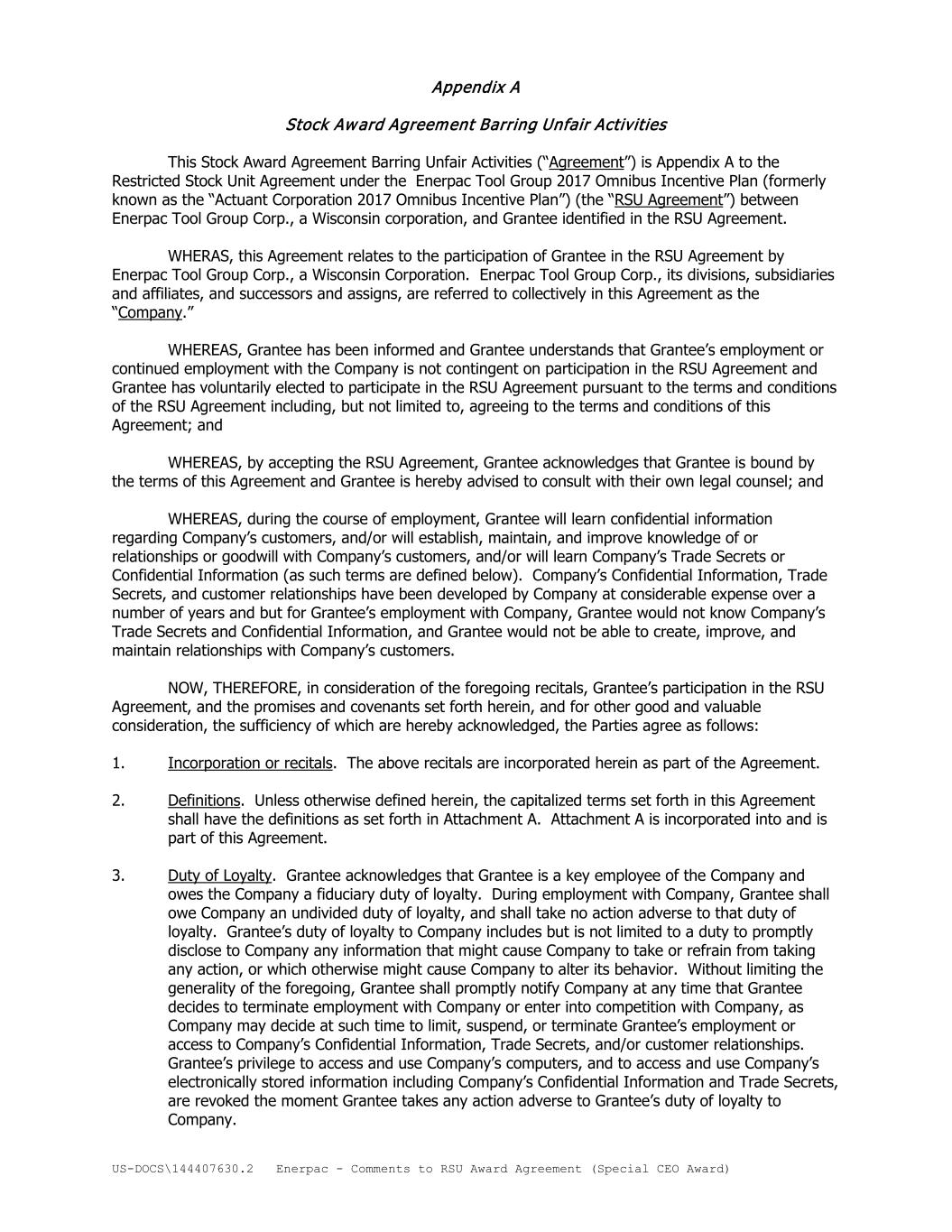 US-DOCS\144407630.2 Enerpac - Comments to RSU Award Agreement (Special CEO Award) Appendix A Stock Award Agreement Barring Unfair Activities This Stock Award Agreement Barring Unfair Activities (“Agreement”) is Appendix A to the Restricted Stock Unit Agreement under the Enerpac Tool Group 2017 Omnibus Incentive Plan (formerly known as the “Actuant Corporation 2017 Omnibus Incentive Plan”) (the “RSU Agreement”) between Enerpac Tool Group Corp., a Wisconsin corporation, and Grantee identified in the RSU Agreement. WHERAS, this Agreement relates to the participation of Grantee in the RSU Agreement by Enerpac Tool Group Corp., a Wisconsin Corporation. Enerpac Tool Group Corp., its divisions, subsidiaries and affiliates, and successors and assigns, are referred to collectively in this Agreement as the “Company.” WHEREAS, Grantee has been informed and Grantee understands that Grantee’s employment or continued employment with the Company is not contingent on participation in the RSU Agreement and Grantee has voluntarily elected to participate in the RSU Agreement pursuant to the terms and conditions of the RSU Agreement including, but not limited to, agreeing to the terms and conditions of this Agreement; and WHEREAS, by accepting the RSU Agreement, Grantee acknowledges that Grantee is bound by the terms of this Agreement and Grantee is hereby advised to consult with their own legal counsel; and WHEREAS, during the course of employment, Grantee will learn confidential information regarding Company’s customers, and/or will establish, maintain, and improve knowledge of or relationships or goodwill with Company’s customers, and/or will learn Company’s Trade Secrets or Confidential Information (as such terms are defined below). Company’s Confidential Information, Trade Secrets, and customer relationships have been developed by Company at considerable expense over a number of years and but for Grantee’s employment with Company, Grantee would not know Company’s Trade Secrets and Confidential Information, and Grantee would not be able to create, improve, and maintain relationships with Company’s customers. NOW, THEREFORE, in consideration of the foregoing recitals, Grantee’s participation in the RSU Agreement, and the promises and covenants set forth herein, and for other good and valuable consideration, the sufficiency of which are hereby acknowledged, the Parties agree as follows: 1. Incorporation or recitals. The above recitals are incorporated herein as part of the Agreement. 2. Definitions. Unless otherwise defined herein, the capitalized terms set forth in this Agreement shall have the definitions as set forth in Attachment A. Attachment A is incorporated into and is part of this Agreement. 3. Duty of Loyalty. Grantee acknowledges that Grantee is a key employee of the Company and owes the Company a fiduciary duty of loyalty. During employment with Company, Grantee shall owe Company an undivided duty of loyalty, and shall take no action adverse to that duty of loyalty. Grantee’s duty of loyalty to Company includes but is not limited to a duty to promptly disclose to Company any information that might cause Company to take or refrain from taking any action, or which otherwise might cause Company to alter its behavior. Without limiting the generality of the foregoing, Grantee shall promptly notify Company at any time that Grantee decides to terminate employment with Company or enter into competition with Company, as Company may decide at such time to limit, suspend, or terminate Grantee’s employment or access to Company’s Confidential Information, Trade Secrets, and/or customer relationships. Grantee’s privilege to access and use Company’s computers, and to access and use Company’s electronically stored information including Company’s Confidential Information and Trade Secrets, are revoked the moment Grantee takes any action adverse to Grantee’s duty of loyalty to Company.