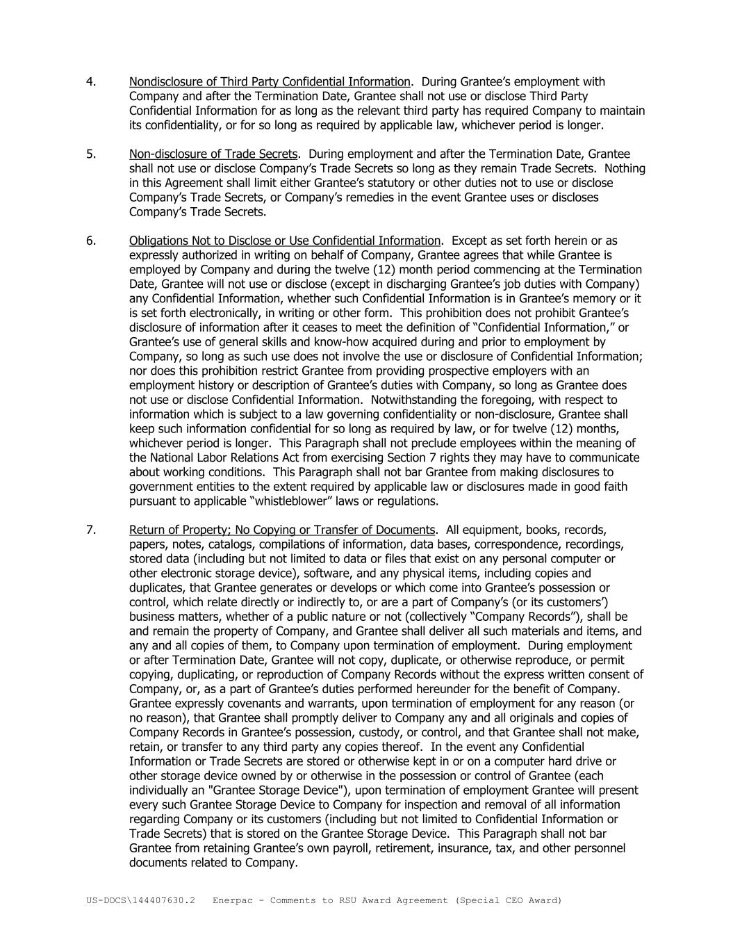 US-DOCS\144407630.2 Enerpac - Comments to RSU Award Agreement (Special CEO Award) 4. Nondisclosure of Third Party Confidential Information. During Grantee’s employment with Company and after the Termination Date, Grantee shall not use or disclose Third Party Confidential Information for as long as the relevant third party has required Company to maintain its confidentiality, or for so long as required by applicable law, whichever period is longer. 5. Non-disclosure of Trade Secrets. During employment and after the Termination Date, Grantee shall not use or disclose Company’s Trade Secrets so long as they remain Trade Secrets. Nothing in this Agreement shall limit either Grantee’s statutory or other duties not to use or disclose Company’s Trade Secrets, or Company’s remedies in the event Grantee uses or discloses Company’s Trade Secrets. 6. Obligations Not to Disclose or Use Confidential Information. Except as set forth herein or as expressly authorized in writing on behalf of Company, Grantee agrees that while Grantee is employed by Company and during the twelve (12) month period commencing at the Termination Date, Grantee will not use or disclose (except in discharging Grantee’s job duties with Company) any Confidential Information, whether such Confidential Information is in Grantee’s memory or it is set forth electronically, in writing or other form. This prohibition does not prohibit Grantee’s disclosure of information after it ceases to meet the definition of “Confidential Information,” or Grantee’s use of general skills and know-how acquired during and prior to employment by Company, so long as such use does not involve the use or disclosure of Confidential Information; nor does this prohibition restrict Grantee from providing prospective employers with an employment history or description of Grantee’s duties with Company, so long as Grantee does not use or disclose Confidential Information. Notwithstanding the foregoing, with respect to information which is subject to a law governing confidentiality or non-disclosure, Grantee shall keep such information confidential for so long as required by law, or for twelve (12) months, whichever period is longer. This Paragraph shall not preclude employees within the meaning of the National Labor Relations Act from exercising Section 7 rights they may have to communicate about working conditions. This Paragraph shall not bar Grantee from making disclosures to government entities to the extent required by applicable law or disclosures made in good faith pursuant to applicable “whistleblower” laws or regulations. 7. Return of Property; No Copying or Transfer of Documents. All equipment, books, records, papers, notes, catalogs, compilations of information, data bases, correspondence, recordings, stored data (including but not limited to data or files that exist on any personal computer or other electronic storage device), software, and any physical items, including copies and duplicates, that Grantee generates or develops or which come into Grantee’s possession or control, which relate directly or indirectly to, or are a part of Company’s (or its customers’) business matters, whether of a public nature or not (collectively “Company Records”), shall be and remain the property of Company, and Grantee shall deliver all such materials and items, and any and all copies of them, to Company upon termination of employment. During employment or after Termination Date, Grantee will not copy, duplicate, or otherwise reproduce, or permit copying, duplicating, or reproduction of Company Records without the express written consent of Company, or, as a part of Grantee’s duties performed hereunder for the benefit of Company. Grantee expressly covenants and warrants, upon termination of employment for any reason (or no reason), that Grantee shall promptly deliver to Company any and all originals and copies of Company Records in Grantee’s possession, custody, or control, and that Grantee shall not make, retain, or transfer to any third party any copies thereof. In the event any Confidential Information or Trade Secrets are stored or otherwise kept in or on a computer hard drive or other storage device owned by or otherwise in the possession or control of Grantee (each individually an "Grantee Storage Device"), upon termination of employment Grantee will present every such Grantee Storage Device to Company for inspection and removal of all information regarding Company or its customers (including but not limited to Confidential Information or Trade Secrets) that is stored on the Grantee Storage Device. This Paragraph shall not bar Grantee from retaining Grantee’s own payroll, retirement, insurance, tax, and other personnel documents related to Company.