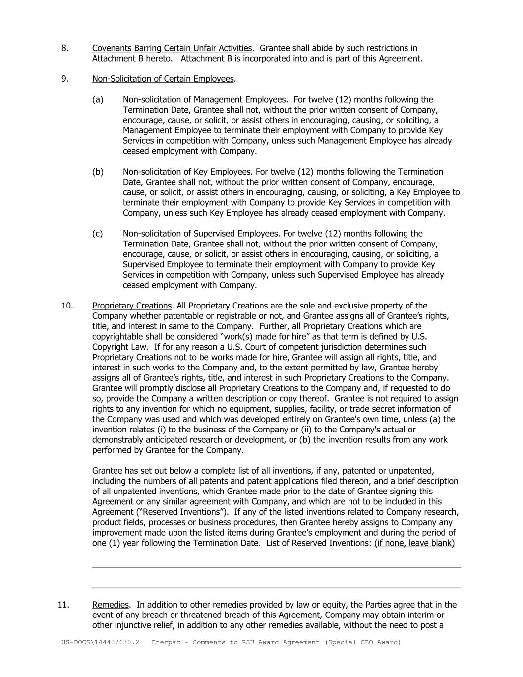 US-DOCS\144407630.2 Enerpac - Comments to RSU Award Agreement (Special CEO Award) 8. Covenants Barring Certain Unfair Activities. Grantee shall abide by such restrictions in Attachment B hereto. Attachment B is incorporated into and is part of this Agreement. 9. Non-Solicitation of Certain Employees. (a) Non-solicitation of Management Employees. For twelve (12) months following the Termination Date, Grantee shall not, without the prior written consent of Company, encourage, cause, or solicit, or assist others in encouraging, causing, or soliciting, a Management Employee to terminate their employment with Company to provide Key Services in competition with Company, unless such Management Employee has already ceased employment with Company. (b) Non-solicitation of Key Employees. For twelve (12) months following the Termination Date, Grantee shall not, without the prior written consent of Company, encourage, cause, or solicit, or assist others in encouraging, causing, or soliciting, a Key Employee to terminate their employment with Company to provide Key Services in competition with Company, unless such Key Employee has already ceased employment with Company. (c) Non-solicitation of Supervised Employees. For twelve (12) months following the Termination Date, Grantee shall not, without the prior written consent of Company, encourage, cause, or solicit, or assist others in encouraging, causing, or soliciting, a Supervised Employee to terminate their employment with Company to provide Key Services in competition with Company, unless such Supervised Employee has already ceased employment with Company. 10. Proprietary Creations. All Proprietary Creations are the sole and exclusive property of the Company whether patentable or registrable or not, and Grantee assigns all of Grantee’s rights, title, and interest in same to the Company. Further, all Proprietary Creations which are copyrightable shall be considered “work(s) made for hire” as that term is defined by U.S. Copyright Law. If for any reason a U.S. Court of competent jurisdiction determines such Proprietary Creations not to be works made for hire, Grantee will assign all rights, title, and interest in such works to the Company and, to the extent permitted by law, Grantee hereby assigns all of Grantee’s rights, title, and interest in such Proprietary Creations to the Company. Grantee will promptly disclose all Proprietary Creations to the Company and, if requested to do so, provide the Company a written description or copy thereof. Grantee is not required to assign rights to any invention for which no equipment, supplies, facility, or trade secret information of the Company was used and which was developed entirely on Grantee's own time, unless (a) the invention relates (i) to the business of the Company or (ii) to the Company's actual or demonstrably anticipated research or development, or (b) the invention results from any work performed by Grantee for the Company. Grantee has set out below a complete list of all inventions, if any, patented or unpatented, including the numbers of all patents and patent applications filed thereon, and a brief description of all unpatented inventions, which Grantee made prior to the date of Grantee signing this Agreement or any similar agreement with Company, and which are not to be included in this Agreement (“Reserved Inventions”). If any of the listed inventions related to Company research, product fields, processes or business procedures, then Grantee hereby assigns to Company any improvement made upon the listed items during Grantee’s employment and during the period of one (1) year following the Termination Date. List of Reserved Inventions: (if none, leave blank) _______________________________________________________________________________ _______________________________________________________________________________ 11. Remedies. In addition to other remedies provided by law or equity, the Parties agree that in the event of any breach or threatened breach of this Agreement, Company may obtain interim or other injunctive relief, in addition to any other remedies available, without the need to post a