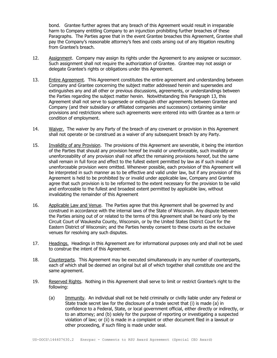 US-DOCS\144407630.2 Enerpac - Comments to RSU Award Agreement (Special CEO Award) bond. Grantee further agrees that any breach of this Agreement would result in irreparable harm to Company entitling Company to an injunction prohibiting further breaches of these Paragraphs. The Parties agree that in the event Grantee breaches this Agreement, Grantee shall pay the Company’s reasonable attorney’s fees and costs arising out of any litigation resulting from Grantee’s breach. 12. Assignment. Company may assign its rights under the Agreement to any assignee or successor. Such assignment shall not require the authorization of Grantee. Grantee may not assign or delegate Grantee’s rights or obligations under this Agreement. 13. Entire Agreement. This Agreement constitutes the entire agreement and understanding between Company and Grantee concerning the subject matter addressed herein and supersedes and extinguishes any and all other or previous discussions, agreements, or understandings between the Parties regarding the subject matter herein. Notwithstanding this Paragraph 13, this Agreement shall not serve to supersede or extinguish other agreements between Grantee and Company (and their subsidiary or affiliated companies and successors) containing similar provisions and restrictions where such agreements were entered into with Grantee as a term or condition of employment. 14. Waiver. The waiver by any Party of the breach of any covenant or provision in this Agreement shall not operate or be construed as a waiver of any subsequent breach by any Party. 15. Invalidity of any Provision. The provisions of this Agreement are severable, it being the intention of the Parties that should any provision hereof be invalid or unenforceable, such invalidity or unenforceability of any provision shall not affect the remaining provisions hereof, but the same shall remain in full force and effect to the fullest extent permitted by law as if such invalid or unenforceable provision were omitted. Whenever possible, each provision of this Agreement will be interpreted in such manner as to be effective and valid under law, but if any provision of this Agreement is held to be prohibited by or invalid under applicable law, Company and Grantee agree that such provision is to be reformed to the extent necessary for the provision to be valid and enforceable to the fullest and broadest extent permitted by applicable law, without invalidating the remainder of this Agreement 16. Applicable Law and Venue. The Parties agree that this Agreement shall be governed by and construed in accordance with the internal laws of the State of Wisconsin. Any dispute between the Parties arising out of or related to the terms of this Agreement shall be heard only by the Circuit Court of Waukesha County, Wisconsin, or by the United States District Court for the Eastern District of Wisconsin; and the Parties hereby consent to these courts as the exclusive venues for resolving any such disputes. 17. Headings. Headings in this Agreement are for informational purposes only and shall not be used to construe the intent of this Agreement. 18. Counterparts. This Agreement may be executed simultaneously in any number of counterparts, each of which shall be deemed an original but all of which together shall constitute one and the same agreement. 19. Reserved Rights. Nothing in this Agreement shall serve to limit or restrict Grantee’s right to the following: (a) Immunity. An individual shall not be held criminally or civilly liable under any Federal or State trade secret law for the disclosure of a trade secret that (i) is made (a) in confidence to a Federal, State, or local government official, either directly or indirectly, or to an attorney; and (b) solely for the purpose of reporting or investigating a suspected violation of law; or (ii) is made in a complaint or other document filed in a lawsuit or other proceeding, if such filing is made under seal.