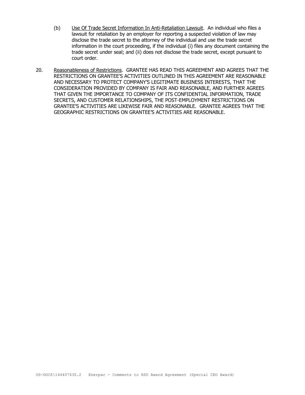 US-DOCS\144407630.2 Enerpac - Comments to RSU Award Agreement (Special CEO Award) (b) Use Of Trade Secret Information In Anti-Retaliation Lawsuit. An individual who files a lawsuit for retaliation by an employer for reporting a suspected violation of law may disclose the trade secret to the attorney of the individual and use the trade secret information in the court proceeding, if the individual (i) files any document containing the trade secret under seal; and (ii) does not disclose the trade secret, except pursuant to court order. 20. Reasonableness of Restrictions. GRANTEE HAS READ THIS AGREEMENT AND AGREES THAT THE RESTRICTIONS ON GRANTEE’S ACTIVITIES OUTLINED IN THIS AGREEMENT ARE REASONABLE AND NECESSARY TO PROTECT COMPANY’S LEGITIMATE BUSINESS INTERESTS, THAT THE CONSIDERATION PROVIDED BY COMPANY IS FAIR AND REASONABLE, AND FURTHER AGREES THAT GIVEN THE IMPORTANCE TO COMPANY OF ITS CONFIDENTIAL INFORMATION, TRADE SECRETS, AND CUSTOMER RELATIONSHIPS, THE POST-EMPLOYMENT RESTRICTIONS ON GRANTEE’S ACTIVITIES ARE LIKEWISE FAIR AND REASONABLE. GRANTEE AGREES THAT THE GEOGRAPHIC RESTRICTIONS ON GRANTEE’S ACTIVITIES ARE REASONABLE.