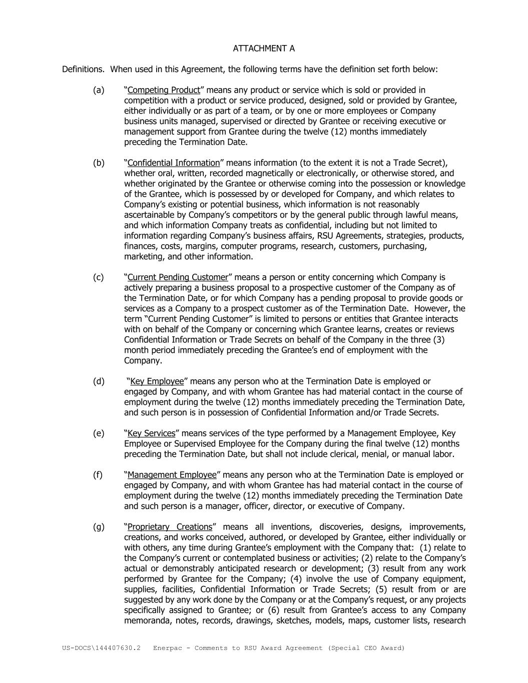 US-DOCS\144407630.2 Enerpac - Comments to RSU Award Agreement (Special CEO Award) ATTACHMENT A Definitions. When used in this Agreement, the following terms have the definition set forth below: (a) “Competing Product” means any product or service which is sold or provided in competition with a product or service produced, designed, sold or provided by Grantee, either individually or as part of a team, or by one or more employees or Company business units managed, supervised or directed by Grantee or receiving executive or management support from Grantee during the twelve (12) months immediately preceding the Termination Date. (b) “Confidential Information” means information (to the extent it is not a Trade Secret), whether oral, written, recorded magnetically or electronically, or otherwise stored, and whether originated by the Grantee or otherwise coming into the possession or knowledge of the Grantee, which is possessed by or developed for Company, and which relates to Company’s existing or potential business, which information is not reasonably ascertainable by Company’s competitors or by the general public through lawful means, and which information Company treats as confidential, including but not limited to information regarding Company’s business affairs, RSU Agreements, strategies, products, finances, costs, margins, computer programs, research, customers, purchasing, marketing, and other information. (c) “Current Pending Customer” means a person or entity concerning which Company is actively preparing a business proposal to a prospective customer of the Company as of the Termination Date, or for which Company has a pending proposal to provide goods or services as a Company to a prospect customer as of the Termination Date. However, the term “Current Pending Customer” is limited to persons or entities that Grantee interacts with on behalf of the Company or concerning which Grantee learns, creates or reviews Confidential Information or Trade Secrets on behalf of the Company in the three (3) month period immediately preceding the Grantee’s end of employment with the Company. (d) “Key Employee” means any person who at the Termination Date is employed or engaged by Company, and with whom Grantee has had material contact in the course of employment during the twelve (12) months immediately preceding the Termination Date, and such person is in possession of Confidential Information and/or Trade Secrets. (e) “Key Services” means services of the type performed by a Management Employee, Key Employee or Supervised Employee for the Company during the final twelve (12) months preceding the Termination Date, but shall not include clerical, menial, or manual labor. (f) “Management Employee” means any person who at the Termination Date is employed or engaged by Company, and with whom Grantee has had material contact in the course of employment during the twelve (12) months immediately preceding the Termination Date and such person is a manager, officer, director, or executive of Company. (g) “Proprietary Creations” means all inventions, discoveries, designs, improvements, creations, and works conceived, authored, or developed by Grantee, either individually or with others, any time during Grantee’s employment with the Company that: (1) relate to the Company’s current or contemplated business or activities; (2) relate to the Company’s actual or demonstrably anticipated research or development; (3) result from any work performed by Grantee for the Company; (4) involve the use of Company equipment, supplies, facilities, Confidential Information or Trade Secrets; (5) result from or are suggested by any work done by the Company or at the Company’s request, or any projects specifically assigned to Grantee; or (6) result from Grantee’s access to any Company memoranda, notes, records, drawings, sketches, models, maps, customer lists, research