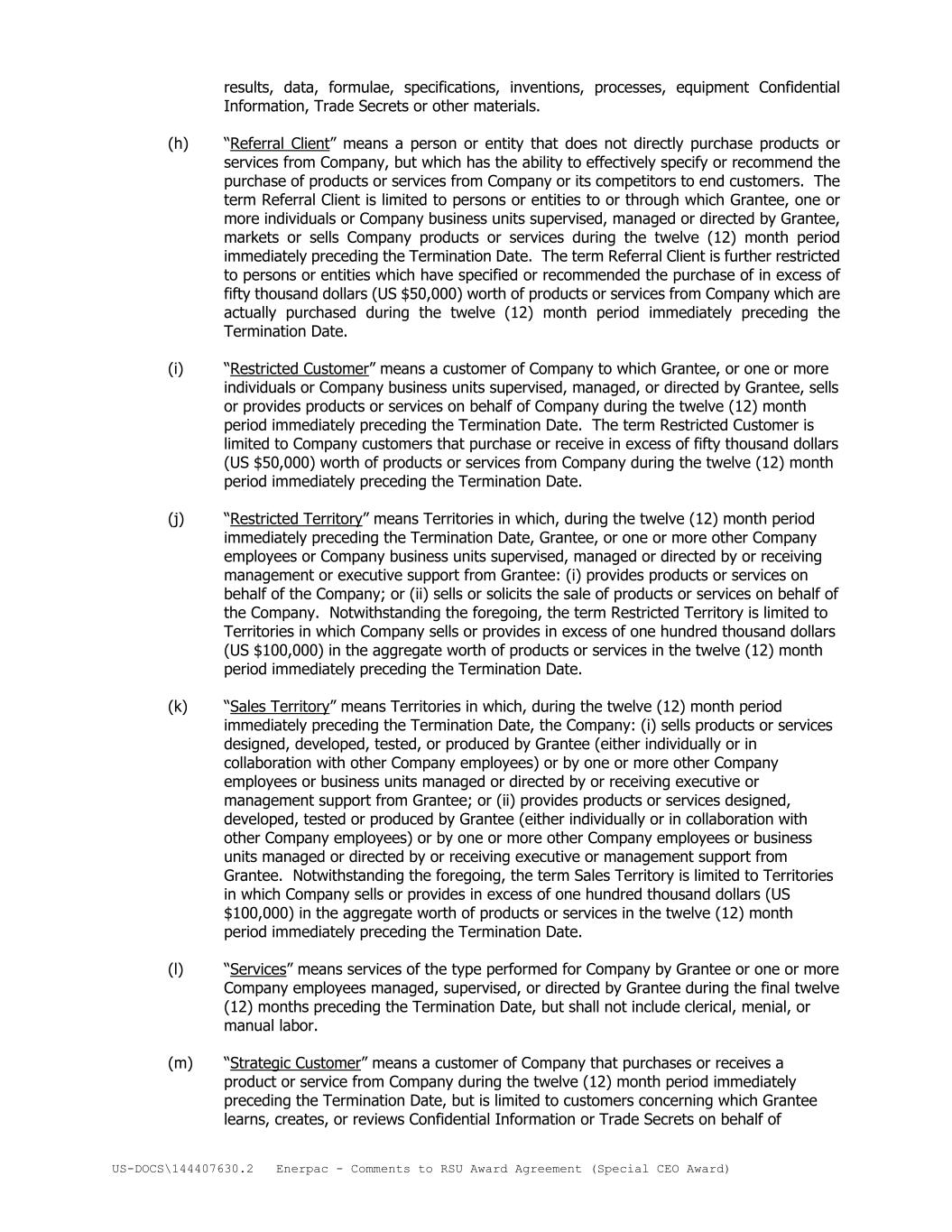 US-DOCS\144407630.2 Enerpac - Comments to RSU Award Agreement (Special CEO Award) results, data, formulae, specifications, inventions, processes, equipment Confidential Information, Trade Secrets or other materials. (h) “Referral Client” means a person or entity that does not directly purchase products or services from Company, but which has the ability to effectively specify or recommend the purchase of products or services from Company or its competitors to end customers. The term Referral Client is limited to persons or entities to or through which Grantee, one or more individuals or Company business units supervised, managed or directed by Grantee, markets or sells Company products or services during the twelve (12) month period immediately preceding the Termination Date. The term Referral Client is further restricted to persons or entities which have specified or recommended the purchase of in excess of fifty thousand dollars (US $50,000) worth of products or services from Company which are actually purchased during the twelve (12) month period immediately preceding the Termination Date. (i) “Restricted Customer” means a customer of Company to which Grantee, or one or more individuals or Company business units supervised, managed, or directed by Grantee, sells or provides products or services on behalf of Company during the twelve (12) month period immediately preceding the Termination Date. The term Restricted Customer is limited to Company customers that purchase or receive in excess of fifty thousand dollars (US $50,000) worth of products or services from Company during the twelve (12) month period immediately preceding the Termination Date. (j) “Restricted Territory” means Territories in which, during the twelve (12) month period immediately preceding the Termination Date, Grantee, or one or more other Company employees or Company business units supervised, managed or directed by or receiving management or executive support from Grantee: (i) provides products or services on behalf of the Company; or (ii) sells or solicits the sale of products or services on behalf of the Company. Notwithstanding the foregoing, the term Restricted Territory is limited to Territories in which Company sells or provides in excess of one hundred thousand dollars (US $100,000) in the aggregate worth of products or services in the twelve (12) month period immediately preceding the Termination Date. (k) “Sales Territory” means Territories in which, during the twelve (12) month period immediately preceding the Termination Date, the Company: (i) sells products or services designed, developed, tested, or produced by Grantee (either individually or in collaboration with other Company employees) or by one or more other Company employees or business units managed or directed by or receiving executive or management support from Grantee; or (ii) provides products or services designed, developed, tested or produced by Grantee (either individually or in collaboration with other Company employees) or by one or more other Company employees or business units managed or directed by or receiving executive or management support from Grantee. Notwithstanding the foregoing, the term Sales Territory is limited to Territories in which Company sells or provides in excess of one hundred thousand dollars (US $100,000) in the aggregate worth of products or services in the twelve (12) month period immediately preceding the Termination Date. (l) “Services” means services of the type performed for Company by Grantee or one or more Company employees managed, supervised, or directed by Grantee during the final twelve (12) months preceding the Termination Date, but shall not include clerical, menial, or manual labor. (m) “Strategic Customer” means a customer of Company that purchases or receives a product or service from Company during the twelve (12) month period immediately preceding the Termination Date, but is limited to customers concerning which Grantee learns, creates, or reviews Confidential Information or Trade Secrets on behalf of
