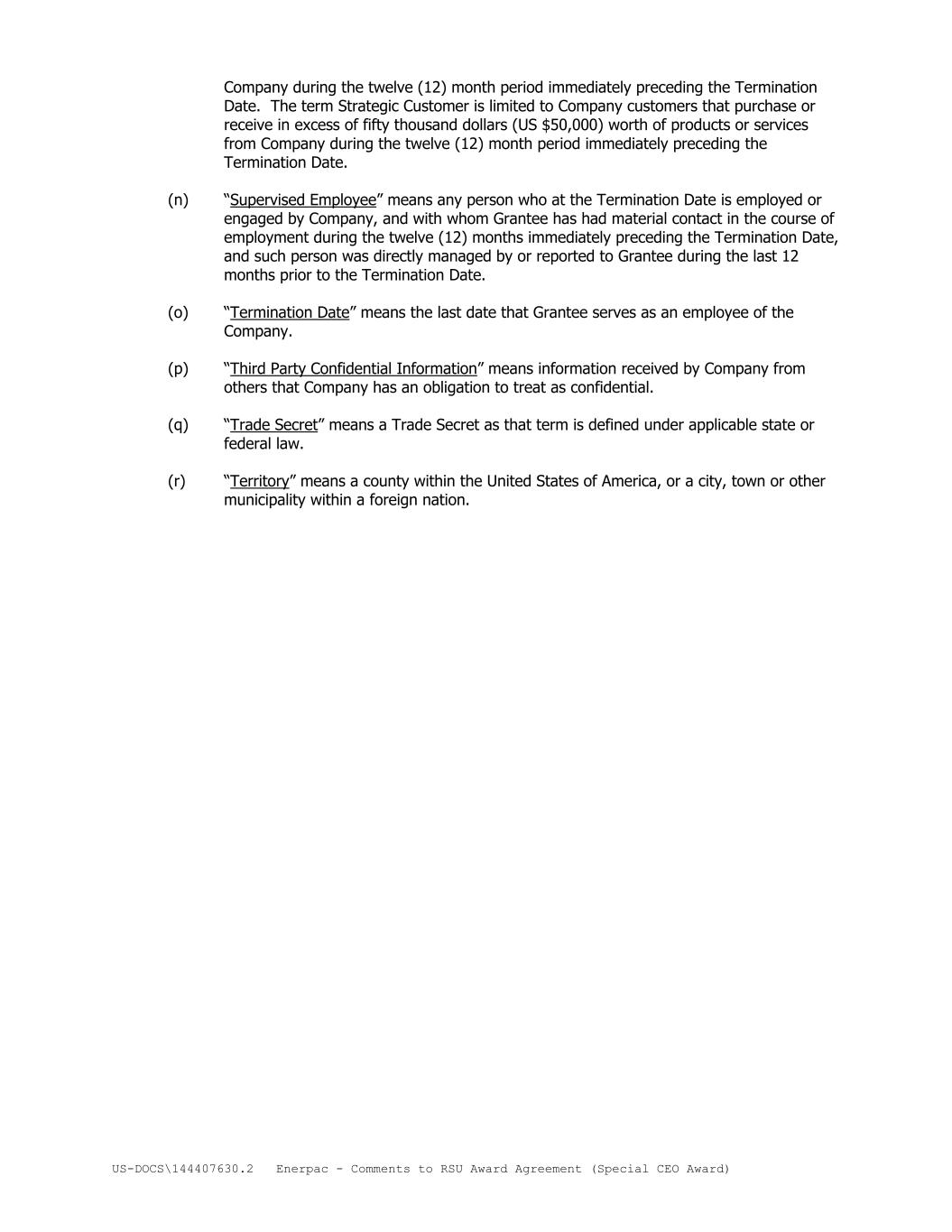 US-DOCS\144407630.2 Enerpac - Comments to RSU Award Agreement (Special CEO Award) Company during the twelve (12) month period immediately preceding the Termination Date. The term Strategic Customer is limited to Company customers that purchase or receive in excess of fifty thousand dollars (US $50,000) worth of products or services from Company during the twelve (12) month period immediately preceding the Termination Date. (n) “Supervised Employee” means any person who at the Termination Date is employed or engaged by Company, and with whom Grantee has had material contact in the course of employment during the twelve (12) months immediately preceding the Termination Date, and such person was directly managed by or reported to Grantee during the last 12 months prior to the Termination Date. (o) “Termination Date” means the last date that Grantee serves as an employee of the Company. (p) “Third Party Confidential Information” means information received by Company from others that Company has an obligation to treat as confidential. (q) “Trade Secret” means a Trade Secret as that term is defined under applicable state or federal law. (r) “Territory” means a county within the United States of America, or a city, town or other municipality within a foreign nation.