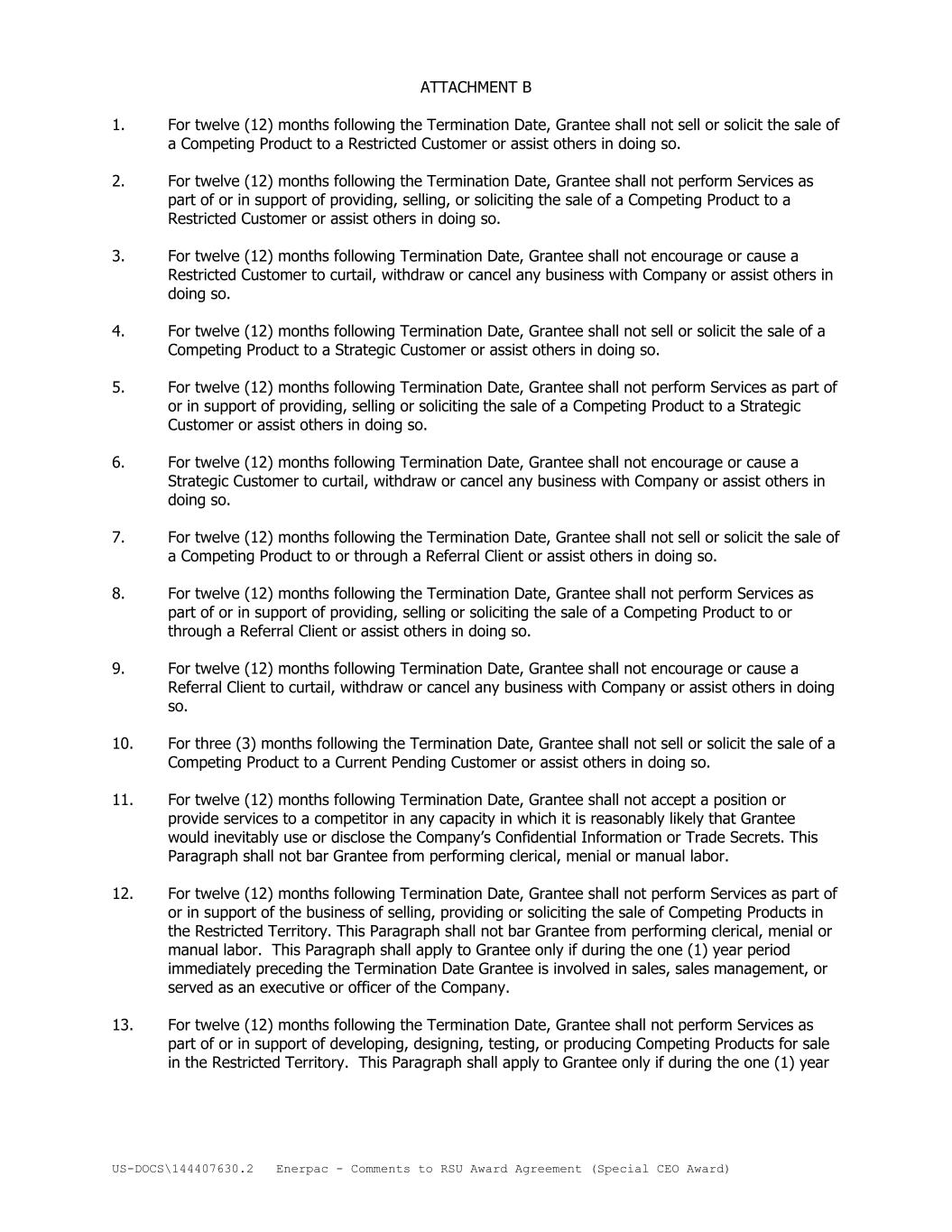 US-DOCS\144407630.2 Enerpac - Comments to RSU Award Agreement (Special CEO Award) ATTACHMENT B 1. For twelve (12) months following the Termination Date, Grantee shall not sell or solicit the sale of a Competing Product to a Restricted Customer or assist others in doing so. 2. For twelve (12) months following the Termination Date, Grantee shall not perform Services as part of or in support of providing, selling, or soliciting the sale of a Competing Product to a Restricted Customer or assist others in doing so. 3. For twelve (12) months following Termination Date, Grantee shall not encourage or cause a Restricted Customer to curtail, withdraw or cancel any business with Company or assist others in doing so. 4. For twelve (12) months following Termination Date, Grantee shall not sell or solicit the sale of a Competing Product to a Strategic Customer or assist others in doing so. 5. For twelve (12) months following Termination Date, Grantee shall not perform Services as part of or in support of providing, selling or soliciting the sale of a Competing Product to a Strategic Customer or assist others in doing so. 6. For twelve (12) months following Termination Date, Grantee shall not encourage or cause a Strategic Customer to curtail, withdraw or cancel any business with Company or assist others in doing so. 7. For twelve (12) months following the Termination Date, Grantee shall not sell or solicit the sale of a Competing Product to or through a Referral Client or assist others in doing so. 8. For twelve (12) months following the Termination Date, Grantee shall not perform Services as part of or in support of providing, selling or soliciting the sale of a Competing Product to or through a Referral Client or assist others in doing so. 9. For twelve (12) months following Termination Date, Grantee shall not encourage or cause a Referral Client to curtail, withdraw or cancel any business with Company or assist others in doing so. 10. For three (3) months following the Termination Date, Grantee shall not sell or solicit the sale of a Competing Product to a Current Pending Customer or assist others in doing so. 11. For twelve (12) months following Termination Date, Grantee shall not accept a position or provide services to a competitor in any capacity in which it is reasonably likely that Grantee would inevitably use or disclose the Company’s Confidential Information or Trade Secrets. This Paragraph shall not bar Grantee from performing clerical, menial or manual labor. 12. For twelve (12) months following Termination Date, Grantee shall not perform Services as part of or in support of the business of selling, providing or soliciting the sale of Competing Products in the Restricted Territory. This Paragraph shall not bar Grantee from performing clerical, menial or manual labor. This Paragraph shall apply to Grantee only if during the one (1) year period immediately preceding the Termination Date Grantee is involved in sales, sales management, or served as an executive or officer of the Company. 13. For twelve (12) months following the Termination Date, Grantee shall not perform Services as part of or in support of developing, designing, testing, or producing Competing Products for sale in the Restricted Territory. This Paragraph shall apply to Grantee only if during the one (1) year