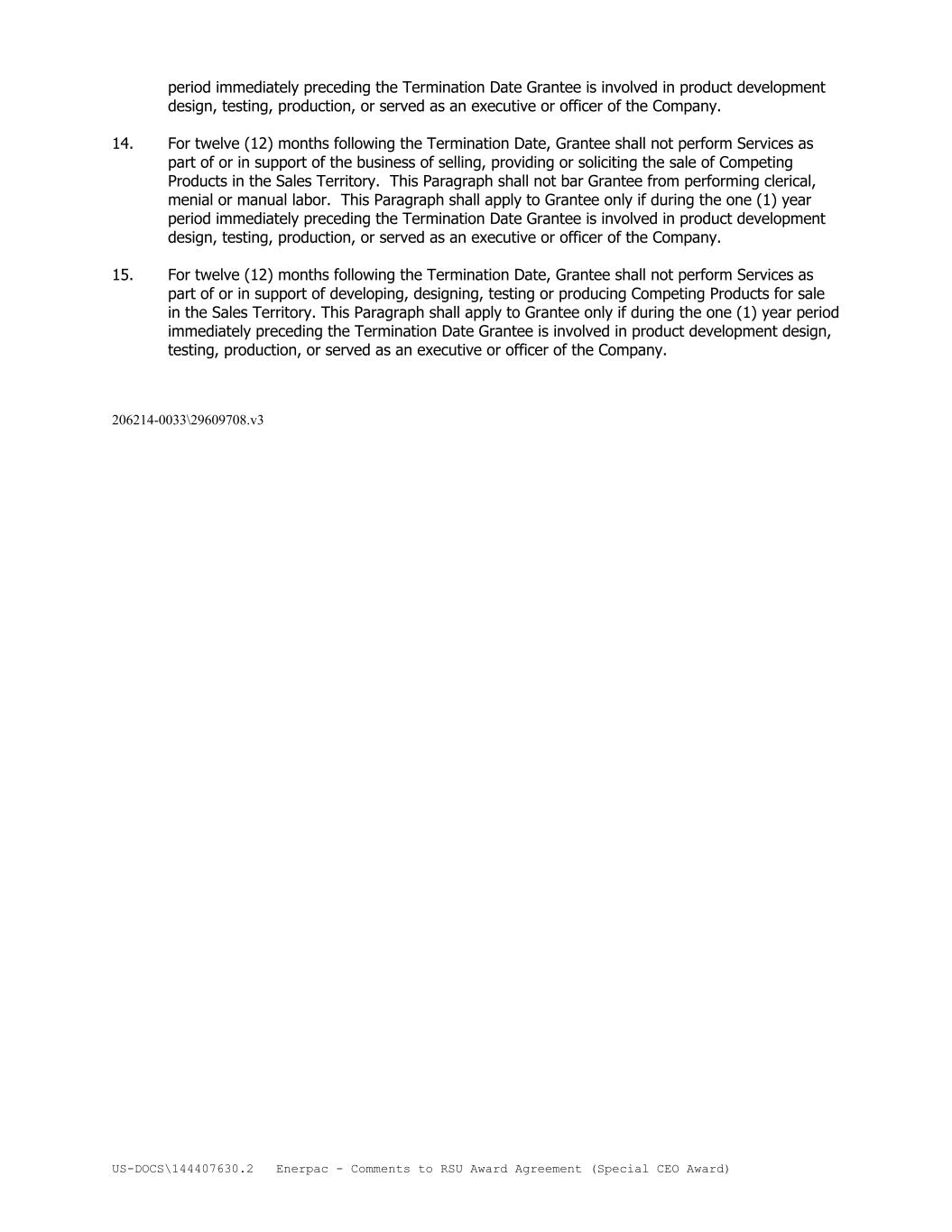 US-DOCS\144407630.2 Enerpac - Comments to RSU Award Agreement (Special CEO Award) period immediately preceding the Termination Date Grantee is involved in product development design, testing, production, or served as an executive or officer of the Company. 14. For twelve (12) months following the Termination Date, Grantee shall not perform Services as part of or in support of the business of selling, providing or soliciting the sale of Competing Products in the Sales Territory. This Paragraph shall not bar Grantee from performing clerical, menial or manual labor. This Paragraph shall apply to Grantee only if during the one (1) year period immediately preceding the Termination Date Grantee is involved in product development design, testing, production, or served as an executive or officer of the Company. 15. For twelve (12) months following the Termination Date, Grantee shall not perform Services as part of or in support of developing, designing, testing or producing Competing Products for sale in the Sales Territory. This Paragraph shall apply to Grantee only if during the one (1) year period immediately preceding the Termination Date Grantee is involved in product development design, testing, production, or served as an executive or officer of the Company. 206214-0033\29609708.v3