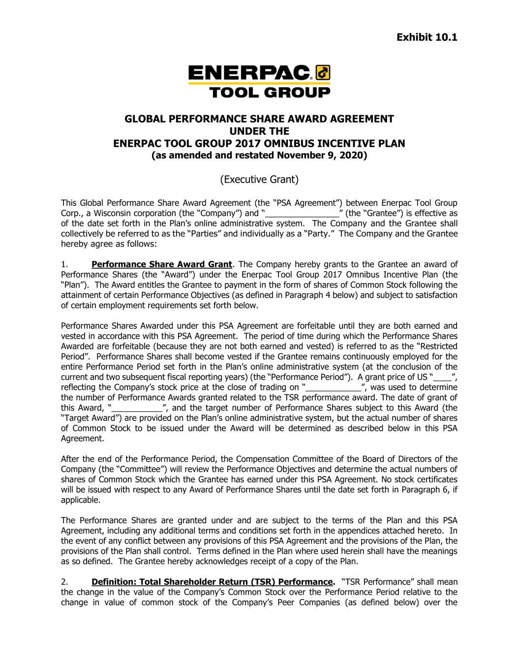 Exhibit 10.1 GLOBAL PERFORMANCE SHARE AWARD AGREEMENT UNDER THE ENERPAC TOOL GROUP 2017 OMNIBUS INCENTIVE PLAN (as amended and restated November 9, 2020) (Executive Grant) This Global Performance Share Award Agreement (the “PSA Agreement”) between Enerpac Tool Group Corp., a Wisconsin corporation (the “Company”) and “________________” (the “Grantee”) is effective as of the date set forth in the Plan’s online administrative system. The Company and the Grantee shall collectively be referred to as the “Parties” and individually as a “Party.” The Company and the Grantee hereby agree as follows: 1. Performance Share Award Grant. The Company hereby grants to the Grantee an award of Performance Shares (the “Award”) under the Enerpac Tool Group 2017 Omnibus Incentive Plan (the “Plan”). The Award entitles the Grantee to payment in the form of shares of Common Stock following the attainment of certain Performance Objectives (as defined in Paragraph 4 below) and subject to satisfaction of certain employment requirements set forth below. Performance Shares Awarded under this PSA Agreement are forfeitable until they are both earned and vested in accordance with this PSA Agreement. The period of time during which the Performance Shares Awarded are forfeitable (because they are not both earned and vested) is referred to as the “Restricted Period”. Performance Shares shall become vested if the Grantee remains continuously employed for the entire Performance Period set forth in the Plan’s online administrative system (at the conclusion of the current and two subsequent fiscal reporting years) (the “Performance Period”). A grant price of US “____”, reflecting the Company’s stock price at the close of trading on “____________”, was used to determine the number of Performance Awards granted related to the TSR performance award. The date of grant of this Award, “___________”, and the target number of Performance Shares subject to this Award (the “Target Award”) are provided on the Plan’s online administrative system, but the actual number of shares of Common Stock to be issued under the Award will be determined as described below in this PSA Agreement. After the end of the Performance Period, the Compensation Committee of the Board of Directors of the Company (the “Committee”) will review the Performance Objectives and determine the actual numbers of shares of Common Stock which the Grantee has earned under this PSA Agreement. No stock certificates will be issued with respect to any Award of Performance Shares until the date set forth in Paragraph 6, if applicable. The Performance Shares are granted under and are subject to the terms of the Plan and this PSA Agreement, including any additional terms and conditions set forth in the appendices attached hereto. In the event of any conflict between any provisions of this PSA Agreement and the provisions of the Plan, the provisions of the Plan shall control. Terms defined in the Plan where used herein shall have the meanings as so defined. The Grantee hereby acknowledges receipt of a copy of the Plan. 2. Definition: Total Shareholder Return (TSR) Performance. “TSR Performance” shall mean the change in the value of the Company’s Common Stock over the Performance Period relative to the change in value of common stock of the Company’s Peer Companies (as defined below) over the