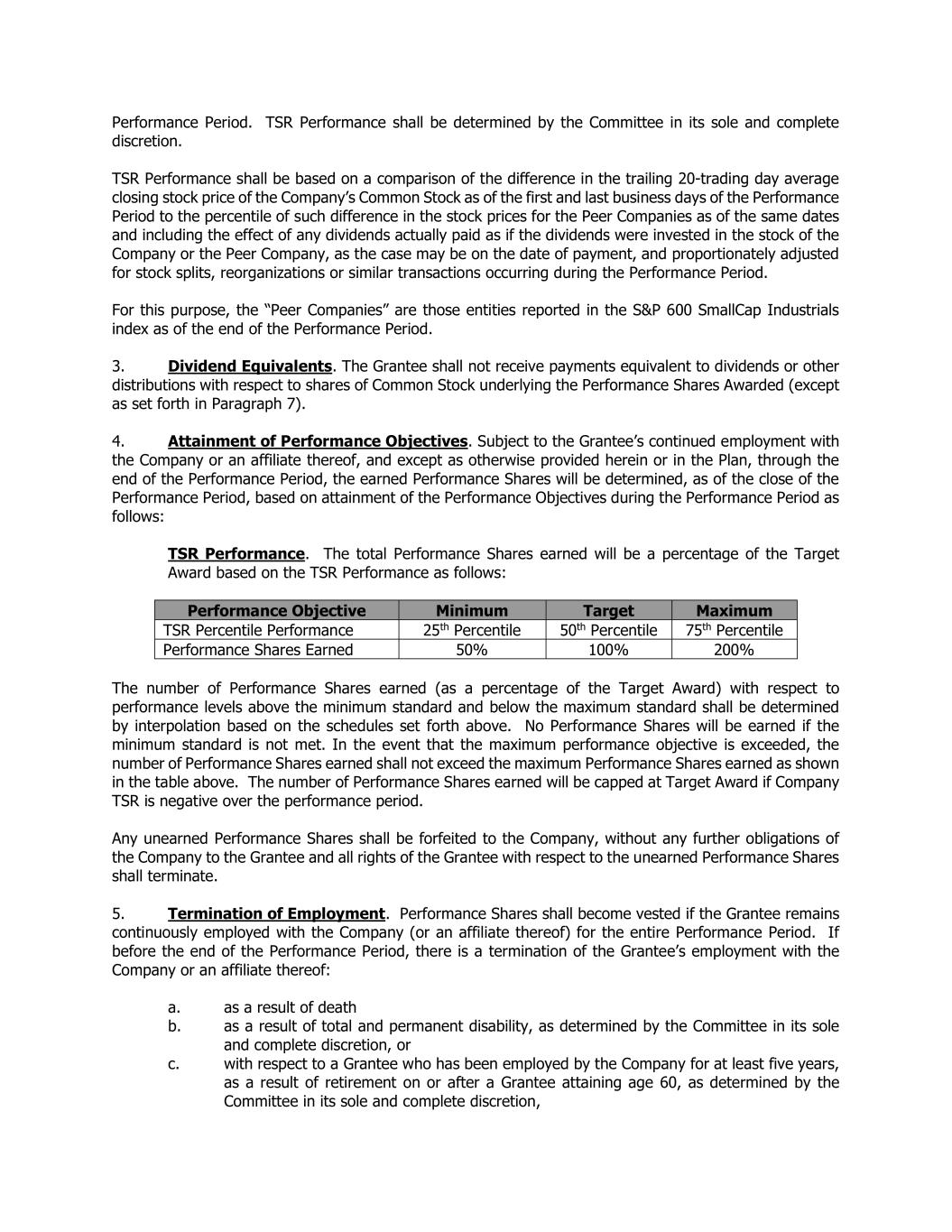 Performance Period. TSR Performance shall be determined by the Committee in its sole and complete discretion. TSR Performance shall be based on a comparison of the difference in the trailing 20-trading day average closing stock price of the Company’s Common Stock as of the first and last business days of the Performance Period to the percentile of such difference in the stock prices for the Peer Companies as of the same dates and including the effect of any dividends actually paid as if the dividends were invested in the stock of the Company or the Peer Company, as the case may be on the date of payment, and proportionately adjusted for stock splits, reorganizations or similar transactions occurring during the Performance Period. For this purpose, the “Peer Companies” are those entities reported in the S&P 600 SmallCap Industrials index as of the end of the Performance Period. 3. Dividend Equivalents. The Grantee shall not receive payments equivalent to dividends or other distributions with respect to shares of Common Stock underlying the Performance Shares Awarded (except as set forth in Paragraph 7). 4. Attainment of Performance Objectives. Subject to the Grantee’s continued employment with the Company or an affiliate thereof, and except as otherwise provided herein or in the Plan, through the end of the Performance Period, the earned Performance Shares will be determined, as of the close of the Performance Period, based on attainment of the Performance Objectives during the Performance Period as follows: TSR Performance. The total Performance Shares earned will be a percentage of the Target Award based on the TSR Performance as follows: Performance Objective Minimum Target Maximum TSR Percentile Performance 25th Percentile 50th Percentile 75th Percentile Performance Shares Earned 50% 100% 200% The number of Performance Shares earned (as a percentage of the Target Award) with respect to performance levels above the minimum standard and below the maximum standard shall be determined by interpolation based on the schedules set forth above. No Performance Shares will be earned if the minimum standard is not met. In the event that the maximum performance objective is exceeded, the number of Performance Shares earned shall not exceed the maximum Performance Shares earned as shown in the table above. The number of Performance Shares earned will be capped at Target Award if Company TSR is negative over the performance period. Any unearned Performance Shares shall be forfeited to the Company, without any further obligations of the Company to the Grantee and all rights of the Grantee with respect to the unearned Performance Shares shall terminate. 5. Termination of Employment. Performance Shares shall become vested if the Grantee remains continuously employed with the Company (or an affiliate thereof) for the entire Performance Period. If before the end of the Performance Period, there is a termination of the Grantee’s employment with the Company or an affiliate thereof: a. as a result of death b. as a result of total and permanent disability, as determined by the Committee in its sole and complete discretion, or c. with respect to a Grantee who has been employed by the Company for at least five years, as a result of retirement on or after a Grantee attaining age 60, as determined by the Committee in its sole and complete discretion,