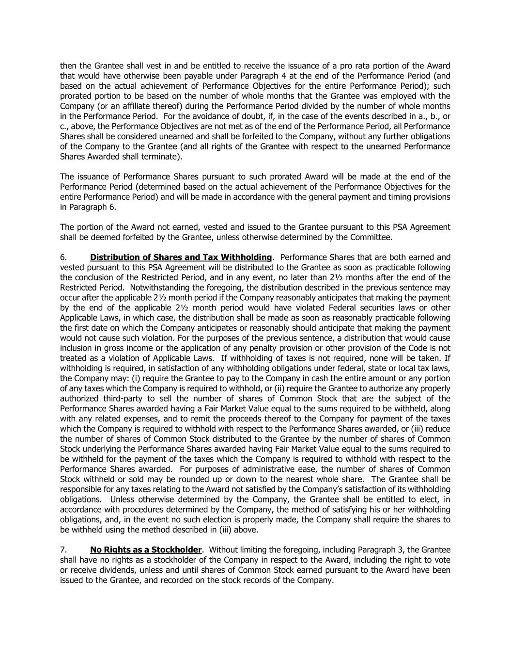 then the Grantee shall vest in and be entitled to receive the issuance of a pro rata portion of the Award that would have otherwise been payable under Paragraph 4 at the end of the Performance Period (and based on the actual achievement of Performance Objectives for the entire Performance Period); such prorated portion to be based on the number of whole months that the Grantee was employed with the Company (or an affiliate thereof) during the Performance Period divided by the number of whole months in the Performance Period. For the avoidance of doubt, if, in the case of the events described in a., b., or c., above, the Performance Objectives are not met as of the end of the Performance Period, all Performance Shares shall be considered unearned and shall be forfeited to the Company, without any further obligations of the Company to the Grantee (and all rights of the Grantee with respect to the unearned Performance Shares Awarded shall terminate). The issuance of Performance Shares pursuant to such prorated Award will be made at the end of the Performance Period (determined based on the actual achievement of the Performance Objectives for the entire Performance Period) and will be made in accordance with the general payment and timing provisions in Paragraph 6. The portion of the Award not earned, vested and issued to the Grantee pursuant to this PSA Agreement shall be deemed forfeited by the Grantee, unless otherwise determined by the Committee. 6. Distribution of Shares and Tax Withholding. Performance Shares that are both earned and vested pursuant to this PSA Agreement will be distributed to the Grantee as soon as practicable following the conclusion of the Restricted Period, and in any event, no later than 2½ months after the end of the Restricted Period. Notwithstanding the foregoing, the distribution described in the previous sentence may occur after the applicable 2½ month period if the Company reasonably anticipates that making the payment by the end of the applicable 2½ month period would have violated Federal securities laws or other Applicable Laws, in which case, the distribution shall be made as soon as reasonably practicable following the first date on which the Company anticipates or reasonably should anticipate that making the payment would not cause such violation. For the purposes of the previous sentence, a distribution that would cause inclusion in gross income or the application of any penalty provision or other provision of the Code is not treated as a violation of Applicable Laws. If withholding of taxes is not required, none will be taken. If withholding is required, in satisfaction of any withholding obligations under federal, state or local tax laws, the Company may: (i) require the Grantee to pay to the Company in cash the entire amount or any portion of any taxes which the Company is required to withhold, or (ii) require the Grantee to authorize any properly authorized third-party to sell the number of shares of Common Stock that are the subject of the Performance Shares awarded having a Fair Market Value equal to the sums required to be withheld, along with any related expenses, and to remit the proceeds thereof to the Company for payment of the taxes which the Company is required to withhold with respect to the Performance Shares awarded, or (iii) reduce the number of shares of Common Stock distributed to the Grantee by the number of shares of Common Stock underlying the Performance Shares awarded having Fair Market Value equal to the sums required to be withheld for the payment of the taxes which the Company is required to withhold with respect to the Performance Shares awarded. For purposes of administrative ease, the number of shares of Common Stock withheld or sold may be rounded up or down to the nearest whole share. The Grantee shall be responsible for any taxes relating to the Award not satisfied by the Company’s satisfaction of its withholding obligations. Unless otherwise determined by the Company, the Grantee shall be entitled to elect, in accordance with procedures determined by the Company, the method of satisfying his or her withholding obligations, and, in the event no such election is properly made, the Company shall require the shares to be withheld using the method described in (iii) above. 7. No Rights as a Stockholder. Without limiting the foregoing, including Paragraph 3, the Grantee shall have no rights as a stockholder of the Company in respect to the Award, including the right to vote or receive dividends, unless and until shares of Common Stock earned pursuant to the Award have been issued to the Grantee, and recorded on the stock records of the Company.