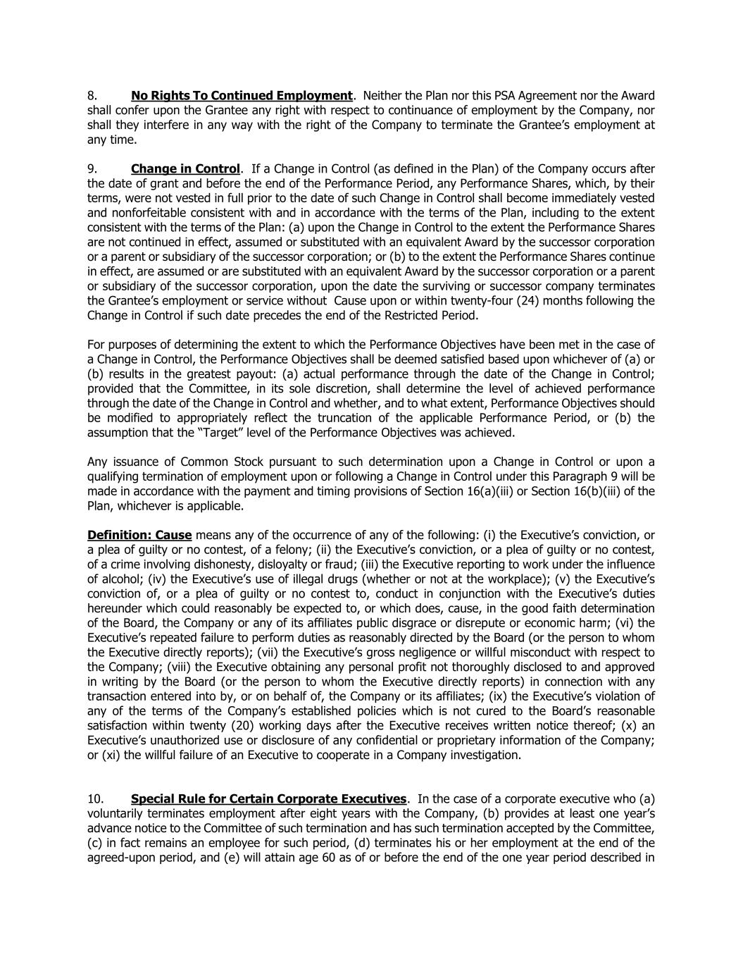 8. No Rights To Continued Employment. Neither the Plan nor this PSA Agreement nor the Award shall confer upon the Grantee any right with respect to continuance of employment by the Company, nor shall they interfere in any way with the right of the Company to terminate the Grantee’s employment at any time. 9. Change in Control. If a Change in Control (as defined in the Plan) of the Company occurs after the date of grant and before the end of the Performance Period, any Performance Shares, which, by their terms, were not vested in full prior to the date of such Change in Control shall become immediately vested and nonforfeitable consistent with and in accordance with the terms of the Plan, including to the extent consistent with the terms of the Plan: (a) upon the Change in Control to the extent the Performance Shares are not continued in effect, assumed or substituted with an equivalent Award by the successor corporation or a parent or subsidiary of the successor corporation; or (b) to the extent the Performance Shares continue in effect, are assumed or are substituted with an equivalent Award by the successor corporation or a parent or subsidiary of the successor corporation, upon the date the surviving or successor company terminates the Grantee’s employment or service without Cause upon or within twenty-four (24) months following the Change in Control if such date precedes the end of the Restricted Period. For purposes of determining the extent to which the Performance Objectives have been met in the case of a Change in Control, the Performance Objectives shall be deemed satisfied based upon whichever of (a) or (b) results in the greatest payout: (a) actual performance through the date of the Change in Control; provided that the Committee, in its sole discretion, shall determine the level of achieved performance through the date of the Change in Control and whether, and to what extent, Performance Objectives should be modified to appropriately reflect the truncation of the applicable Performance Period, or (b) the assumption that the “Target” level of the Performance Objectives was achieved. Any issuance of Common Stock pursuant to such determination upon a Change in Control or upon a qualifying termination of employment upon or following a Change in Control under this Paragraph 9 will be made in accordance with the payment and timing provisions of Section 16(a)(iii) or Section 16(b)(iii) of the Plan, whichever is applicable. Definition: Cause means any of the occurrence of any of the following: (i) the Executive’s conviction, or a plea of guilty or no contest, of a felony; (ii) the Executive’s conviction, or a plea of guilty or no contest, of a crime involving dishonesty, disloyalty or fraud; (iii) the Executive reporting to work under the influence of alcohol; (iv) the Executive’s use of illegal drugs (whether or not at the workplace); (v) the Executive’s conviction of, or a plea of guilty or no contest to, conduct in conjunction with the Executive’s duties hereunder which could reasonably be expected to, or which does, cause, in the good faith determination of the Board, the Company or any of its affiliates public disgrace or disrepute or economic harm; (vi) the Executive’s repeated failure to perform duties as reasonably directed by the Board (or the person to whom the Executive directly reports); (vii) the Executive’s gross negligence or willful misconduct with respect to the Company; (viii) the Executive obtaining any personal profit not thoroughly disclosed to and approved in writing by the Board (or the person to whom the Executive directly reports) in connection with any transaction entered into by, or on behalf of, the Company or its affiliates; (ix) the Executive’s violation of any of the terms of the Company’s established policies which is not cured to the Board’s reasonable satisfaction within twenty (20) working days after the Executive receives written notice thereof; (x) an Executive’s unauthorized use or disclosure of any confidential or proprietary information of the Company; or (xi) the willful failure of an Executive to cooperate in a Company investigation. 10. Special Rule for Certain Corporate Executives. In the case of a corporate executive who (a) voluntarily terminates employment after eight years with the Company, (b) provides at least one year’s advance notice to the Committee of such termination and has such termination accepted by the Committee, (c) in fact remains an employee for such period, (d) terminates his or her employment at the end of the agreed-upon period, and (e) will attain age 60 as of or before the end of the one year period described in