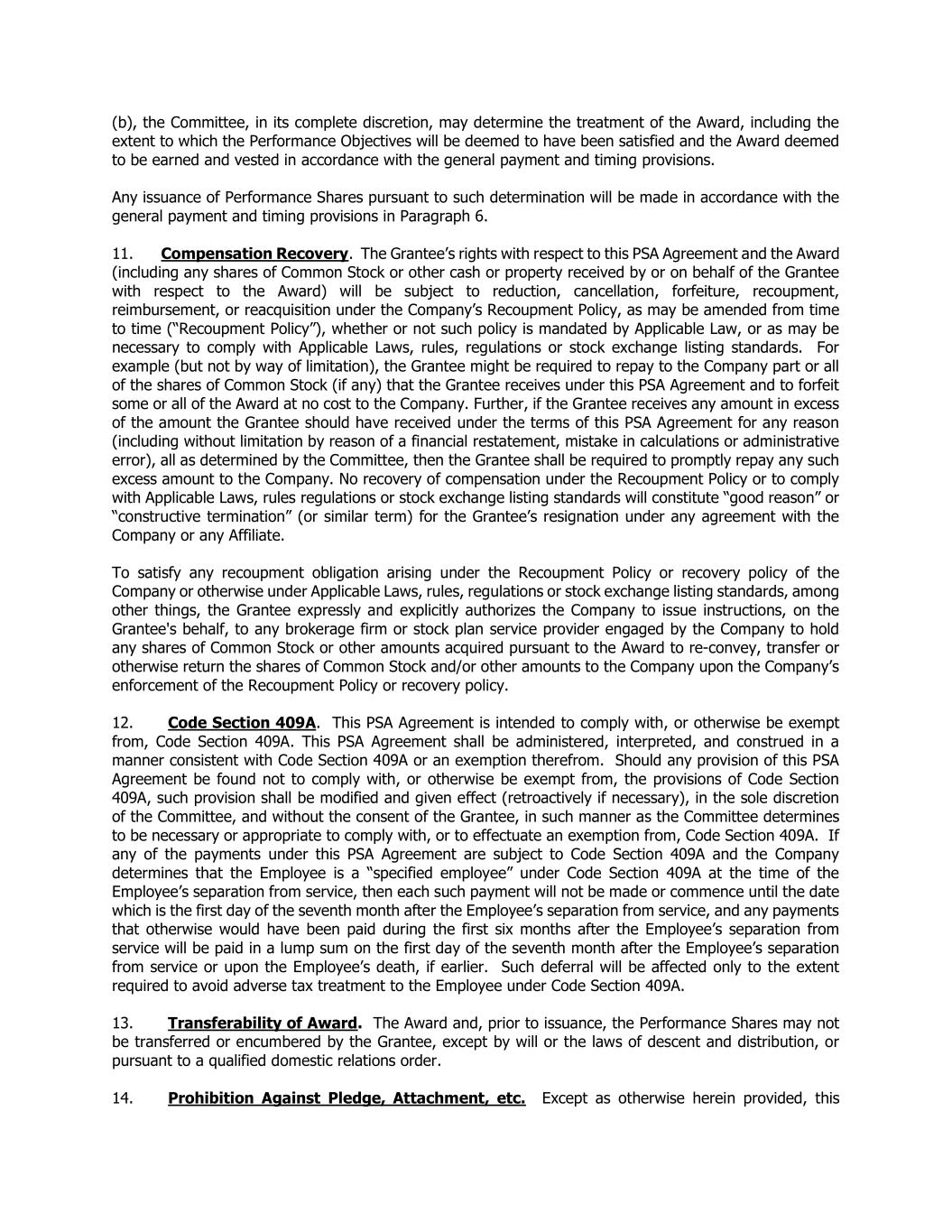 (b), the Committee, in its complete discretion, may determine the treatment of the Award, including the extent to which the Performance Objectives will be deemed to have been satisfied and the Award deemed to be earned and vested in accordance with the general payment and timing provisions. Any issuance of Performance Shares pursuant to such determination will be made in accordance with the general payment and timing provisions in Paragraph 6. 11. Compensation Recovery. The Grantee’s rights with respect to this PSA Agreement and the Award (including any shares of Common Stock or other cash or property received by or on behalf of the Grantee with respect to the Award) will be subject to reduction, cancellation, forfeiture, recoupment, reimbursement, or reacquisition under the Company’s Recoupment Policy, as may be amended from time to time (“Recoupment Policy”), whether or not such policy is mandated by Applicable Law, or as may be necessary to comply with Applicable Laws, rules, regulations or stock exchange listing standards. For example (but not by way of limitation), the Grantee might be required to repay to the Company part or all of the shares of Common Stock (if any) that the Grantee receives under this PSA Agreement and to forfeit some or all of the Award at no cost to the Company. Further, if the Grantee receives any amount in excess of the amount the Grantee should have received under the terms of this PSA Agreement for any reason (including without limitation by reason of a financial restatement, mistake in calculations or administrative error), all as determined by the Committee, then the Grantee shall be required to promptly repay any such excess amount to the Company. No recovery of compensation under the Recoupment Policy or to comply with Applicable Laws, rules regulations or stock exchange listing standards will constitute “good reason” or “constructive termination” (or similar term) for the Grantee’s resignation under any agreement with the Company or any Affiliate. To satisfy any recoupment obligation arising under the Recoupment Policy or recovery policy of the Company or otherwise under Applicable Laws, rules, regulations or stock exchange listing standards, among other things, the Grantee expressly and explicitly authorizes the Company to issue instructions, on the Grantee's behalf, to any brokerage firm or stock plan service provider engaged by the Company to hold any shares of Common Stock or other amounts acquired pursuant to the Award to re-convey, transfer or otherwise return the shares of Common Stock and/or other amounts to the Company upon the Company’s enforcement of the Recoupment Policy or recovery policy. 12. Code Section 409A. This PSA Agreement is intended to comply with, or otherwise be exempt from, Code Section 409A. This PSA Agreement shall be administered, interpreted, and construed in a manner consistent with Code Section 409A or an exemption therefrom. Should any provision of this PSA Agreement be found not to comply with, or otherwise be exempt from, the provisions of Code Section 409A, such provision shall be modified and given effect (retroactively if necessary), in the sole discretion of the Committee, and without the consent of the Grantee, in such manner as the Committee determines to be necessary or appropriate to comply with, or to effectuate an exemption from, Code Section 409A. If any of the payments under this PSA Agreement are subject to Code Section 409A and the Company determines that the Employee is a “specified employee” under Code Section 409A at the time of the Employee’s separation from service, then each such payment will not be made or commence until the date which is the first day of the seventh month after the Employee’s separation from service, and any payments that otherwise would have been paid during the first six months after the Employee’s separation from service will be paid in a lump sum on the first day of the seventh month after the Employee’s separation from service or upon the Employee’s death, if earlier. Such deferral will be affected only to the extent required to avoid adverse tax treatment to the Employee under Code Section 409A. 13. Transferability of Award. The Award and, prior to issuance, the Performance Shares may not be transferred or encumbered by the Grantee, except by will or the laws of descent and distribution, or pursuant to a qualified domestic relations order. 14. Prohibition Against Pledge, Attachment, etc. Except as otherwise herein provided, this