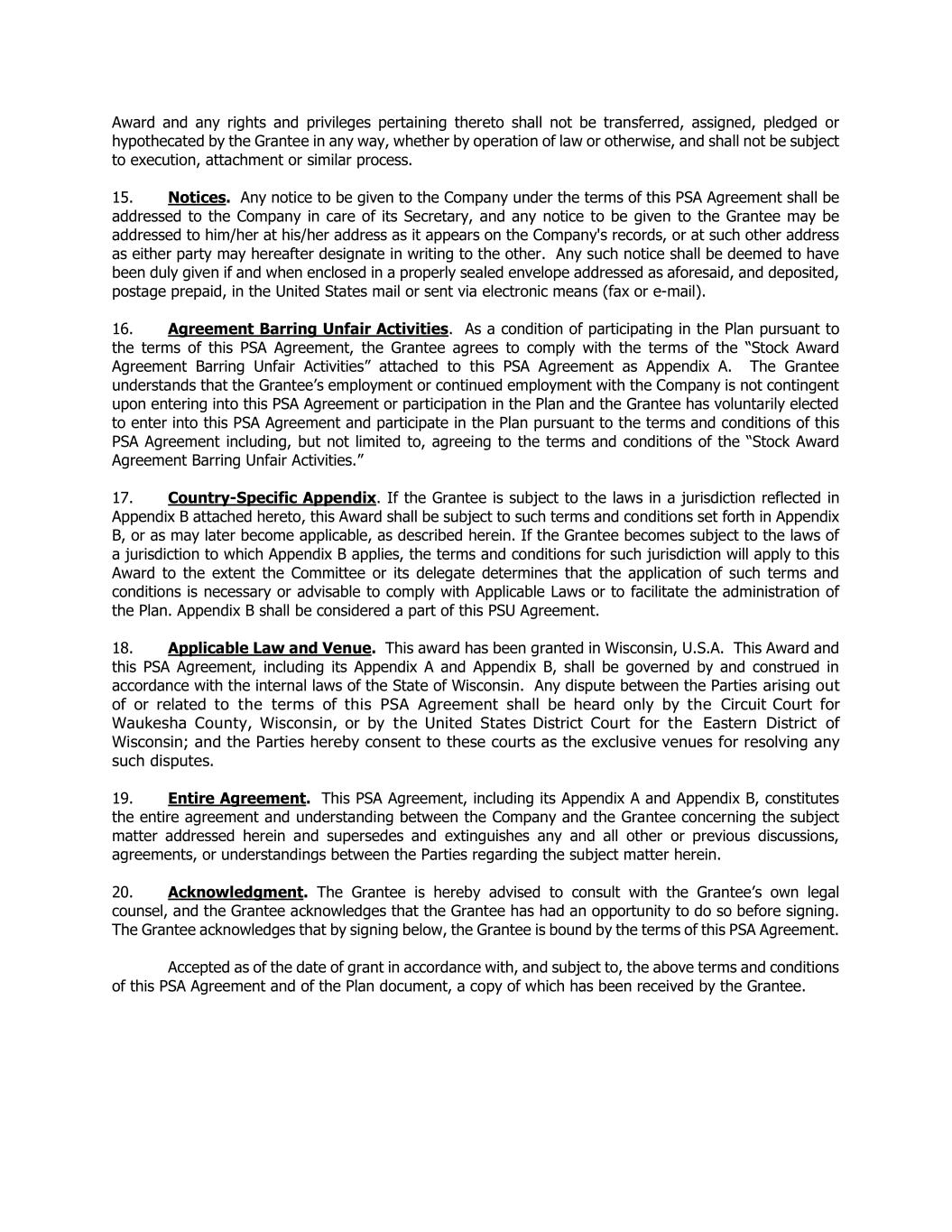 Award and any rights and privileges pertaining thereto shall not be transferred, assigned, pledged or hypothecated by the Grantee in any way, whether by operation of law or otherwise, and shall not be subject to execution, attachment or similar process. 15. Notices. Any notice to be given to the Company under the terms of this PSA Agreement shall be addressed to the Company in care of its Secretary, and any notice to be given to the Grantee may be addressed to him/her at his/her address as it appears on the Company's records, or at such other address as either party may hereafter designate in writing to the other. Any such notice shall be deemed to have been duly given if and when enclosed in a properly sealed envelope addressed as aforesaid, and deposited, postage prepaid, in the United States mail or sent via electronic means (fax or e-mail). 16. Agreement Barring Unfair Activities. As a condition of participating in the Plan pursuant to the terms of this PSA Agreement, the Grantee agrees to comply with the terms of the “Stock Award Agreement Barring Unfair Activities” attached to this PSA Agreement as Appendix A. The Grantee understands that the Grantee’s employment or continued employment with the Company is not contingent upon entering into this PSA Agreement or participation in the Plan and the Grantee has voluntarily elected to enter into this PSA Agreement and participate in the Plan pursuant to the terms and conditions of this PSA Agreement including, but not limited to, agreeing to the terms and conditions of the “Stock Award Agreement Barring Unfair Activities.” 17. Country-Specific Appendix. If the Grantee is subject to the laws in a jurisdiction reflected in Appendix B attached hereto, this Award shall be subject to such terms and conditions set forth in Appendix B, or as may later become applicable, as described herein. If the Grantee becomes subject to the laws of a jurisdiction to which Appendix B applies, the terms and conditions for such jurisdiction will apply to this Award to the extent the Committee or its delegate determines that the application of such terms and conditions is necessary or advisable to comply with Applicable Laws or to facilitate the administration of the Plan. Appendix B shall be considered a part of this PSU Agreement. 18. Applicable Law and Venue. This award has been granted in Wisconsin, U.S.A. This Award and this PSA Agreement, including its Appendix A and Appendix B, shall be governed by and construed in accordance with the internal laws of the State of Wisconsin. Any dispute between the Parties arising out of or related to the terms of this PSA Agreement shall be heard only by the Circuit Court for Waukesha County, Wisconsin, or by the United States District Court for the Eastern District of Wisconsin; and the Parties hereby consent to these courts as the exclusive venues for resolving any such disputes. 19. Entire Agreement. This PSA Agreement, including its Appendix A and Appendix B, constitutes the entire agreement and understanding between the Company and the Grantee concerning the subject matter addressed herein and supersedes and extinguishes any and all other or previous discussions, agreements, or understandings between the Parties regarding the subject matter herein. 20. Acknowledgment. The Grantee is hereby advised to consult with the Grantee’s own legal counsel, and the Grantee acknowledges that the Grantee has had an opportunity to do so before signing. The Grantee acknowledges that by signing below, the Grantee is bound by the terms of this PSA Agreement. Accepted as of the date of grant in accordance with, and subject to, the above terms and conditions of this PSA Agreement and of the Plan document, a copy of which has been received by the Grantee.