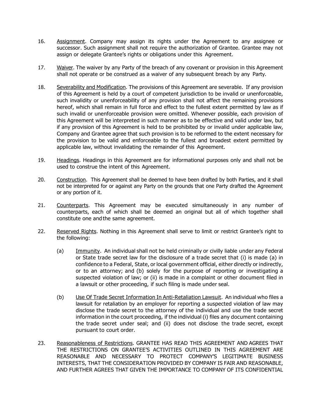 16. Assignment. Company may assign its rights under the Agreement to any assignee or successor. Such assignment shall not require the authorization of Grantee. Grantee may not assign or delegate Grantee’s rights or obligations under this Agreement. 17. Waiver. The waiver by any Party of the breach of any covenant or provision in this Agreement shall not operate or be construed as a waiver of any subsequent breach by any Party. 18. Severability and Modification. The provisions of this Agreement are severable. If any provision of this Agreement is held by a court of competent jurisdiction to be invalid or unenforceable, such invalidity or unenforceability of any provision shall not affect the remaining provisions hereof, which shall remain in full force and effect to the fullest extent permitted by law as if such invalid or unenforceable provision were omitted. Whenever possible, each provision of this Agreement will be interpreted in such manner as to be effective and valid under law, but if any provision of this Agreement is held to be prohibited by or invalid under applicable law, Company and Grantee agree that such provision is to be reformed to the extent necessary for the provision to be valid and enforceable to the fullest and broadest extent permitted by applicable law, without invalidating the remainder of this Agreement. 19. Headings. Headings in this Agreement are for informational purposes only and shall not be used to construe the intent of this Agreement. 20. Construction. This Agreement shall be deemed to have been drafted by both Parties, and it shall not be interpreted for or against any Party on the grounds that one Party drafted the Agreement or any portion of it. 21. Counterparts. This Agreement may be executed simultaneously in any number of counterparts, each of which shall be deemed an original but all of which together shall constitute one and the same agreement. 22. Reserved Rights. Nothing in this Agreement shall serve to limit or restrict Grantee’s right to the following: (a) Immunity. An individual shall not be held criminally or civilly liable under any Federal or State trade secret law for the disclosure of a trade secret that (i) is made (a) in confidence to a Federal, State, or local government official, either directly or indirectly, or to an attorney; and (b) solely for the purpose of reporting or investigating a suspected violation of law; or (ii) is made in a complaint or other document filed in a lawsuit or other proceeding, if such filing is made under seal. (b) Use Of Trade Secret Information In Anti-Retaliation Lawsuit. An individual who files a lawsuit for retaliation by an employer for reporting a suspected violation of law may disclose the trade secret to the attorney of the individual and use the trade secret information in the court proceeding, if the individual (i) files any document containing the trade secret under seal; and (ii) does not disclose the trade secret, except pursuant to court order. 23. Reasonableness of Restrictions. GRANTEE HAS READ THIS AGREEMENT AND AGREES THAT THE RESTRICTIONS ON GRANTEE’S ACTIVITIES OUTLINED IN THIS AGREEMENT ARE REASONABLE AND NECESSARY TO PROTECT COMPANY’S LEGITIMATE BUSINESS INTERESTS, THAT THE CONSIDERATION PROVIDED BY COMPANY IS FAIR AND REASONABLE, AND FURTHER AGREES THAT GIVEN THE IMPORTANCE TO COMPANY OF ITS CONFIDENTIAL