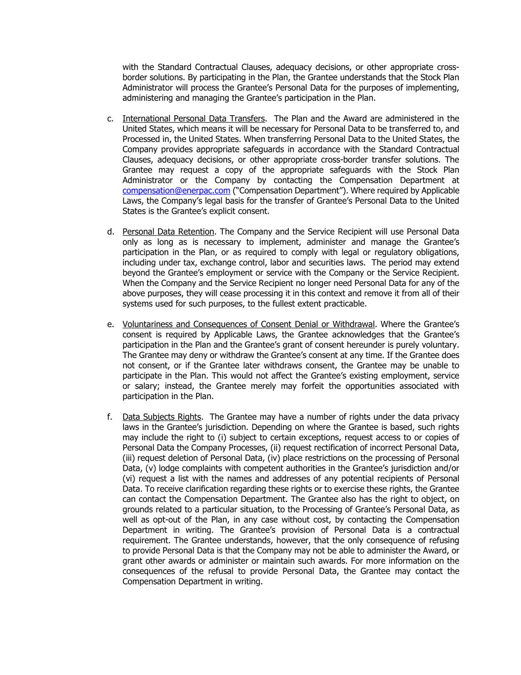 with the Standard Contractual Clauses, adequacy decisions, or other appropriate cross- border solutions. By participating in the Plan, the Grantee understands that the Stock Plan Administrator will process the Grantee’s Personal Data for the purposes of implementing, administering and managing the Grantee’s participation in the Plan. c. International Personal Data Transfers. The Plan and the Award are administered in the United States, which means it will be necessary for Personal Data to be transferred to, and Processed in, the United States. When transferring Personal Data to the United States, the Company provides appropriate safeguards in accordance with the Standard Contractual Clauses, adequacy decisions, or other appropriate cross-border transfer solutions. The Grantee may request a copy of the appropriate safeguards with the Stock Plan Administrator or the Company by contacting the Compensation Department at compensation@enerpac.com (“Compensation Department”). Where required by Applicable Laws, the Company’s legal basis for the transfer of Grantee’s Personal Data to the United States is the Grantee’s explicit consent. d. Personal Data Retention. The Company and the Service Recipient will use Personal Data only as long as is necessary to implement, administer and manage the Grantee’s participation in the Plan, or as required to comply with legal or regulatory obligations, including under tax, exchange control, labor and securities laws. The period may extend beyond the Grantee’s employment or service with the Company or the Service Recipient. When the Company and the Service Recipient no longer need Personal Data for any of the above purposes, they will cease processing it in this context and remove it from all of their systems used for such purposes, to the fullest extent practicable. e. Voluntariness and Consequences of Consent Denial or Withdrawal. Where the Grantee’s consent is required by Applicable Laws, the Grantee acknowledges that the Grantee’s participation in the Plan and the Grantee’s grant of consent hereunder is purely voluntary. The Grantee may deny or withdraw the Grantee’s consent at any time. If the Grantee does not consent, or if the Grantee later withdraws consent, the Grantee may be unable to participate in the Plan. This would not affect the Grantee’s existing employment, service or salary; instead, the Grantee merely may forfeit the opportunities associated with participation in the Plan. f. Data Subjects Rights. The Grantee may have a number of rights under the data privacy laws in the Grantee’s jurisdiction. Depending on where the Grantee is based, such rights may include the right to (i) subject to certain exceptions, request access to or copies of Personal Data the Company Processes, (ii) request rectification of incorrect Personal Data, (iii) request deletion of Personal Data, (iv) place restrictions on the processing of Personal Data, (v) lodge complaints with competent authorities in the Grantee’s jurisdiction and/or (vi) request a list with the names and addresses of any potential recipients of Personal Data. To receive clarification regarding these rights or to exercise these rights, the Grantee can contact the Compensation Department. The Grantee also has the right to object, on grounds related to a particular situation, to the Processing of Grantee’s Personal Data, as well as opt-out of the Plan, in any case without cost, by contacting the Compensation Department in writing. The Grantee’s provision of Personal Data is a contractual requirement. The Grantee understands, however, that the only consequence of refusing to provide Personal Data is that the Company may not be able to administer the Award, or grant other awards or administer or maintain such awards. For more information on the consequences of the refusal to provide Personal Data, the Grantee may contact the Compensation Department in writing.
