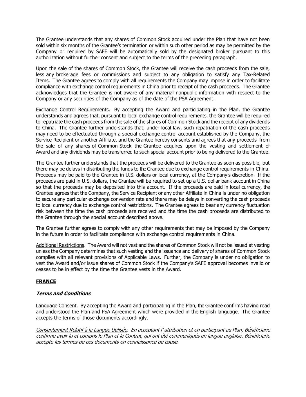 The Grantee understands that any shares of Common Stock acquired under the Plan that have not been sold within six months of the Grantee’s termination or within such other period as may be permitted by the Company or required by SAFE will be automatically sold by the designated broker pursuant to this authorization without further consent and subject to the terms of the preceding paragraph. Upon the sale of the shares of Common Stock, the Grantee will receive the cash proceeds from the sale, less any brokerage fees or commissions and subject to any obligation to satisfy any Tax-Related Items. The Grantee agrees to comply with all requirements the Company may impose in order to facilitate compliance with exchange control requirements in China prior to receipt of the cash proceeds. The Grantee acknowledges that the Grantee is not aware of any material nonpublic information with respect to the Company or any securities of the Company as of the date of the PSA Agreement. Exchange Control Requirements. By accepting the Award and participating in the Plan, the Grantee understands and agrees that, pursuant to local exchange control requirements, the Grantee will be required to repatriate the cash proceeds from the sale of the shares of Common Stock and the receipt of any dividends to China. The Grantee further understands that, under local law, such repatriation of the cash proceeds may need to be effectuated through a special exchange control account established by the Company, the Service Recipient or another Affiliate, and the Grantee hereby consents and agrees that any proceeds from the sale of any shares of Common Stock the Grantee acquires upon the vesting and settlement of Award and any dividends may be transferred to such special account prior to being delivered to the Grantee. The Grantee further understands that the proceeds will be delivered to the Grantee as soon as possible, but there may be delays in distributing the funds to the Grantee due to exchange control requirements in China. Proceeds may be paid to the Grantee in U.S. dollars or local currency, at the Company’s discretion. If the proceeds are paid in U.S. dollars, the Grantee will be required to set up a U.S. dollar bank account in China so that the proceeds may be deposited into this account. If the proceeds are paid in local currency, the Grantee agrees that the Company, the Service Recipient or any other Affiliate in China is under no obligation to secure any particular exchange conversion rate and there may be delays in converting the cash proceeds to local currency due to exchange control restrictions. The Grantee agrees to bear any currency fluctuation risk between the time the cash proceeds are received and the time the cash proceeds are distributed to the Grantee through the special account described above. The Grantee further agrees to comply with any other requirements that may be imposed by the Company in the future in order to facilitate compliance with exchange control requirements in China. Additional Restrictions. The Award will not vest and the shares of Common Stock will not be issued at vesting unless the Company determines that such vesting and the issuance and delivery of shares of Common Stock complies with all relevant provisions of Applicable Laws. Further, the Company is under no obligation to vest the Award and/or issue shares of Common Stock if the Company’s SAFE approval becomes invalid or ceases to be in effect by the time the Grantee vests in the Award. FRANCE Terms and Conditions Language Consent. By accepting the Award and participating in the Plan, the Grantee confirms having read and understood the Plan and PSA Agreement which were provided in the English language. The Grantee accepts the terms of those documents accordingly. Consentement Relatif à la Langue Utilisée. En acceptant l’ attribution et en participant au Plan, Bénéficiarie confirme avoir lu et compris le Plan et le Contrat, qui ont été communiqués en langue anglaise. Bénéficiarie accepte les termes de ces documents en connaissance de cause.