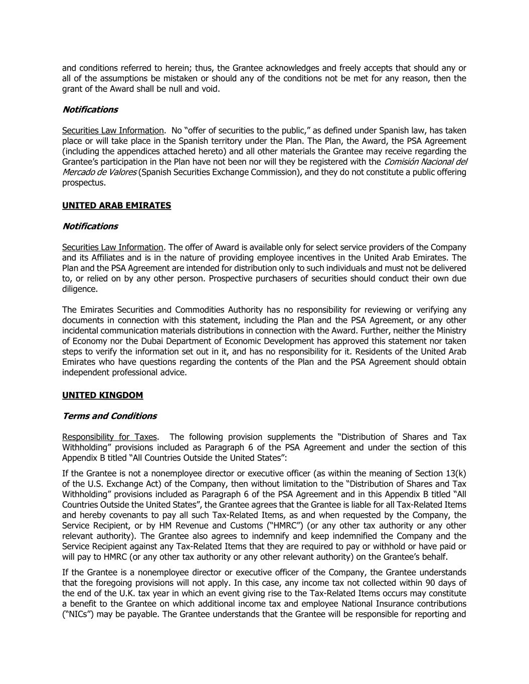 and conditions referred to herein; thus, the Grantee acknowledges and freely accepts that should any or all of the assumptions be mistaken or should any of the conditions not be met for any reason, then the grant of the Award shall be null and void. Notifications Securities Law Information. No “offer of securities to the public,” as defined under Spanish law, has taken place or will take place in the Spanish territory under the Plan. The Plan, the Award, the PSA Agreement (including the appendices attached hereto) and all other materials the Grantee may receive regarding the Grantee’s participation in the Plan have not been nor will they be registered with the Comisión Nacional del Mercado de Valores (Spanish Securities Exchange Commission), and they do not constitute a public offering prospectus. UNITED ARAB EMIRATES Notifications Securities Law Information. The offer of Award is available only for select service providers of the Company and its Affiliates and is in the nature of providing employee incentives in the United Arab Emirates. The Plan and the PSA Agreement are intended for distribution only to such individuals and must not be delivered to, or relied on by any other person. Prospective purchasers of securities should conduct their own due diligence. The Emirates Securities and Commodities Authority has no responsibility for reviewing or verifying any documents in connection with this statement, including the Plan and the PSA Agreement, or any other incidental communication materials distributions in connection with the Award. Further, neither the Ministry of Economy nor the Dubai Department of Economic Development has approved this statement nor taken steps to verify the information set out in it, and has no responsibility for it. Residents of the United Arab Emirates who have questions regarding the contents of the Plan and the PSA Agreement should obtain independent professional advice. UNITED KINGDOM Terms and Conditions Responsibility for Taxes. The following provision supplements the “Distribution of Shares and Tax Withholding” provisions included as Paragraph 6 of the PSA Agreement and under the section of this Appendix B titled “All Countries Outside the United States”: If the Grantee is not a nonemployee director or executive officer (as within the meaning of Section 13(k) of the U.S. Exchange Act) of the Company, then without limitation to the “Distribution of Shares and Tax Withholding” provisions included as Paragraph 6 of the PSA Agreement and in this Appendix B titled “All Countries Outside the United States”, the Grantee agrees that the Grantee is liable for all Tax-Related Items and hereby covenants to pay all such Tax-Related Items, as and when requested by the Company, the Service Recipient, or by HM Revenue and Customs (“HMRC”) (or any other tax authority or any other relevant authority). The Grantee also agrees to indemnify and keep indemnified the Company and the Service Recipient against any Tax-Related Items that they are required to pay or withhold or have paid or will pay to HMRC (or any other tax authority or any other relevant authority) on the Grantee’s behalf. If the Grantee is a nonemployee director or executive officer of the Company, the Grantee understands that the foregoing provisions will not apply. In this case, any income tax not collected within 90 days of the end of the U.K. tax year in which an event giving rise to the Tax-Related Items occurs may constitute a benefit to the Grantee on which additional income tax and employee National Insurance contributions (“NICs”) may be payable. The Grantee understands that the Grantee will be responsible for reporting and