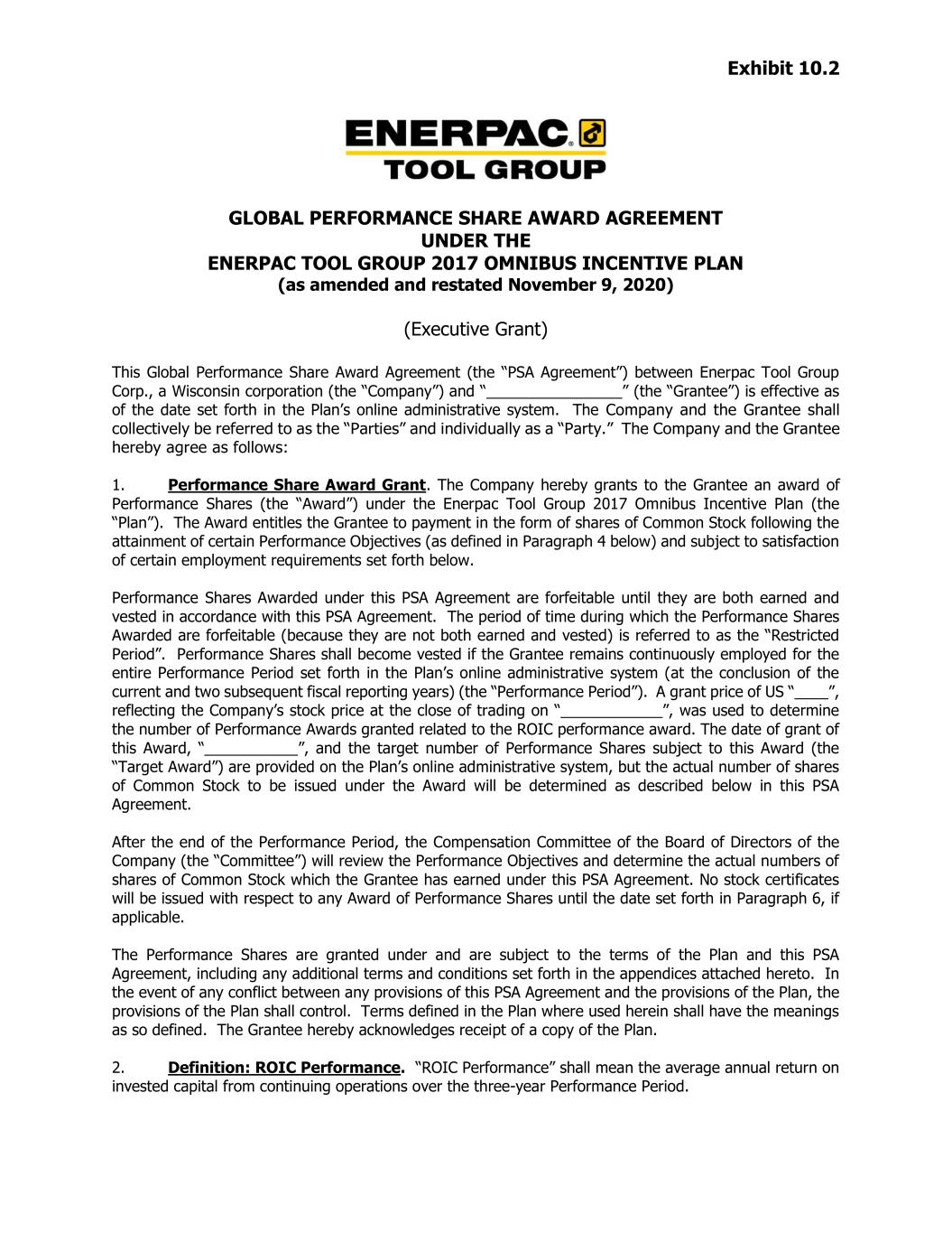 Exhibit 10.2 GLOBAL PERFORMANCE SHARE AWARD AGREEMENT UNDER THE ENERPAC TOOL GROUP 2017 OMNIBUS INCENTIVE PLAN (as amended and restated November 9, 2020) (Executive Grant) This Global Performance Share Award Agreement (the “PSA Agreement”) between Enerpac Tool Group Corp., a Wisconsin corporation (the “Company”) and “________________” (the “Grantee”) is effective as of the date set forth in the Plan’s online administrative system. The Company and the Grantee shall collectively be referred to as the “Parties” and individually as a “Party.” The Company and the Grantee hereby agree as follows: 1. Performance Share Award Grant. The Company hereby grants to the Grantee an award of Performance Shares (the “Award”) under the Enerpac Tool Group 2017 Omnibus Incentive Plan (the “Plan”). The Award entitles the Grantee to payment in the form of shares of Common Stock following the attainment of certain Performance Objectives (as defined in Paragraph 4 below) and subject to satisfaction of certain employment requirements set forth below. Performance Shares Awarded under this PSA Agreement are forfeitable until they are both earned and vested in accordance with this PSA Agreement. The period of time during which the Performance Shares Awarded are forfeitable (because they are not both earned and vested) is referred to as the “Restricted Period”. Performance Shares shall become vested if the Grantee remains continuously employed for the entire Performance Period set forth in the Plan’s online administrative system (at the conclusion of the current and two subsequent fiscal reporting years) (the “Performance Period”). A grant price of US “____”, reflecting the Company’s stock price at the close of trading on “____________”, was used to determine the number of Performance Awards granted related to the ROIC performance award. The date of grant of this Award, “___________”, and the target number of Performance Shares subject to this Award (the “Target Award”) are provided on the Plan’s online administrative system, but the actual number of shares of Common Stock to be issued under the Award will be determined as described below in this PSA Agreement. After the end of the Performance Period, the Compensation Committee of the Board of Directors of the Company (the “Committee”) will review the Performance Objectives and determine the actual numbers of shares of Common Stock which the Grantee has earned under this PSA Agreement. No stock certificates will be issued with respect to any Award of Performance Shares until the date set forth in Paragraph 6, if applicable. The Performance Shares are granted under and are subject to the terms of the Plan and this PSA Agreement, including any additional terms and conditions set forth in the appendices attached hereto. In the event of any conflict between any provisions of this PSA Agreement and the provisions of the Plan, the provisions of the Plan shall control. Terms defined in the Plan where used herein shall have the meanings as so defined. The Grantee hereby acknowledges receipt of a copy of the Plan. 2. Definition: ROIC Performance. “ROIC Performance” shall mean the average annual return on invested capital from continuing operations over the three-year Performance Period.
