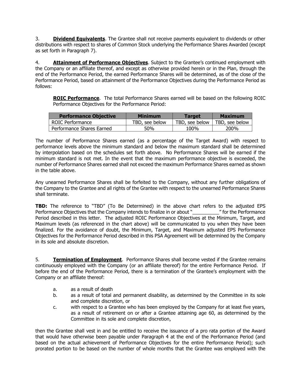 3. Dividend Equivalents. The Grantee shall not receive payments equivalent to dividends or other distributions with respect to shares of Common Stock underlying the Performance Shares Awarded (except as set forth in Paragraph 7). 4. Attainment of Performance Objectives. Subject to the Grantee’s continued employment with the Company or an affiliate thereof, and except as otherwise provided herein or in the Plan, through the end of the Performance Period, the earned Performance Shares will be determined, as of the close of the Performance Period, based on attainment of the Performance Objectives during the Performance Period as follows: ROIC Performance. The total Performance Shares earned will be based on the following ROIC Performance Objectives for the Performance Period: Performance Objective Minimum Target Maximum ROIC Performance TBD, see below TBD, see below TBD, see below Performance Shares Earned 50% 100% 200% The number of Performance Shares earned (as a percentage of the Target Award) with respect to performance levels above the minimum standard and below the maximum standard shall be determined by interpolation based on the schedules set forth above. No Performance Shares will be earned if the minimum standard is not met. In the event that the maximum performance objective is exceeded, the number of Performance Shares earned shall not exceed the maximum Performance Shares earned as shown in the table above. Any unearned Performance Shares shall be forfeited to the Company, without any further obligations of the Company to the Grantee and all rights of the Grantee with respect to the unearned Performance Shares shall terminate. TBD: The reference to “TBD” (To Be Determined) in the above chart refers to the adjusted EPS Performance Objectives that the Company intends to finalize in or about “__________” for the Performance Period described in this letter. The adjusted ROIC Performance Objectives at the Minimum, Target, and Maximum levels (as referenced in the chart above) will be communicated to you when they have been finalized. For the avoidance of doubt, the Minimum, Target, and Maximum adjusted EPS Performance Objectives for the Performance Period described in this PSA Agreement will be determined by the Company in its sole and absolute discretion. 5. Termination of Employment. Performance Shares shall become vested if the Grantee remains continuously employed with the Company (or an affiliate thereof) for the entire Performance Period. If before the end of the Performance Period, there is a termination of the Grantee’s employment with the Company or an affiliate thereof: a. as a result of death b. as a result of total and permanent disability, as determined by the Committee in its sole and complete discretion, or c. with respect to a Grantee who has been employed by the Company for at least five years, as a result of retirement on or after a Grantee attaining age 60, as determined by the Committee in its sole and complete discretion, then the Grantee shall vest in and be entitled to receive the issuance of a pro rata portion of the Award that would have otherwise been payable under Paragraph 4 at the end of the Performance Period (and based on the actual achievement of Performance Objectives for the entire Performance Period); such prorated portion to be based on the number of whole months that the Grantee was employed with the