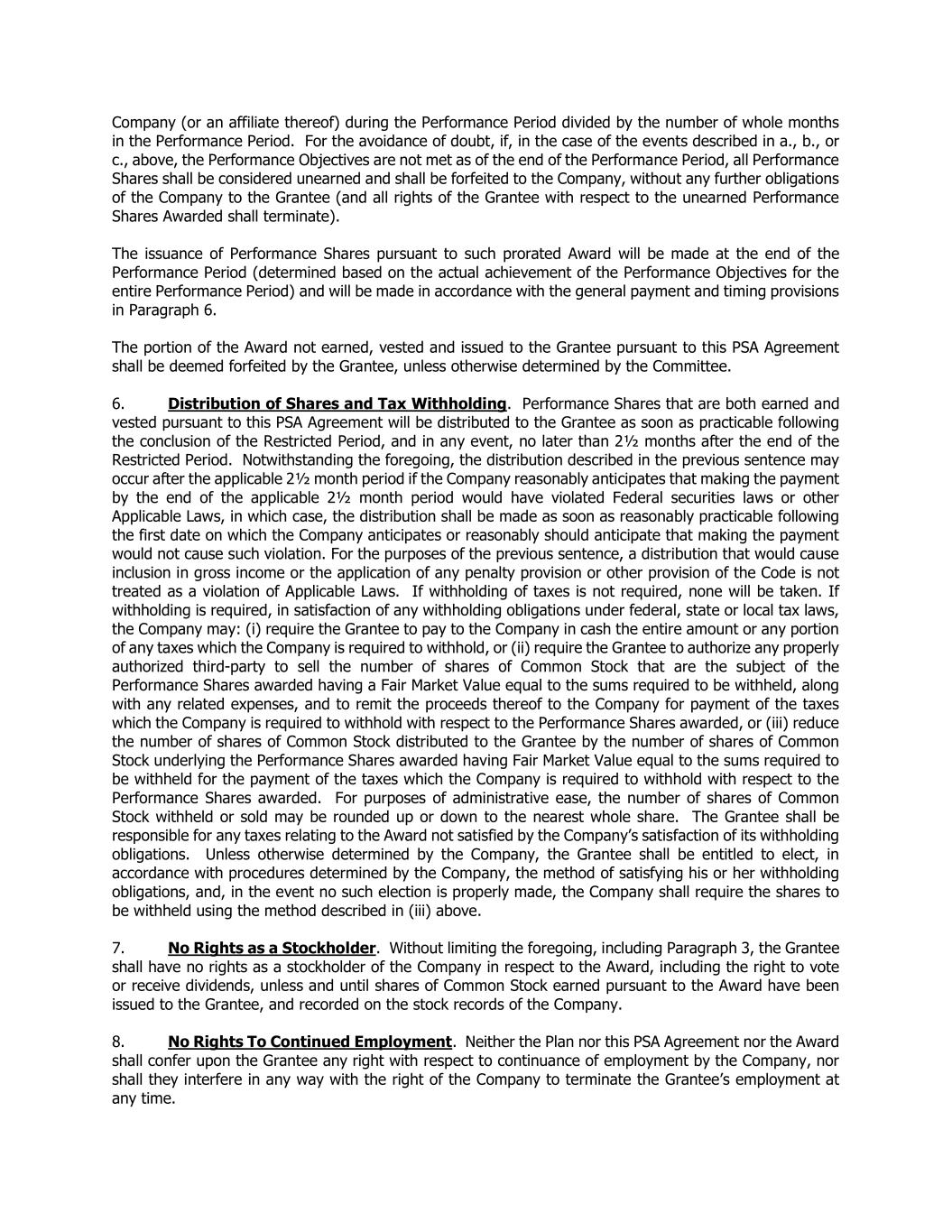 Company (or an affiliate thereof) during the Performance Period divided by the number of whole months in the Performance Period. For the avoidance of doubt, if, in the case of the events described in a., b., or c., above, the Performance Objectives are not met as of the end of the Performance Period, all Performance Shares shall be considered unearned and shall be forfeited to the Company, without any further obligations of the Company to the Grantee (and all rights of the Grantee with respect to the unearned Performance Shares Awarded shall terminate). The issuance of Performance Shares pursuant to such prorated Award will be made at the end of the Performance Period (determined based on the actual achievement of the Performance Objectives for the entire Performance Period) and will be made in accordance with the general payment and timing provisions in Paragraph 6. The portion of the Award not earned, vested and issued to the Grantee pursuant to this PSA Agreement shall be deemed forfeited by the Grantee, unless otherwise determined by the Committee. 6. Distribution of Shares and Tax Withholding. Performance Shares that are both earned and vested pursuant to this PSA Agreement will be distributed to the Grantee as soon as practicable following the conclusion of the Restricted Period, and in any event, no later than 2½ months after the end of the Restricted Period. Notwithstanding the foregoing, the distribution described in the previous sentence may occur after the applicable 2½ month period if the Company reasonably anticipates that making the payment by the end of the applicable 2½ month period would have violated Federal securities laws or other Applicable Laws, in which case, the distribution shall be made as soon as reasonably practicable following the first date on which the Company anticipates or reasonably should anticipate that making the payment would not cause such violation. For the purposes of the previous sentence, a distribution that would cause inclusion in gross income or the application of any penalty provision or other provision of the Code is not treated as a violation of Applicable Laws. If withholding of taxes is not required, none will be taken. If withholding is required, in satisfaction of any withholding obligations under federal, state or local tax laws, the Company may: (i) require the Grantee to pay to the Company in cash the entire amount or any portion of any taxes which the Company is required to withhold, or (ii) require the Grantee to authorize any properly authorized third-party to sell the number of shares of Common Stock that are the subject of the Performance Shares awarded having a Fair Market Value equal to the sums required to be withheld, along with any related expenses, and to remit the proceeds thereof to the Company for payment of the taxes which the Company is required to withhold with respect to the Performance Shares awarded, or (iii) reduce the number of shares of Common Stock distributed to the Grantee by the number of shares of Common Stock underlying the Performance Shares awarded having Fair Market Value equal to the sums required to be withheld for the payment of the taxes which the Company is required to withhold with respect to the Performance Shares awarded. For purposes of administrative ease, the number of shares of Common Stock withheld or sold may be rounded up or down to the nearest whole share. The Grantee shall be responsible for any taxes relating to the Award not satisfied by the Company’s satisfaction of its withholding obligations. Unless otherwise determined by the Company, the Grantee shall be entitled to elect, in accordance with procedures determined by the Company, the method of satisfying his or her withholding obligations, and, in the event no such election is properly made, the Company shall require the shares to be withheld using the method described in (iii) above. 7. No Rights as a Stockholder. Without limiting the foregoing, including Paragraph 3, the Grantee shall have no rights as a stockholder of the Company in respect to the Award, including the right to vote or receive dividends, unless and until shares of Common Stock earned pursuant to the Award have been issued to the Grantee, and recorded on the stock records of the Company. 8. No Rights To Continued Employment. Neither the Plan nor this PSA Agreement nor the Award shall confer upon the Grantee any right with respect to continuance of employment by the Company, nor shall they interfere in any way with the right of the Company to terminate the Grantee’s employment at any time.