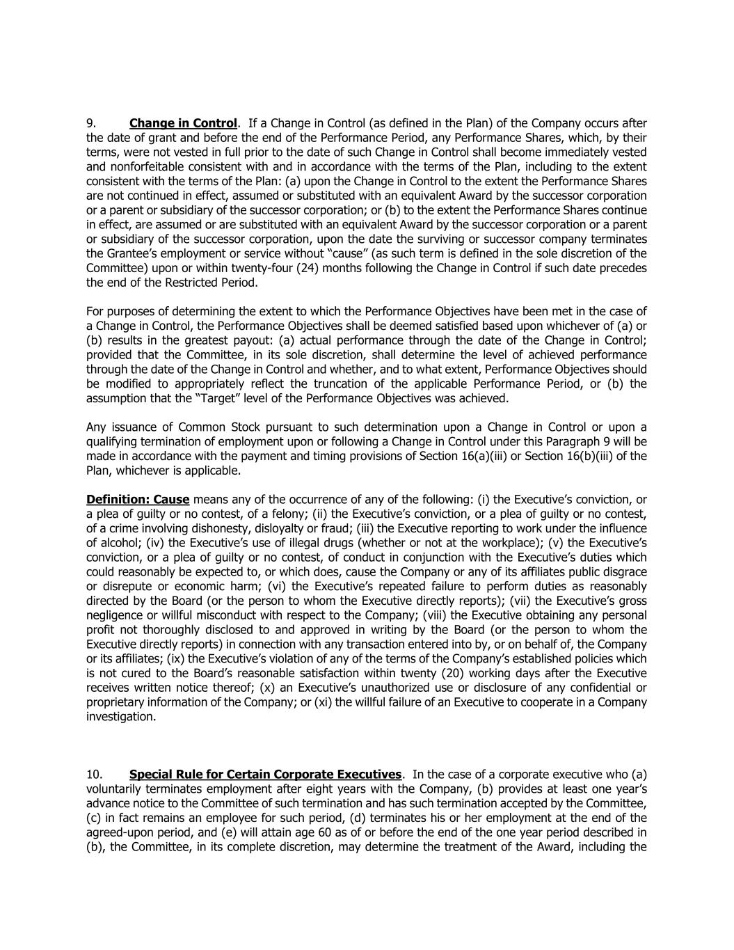 9. Change in Control. If a Change in Control (as defined in the Plan) of the Company occurs after the date of grant and before the end of the Performance Period, any Performance Shares, which, by their terms, were not vested in full prior to the date of such Change in Control shall become immediately vested and nonforfeitable consistent with and in accordance with the terms of the Plan, including to the extent consistent with the terms of the Plan: (a) upon the Change in Control to the extent the Performance Shares are not continued in effect, assumed or substituted with an equivalent Award by the successor corporation or a parent or subsidiary of the successor corporation; or (b) to the extent the Performance Shares continue in effect, are assumed or are substituted with an equivalent Award by the successor corporation or a parent or subsidiary of the successor corporation, upon the date the surviving or successor company terminates the Grantee’s employment or service without “cause” (as such term is defined in the sole discretion of the Committee) upon or within twenty-four (24) months following the Change in Control if such date precedes the end of the Restricted Period. For purposes of determining the extent to which the Performance Objectives have been met in the case of a Change in Control, the Performance Objectives shall be deemed satisfied based upon whichever of (a) or (b) results in the greatest payout: (a) actual performance through the date of the Change in Control; provided that the Committee, in its sole discretion, shall determine the level of achieved performance through the date of the Change in Control and whether, and to what extent, Performance Objectives should be modified to appropriately reflect the truncation of the applicable Performance Period, or (b) the assumption that the “Target” level of the Performance Objectives was achieved. Any issuance of Common Stock pursuant to such determination upon a Change in Control or upon a qualifying termination of employment upon or following a Change in Control under this Paragraph 9 will be made in accordance with the payment and timing provisions of Section 16(a)(iii) or Section 16(b)(iii) of the Plan, whichever is applicable. Definition: Cause means any of the occurrence of any of the following: (i) the Executive’s conviction, or a plea of guilty or no contest, of a felony; (ii) the Executive’s conviction, or a plea of guilty or no contest, of a crime involving dishonesty, disloyalty or fraud; (iii) the Executive reporting to work under the influence of alcohol; (iv) the Executive’s use of illegal drugs (whether or not at the workplace); (v) the Executive’s conviction, or a plea of guilty or no contest, of conduct in conjunction with the Executive’s duties which could reasonably be expected to, or which does, cause the Company or any of its affiliates public disgrace or disrepute or economic harm; (vi) the Executive’s repeated failure to perform duties as reasonably directed by the Board (or the person to whom the Executive directly reports); (vii) the Executive’s gross negligence or willful misconduct with respect to the Company; (viii) the Executive obtaining any personal profit not thoroughly disclosed to and approved in writing by the Board (or the person to whom the Executive directly reports) in connection with any transaction entered into by, or on behalf of, the Company or its affiliates; (ix) the Executive’s violation of any of the terms of the Company’s established policies which is not cured to the Board’s reasonable satisfaction within twenty (20) working days after the Executive receives written notice thereof; (x) an Executive’s unauthorized use or disclosure of any confidential or proprietary information of the Company; or (xi) the willful failure of an Executive to cooperate in a Company investigation. 10. Special Rule for Certain Corporate Executives. In the case of a corporate executive who (a) voluntarily terminates employment after eight years with the Company, (b) provides at least one year’s advance notice to the Committee of such termination and has such termination accepted by the Committee, (c) in fact remains an employee for such period, (d) terminates his or her employment at the end of the agreed-upon period, and (e) will attain age 60 as of or before the end of the one year period described in (b), the Committee, in its complete discretion, may determine the treatment of the Award, including the