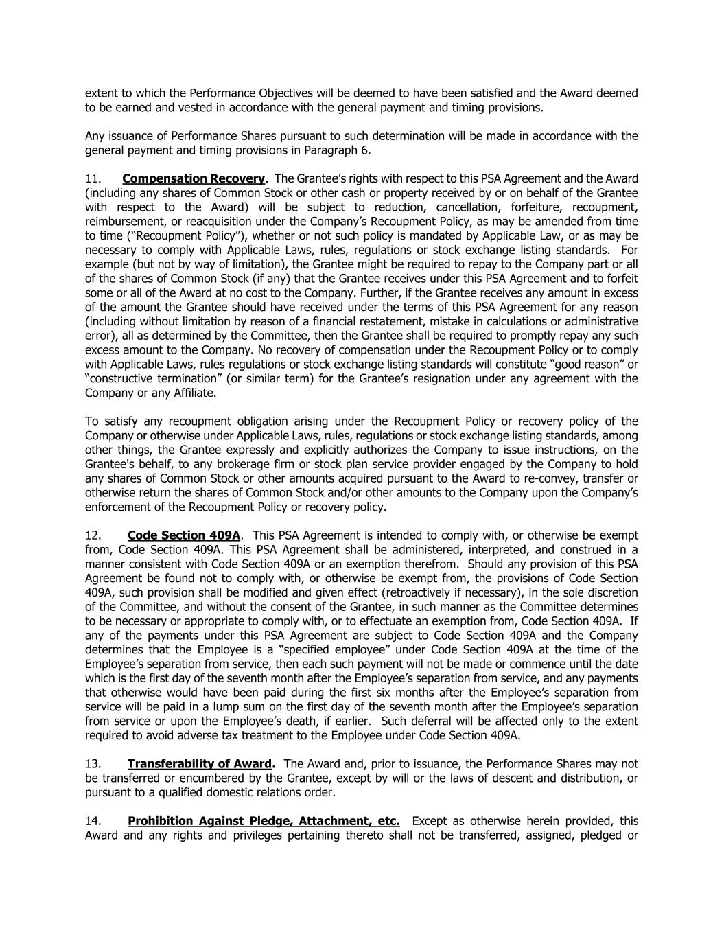 extent to which the Performance Objectives will be deemed to have been satisfied and the Award deemed to be earned and vested in accordance with the general payment and timing provisions. Any issuance of Performance Shares pursuant to such determination will be made in accordance with the general payment and timing provisions in Paragraph 6. 11. Compensation Recovery. The Grantee’s rights with respect to this PSA Agreement and the Award (including any shares of Common Stock or other cash or property received by or on behalf of the Grantee with respect to the Award) will be subject to reduction, cancellation, forfeiture, recoupment, reimbursement, or reacquisition under the Company’s Recoupment Policy, as may be amended from time to time (“Recoupment Policy”), whether or not such policy is mandated by Applicable Law, or as may be necessary to comply with Applicable Laws, rules, regulations or stock exchange listing standards. For example (but not by way of limitation), the Grantee might be required to repay to the Company part or all of the shares of Common Stock (if any) that the Grantee receives under this PSA Agreement and to forfeit some or all of the Award at no cost to the Company. Further, if the Grantee receives any amount in excess of the amount the Grantee should have received under the terms of this PSA Agreement for any reason (including without limitation by reason of a financial restatement, mistake in calculations or administrative error), all as determined by the Committee, then the Grantee shall be required to promptly repay any such excess amount to the Company. No recovery of compensation under the Recoupment Policy or to comply with Applicable Laws, rules regulations or stock exchange listing standards will constitute “good reason” or “constructive termination” (or similar term) for the Grantee’s resignation under any agreement with the Company or any Affiliate. To satisfy any recoupment obligation arising under the Recoupment Policy or recovery policy of the Company or otherwise under Applicable Laws, rules, regulations or stock exchange listing standards, among other things, the Grantee expressly and explicitly authorizes the Company to issue instructions, on the Grantee's behalf, to any brokerage firm or stock plan service provider engaged by the Company to hold any shares of Common Stock or other amounts acquired pursuant to the Award to re-convey, transfer or otherwise return the shares of Common Stock and/or other amounts to the Company upon the Company’s enforcement of the Recoupment Policy or recovery policy. 12. Code Section 409A. This PSA Agreement is intended to comply with, or otherwise be exempt from, Code Section 409A. This PSA Agreement shall be administered, interpreted, and construed in a manner consistent with Code Section 409A or an exemption therefrom. Should any provision of this PSA Agreement be found not to comply with, or otherwise be exempt from, the provisions of Code Section 409A, such provision shall be modified and given effect (retroactively if necessary), in the sole discretion of the Committee, and without the consent of the Grantee, in such manner as the Committee determines to be necessary or appropriate to comply with, or to effectuate an exemption from, Code Section 409A. If any of the payments under this PSA Agreement are subject to Code Section 409A and the Company determines that the Employee is a “specified employee” under Code Section 409A at the time of the Employee’s separation from service, then each such payment will not be made or commence until the date which is the first day of the seventh month after the Employee’s separation from service, and any payments that otherwise would have been paid during the first six months after the Employee’s separation from service will be paid in a lump sum on the first day of the seventh month after the Employee’s separation from service or upon the Employee’s death, if earlier. Such deferral will be affected only to the extent required to avoid adverse tax treatment to the Employee under Code Section 409A. 13. Transferability of Award. The Award and, prior to issuance, the Performance Shares may not be transferred or encumbered by the Grantee, except by will or the laws of descent and distribution, or pursuant to a qualified domestic relations order. 14. Prohibition Against Pledge, Attachment, etc. Except as otherwise herein provided, this Award and any rights and privileges pertaining thereto shall not be transferred, assigned, pledged or