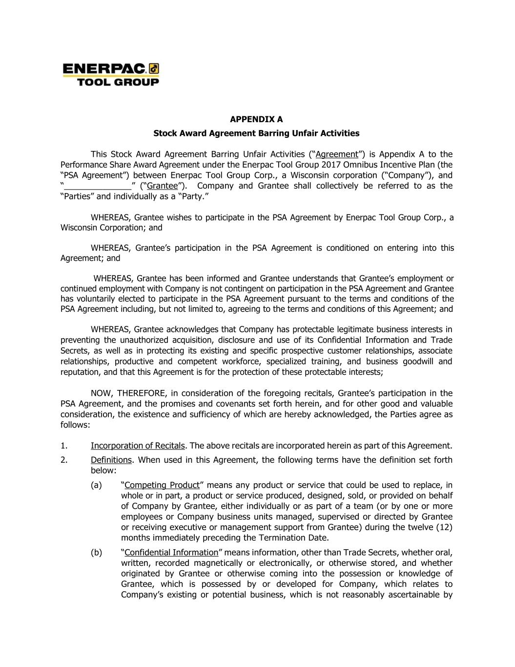 APPENDIX A Stock Award Agreement Barring Unfair Activities This Stock Award Agreement Barring Unfair Activities (“Agreement”) is Appendix A to the Performance Share Award Agreement under the Enerpac Tool Group 2017 Omnibus Incentive Plan (the “PSA Agreement”) between Enerpac Tool Group Corp., a Wisconsin corporation (“Company”), and “______________” (“Grantee”). Company and Grantee shall collectively be referred to as the “Parties” and individually as a “Party.” WHEREAS, Grantee wishes to participate in the PSA Agreement by Enerpac Tool Group Corp., a Wisconsin Corporation; and WHEREAS, Grantee’s participation in the PSA Agreement is conditioned on entering into this Agreement; and WHEREAS, Grantee has been informed and Grantee understands that Grantee’s employment or continued employment with Company is not contingent on participation in the PSA Agreement and Grantee has voluntarily elected to participate in the PSA Agreement pursuant to the terms and conditions of the PSA Agreement including, but not limited to, agreeing to the terms and conditions of this Agreement; and WHEREAS, Grantee acknowledges that Company has protectable legitimate business interests in preventing the unauthorized acquisition, disclosure and use of its Confidential Information and Trade Secrets, as well as in protecting its existing and specific prospective customer relationships, associate relationships, productive and competent workforce, specialized training, and business goodwill and reputation, and that this Agreement is for the protection of these protectable interests; NOW, THEREFORE, in consideration of the foregoing recitals, Grantee’s participation in the PSA Agreement, and the promises and covenants set forth herein, and for other good and valuable consideration, the existence and sufficiency of which are hereby acknowledged, the Parties agree as follows: 1. Incorporation of Recitals. The above recitals are incorporated herein as part of this Agreement. 2. Definitions. When used in this Agreement, the following terms have the definition set forth below: (a) “Competing Product” means any product or service that could be used to replace, in whole or in part, a product or service produced, designed, sold, or provided on behalf of Company by Grantee, either individually or as part of a team (or by one or more employees or Company business units managed, supervised or directed by Grantee or receiving executive or management support from Grantee) during the twelve (12) months immediately preceding the Termination Date. (b) “Confidential Information” means information, other than Trade Secrets, whether oral, written, recorded magnetically or electronically, or otherwise stored, and whether originated by Grantee or otherwise coming into the possession or knowledge of Grantee, which is possessed by or developed for Company, which relates to Company’s existing or potential business, which is not reasonably ascertainable by