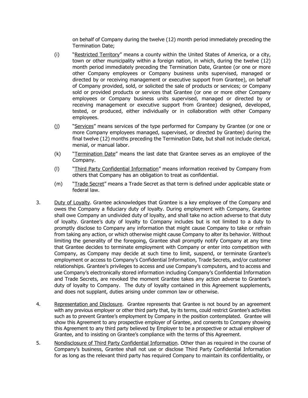 on behalf of Company during the twelve (12) month period immediately preceding the Termination Date; (i) “Restricted Territory” means a county within the United States of America, or a city, town or other municipality within a foreign nation, in which, during the twelve (12) month period immediately preceding the Termination Date, Grantee (or one or more other Company employees or Company business units supervised, managed or directed by or receiving management or executive support from Grantee), on behalf of Company provided, sold, or solicited the sale of products or services; or Company sold or provided products or services that Grantee (or one or more other Company employees or Company business units supervised, managed or directed by or receiving management or executive support from Grantee) designed, developed, tested, or produced, either individually or in collaboration with other Company employees. (j) “Services” means services of the type performed for Company by Grantee (or one or more Company employees managed, supervised, or directed by Grantee) during the final twelve (12) months preceding the Termination Date, but shall not include clerical, menial, or manual labor. (k) “Termination Date” means the last date that Grantee serves as an employee of the Company. (l) “Third Party Confidential Information” means information received by Company from others that Company has an obligation to treat as confidential. (m) “Trade Secret” means a Trade Secret as that term is defined under applicable state or federal law. 3. Duty of Loyalty. Grantee acknowledges that Grantee is a key employee of the Company and owes the Company a fiduciary duty of loyalty. During employment with Company, Grantee shall owe Company an undivided duty of loyalty, and shall take no action adverse to that duty of loyalty. Grantee’s duty of loyalty to Company includes but is not limited to a duty to promptly disclose to Company any information that might cause Company to take or refrain from taking any action, or which otherwise might cause Company to alter its behavior. Without limiting the generality of the foregoing, Grantee shall promptly notify Company at any time that Grantee decides to terminate employment with Company or enter into competition with Company, as Company may decide at such time to limit, suspend, or terminate Grantee’s employment or access to Company’s Confidential Information, Trade Secrets, and/or customer relationships. Grantee’s privileges to access and use Company’s computers, and to access and use Company’s electronically stored information including Company’s Confidential Information and Trade Secrets, are revoked the moment Grantee takes any action adverse to Grantee’s duty of loyalty to Company. The duty of loyalty contained in this Agreement supplements, and does not supplant, duties arising under common law or otherwise. 4. Representation and Disclosure. Grantee represents that Grantee is not bound by an agreement with any previous employer or other third party that, by its terms, could restrict Grantee’s activities such as to prevent Grantee’s employment by Company in the position contemplated. Grantee will show this Agreement to any prospective employer of Grantee, and consents to Company showing this Agreement to any third party believed by Employer to be a prospective or actual employer of Grantee, and to insisting on Grantee’s compliance with the terms of this Agreement. 5. Nondisclosure of Third Party Confidential Information. Other than as required in the course of Company’s business, Grantee shall not use or disclose Third Party Confidential Information for as long as the relevant third party has required Company to maintain its confidentiality, or