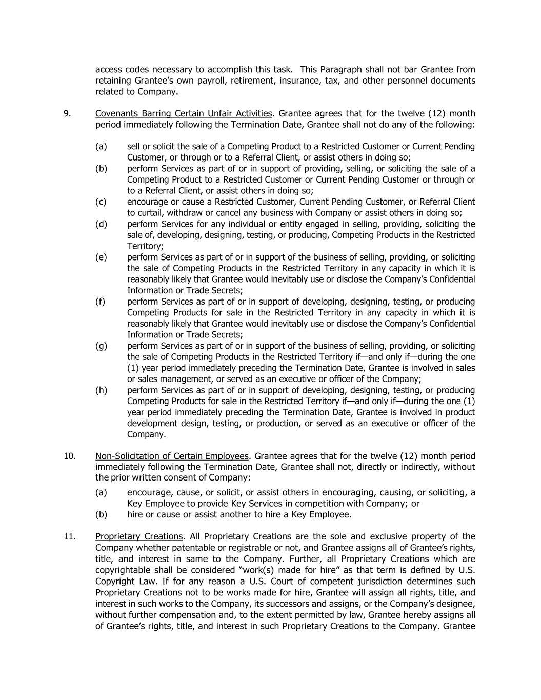 access codes necessary to accomplish this task. This Paragraph shall not bar Grantee from retaining Grantee’s own payroll, retirement, insurance, tax, and other personnel documents related to Company. 9. Covenants Barring Certain Unfair Activities. Grantee agrees that for the twelve (12) month period immediately following the Termination Date, Grantee shall not do any of the following: (a) sell or solicit the sale of a Competing Product to a Restricted Customer or Current Pending Customer, or through or to a Referral Client, or assist others in doing so; (b) perform Services as part of or in support of providing, selling, or soliciting the sale of a Competing Product to a Restricted Customer or Current Pending Customer or through or to a Referral Client, or assist others in doing so; (c) encourage or cause a Restricted Customer, Current Pending Customer, or Referral Client to curtail, withdraw or cancel any business with Company or assist others in doing so; (d) perform Services for any individual or entity engaged in selling, providing, soliciting the sale of, developing, designing, testing, or producing, Competing Products in the Restricted Territory; (e) perform Services as part of or in support of the business of selling, providing, or soliciting the sale of Competing Products in the Restricted Territory in any capacity in which it is reasonably likely that Grantee would inevitably use or disclose the Company’s Confidential Information or Trade Secrets; (f) perform Services as part of or in support of developing, designing, testing, or producing Competing Products for sale in the Restricted Territory in any capacity in which it is reasonably likely that Grantee would inevitably use or disclose the Company’s Confidential Information or Trade Secrets; (g) perform Services as part of or in support of the business of selling, providing, or soliciting the sale of Competing Products in the Restricted Territory if—and only if—during the one (1) year period immediately preceding the Termination Date, Grantee is involved in sales or sales management, or served as an executive or officer of the Company; (h) perform Services as part of or in support of developing, designing, testing, or producing Competing Products for sale in the Restricted Territory if—and only if—during the one (1) year period immediately preceding the Termination Date, Grantee is involved in product development design, testing, or production, or served as an executive or officer of the Company. 10. Non-Solicitation of Certain Employees. Grantee agrees that for the twelve (12) month period immediately following the Termination Date, Grantee shall not, directly or indirectly, without the prior written consent of Company: (a) encourage, cause, or solicit, or assist others in encouraging, causing, or soliciting, a Key Employee to provide Key Services in competition with Company; or (b) hire or cause or assist another to hire a Key Employee. 11. Proprietary Creations. All Proprietary Creations are the sole and exclusive property of the Company whether patentable or registrable or not, and Grantee assigns all of Grantee’s rights, title, and interest in same to the Company. Further, all Proprietary Creations which are copyrightable shall be considered “work(s) made for hire” as that term is defined by U.S. Copyright Law. If for any reason a U.S. Court of competent jurisdiction determines such Proprietary Creations not to be works made for hire, Grantee will assign all rights, title, and interest in such works to the Company, its successors and assigns, or the Company’s designee, without further compensation and, to the extent permitted by law, Grantee hereby assigns all of Grantee’s rights, title, and interest in such Proprietary Creations to the Company. Grantee