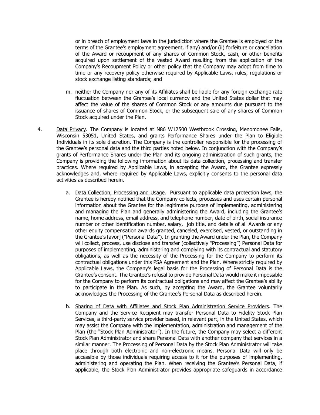 or in breach of employment laws in the jurisdiction where the Grantee is employed or the terms of the Grantee’s employment agreement, if any) and/or (ii) forfeiture or cancellation of the Award or recoupment of any shares of Common Stock, cash, or other benefits acquired upon settlement of the vested Award resulting from the application of the Company’s Recoupment Policy or other policy that the Company may adopt from time to time or any recovery policy otherwise required by Applicable Laws, rules, regulations or stock exchange listing standards; and m. neither the Company nor any of its Affiliates shall be liable for any foreign exchange rate fluctuation between the Grantee’s local currency and the United States dollar that may affect the value of the shares of Common Stock or any amounts due pursuant to the issuance of shares of Common Stock, or the subsequent sale of any shares of Common Stock acquired under the Plan. 4. Data Privacy. The Company is located at N86 W12500 Westbrook Crossing, Menomonee Falls, Wisconsin 53051, United States, and grants Performance Shares under the Plan to Eligible Individuals in its sole discretion. The Company is the controller responsible for the processing of the Grantee’s personal data and the third parties noted below. In conjunction with the Company’s grants of Performance Shares under the Plan and its ongoing administration of such grants, the Company is providing the following information about its data collection, processing and transfer practices. Where required by Applicable Laws, in accepting the Award, the Grantee expressly acknowledges and, where required by Applicable Laws, explicitly consents to the personal data activities as described herein. a. Data Collection, Processing and Usage. Pursuant to applicable data protection laws, the Grantee is hereby notified that the Company collects, processes and uses certain personal information about the Grantee for the legitimate purpose of implementing, administering and managing the Plan and generally administering the Award, including the Grantee’s name, home address, email address, and telephone number, date of birth, social insurance number or other identification number, salary, job title, and details of all Awards or any other equity compensation awards granted, canceled, exercised, vested, or outstanding in the Grantee’s favor] (“Personal Data”). In granting the Award under the Plan, the Company will collect, process, use disclose and transfer (collectively “Processing”) Personal Data for purposes of implementing, administering and complying with its contractual and statutory obligations, as well as the necessity of the Processing for the Company to perform its contractual obligations under this PSA Agreement and the Plan. Where strictly required by Applicable Laws, the Company’s legal basis for the Processing of Personal Data is the Grantee’s consent. The Grantee’s refusal to provide Personal Data would make it impossible for the Company to perform its contractual obligations and may affect the Grantee’s ability to participate in the Plan. As such, by accepting the Award, the Grantee voluntarily acknowledges the Processing of the Grantee’s Personal Data as described herein. b. Sharing of Data with Affiliates and Stock Plan Administration Service Providers. The Company and the Service Recipient may transfer Personal Data to Fidelity Stock Plan Services, a third-party service provider based, in relevant part, in the United States, which may assist the Company with the implementation, administration and management of the Plan (the “Stock Plan Administrator”). In the future, the Company may select a different Stock Plan Administrator and share Personal Data with another company that services in a similar manner. The Processing of Personal Data by the Stock Plan Administrator will take place through both electronic and non-electronic means. Personal Data will only be accessible by those individuals requiring access to it for the purposes of implementing, administering and operating the Plan. When receiving the Grantee’s Personal Data, if applicable, the Stock Plan Administrator provides appropriate safeguards in accordance