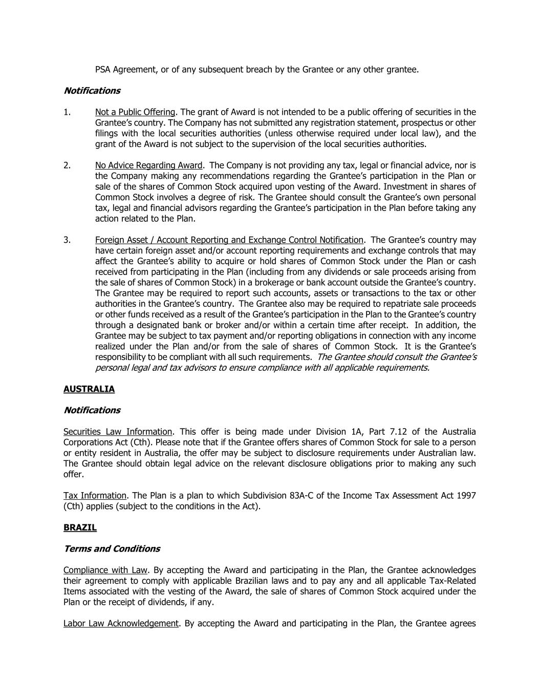 PSA Agreement, or of any subsequent breach by the Grantee or any other grantee. Notifications 1. Not a Public Offering. The grant of Award is not intended to be a public offering of securities in the Grantee’s country. The Company has not submitted any registration statement, prospectus or other filings with the local securities authorities (unless otherwise required under local law), and the grant of the Award is not subject to the supervision of the local securities authorities. 2. No Advice Regarding Award. The Company is not providing any tax, legal or financial advice, nor is the Company making any recommendations regarding the Grantee’s participation in the Plan or sale of the shares of Common Stock acquired upon vesting of the Award. Investment in shares of Common Stock involves a degree of risk. The Grantee should consult the Grantee’s own personal tax, legal and financial advisors regarding the Grantee’s participation in the Plan before taking any action related to the Plan. 3. Foreign Asset / Account Reporting and Exchange Control Notification. The Grantee’s country may have certain foreign asset and/or account reporting requirements and exchange controls that may affect the Grantee’s ability to acquire or hold shares of Common Stock under the Plan or cash received from participating in the Plan (including from any dividends or sale proceeds arising from the sale of shares of Common Stock) in a brokerage or bank account outside the Grantee’s country. The Grantee may be required to report such accounts, assets or transactions to the tax or other authorities in the Grantee’s country. The Grantee also may be required to repatriate sale proceeds or other funds received as a result of the Grantee’s participation in the Plan to the Grantee’s country through a designated bank or broker and/or within a certain time after receipt. In addition, the Grantee may be subject to tax payment and/or reporting obligations in connection with any income realized under the Plan and/or from the sale of shares of Common Stock. It is the Grantee’s responsibility to be compliant with all such requirements. The Grantee should consult the Grantee’s personal legal and tax advisors to ensure compliance with all applicable requirements. AUSTRALIA Notifications Securities Law Information. This offer is being made under Division 1A, Part 7.12 of the Australia Corporations Act (Cth). Please note that if the Grantee offers shares of Common Stock for sale to a person or entity resident in Australia, the offer may be subject to disclosure requirements under Australian law. The Grantee should obtain legal advice on the relevant disclosure obligations prior to making any such offer. Tax Information. The Plan is a plan to which Subdivision 83A-C of the Income Tax Assessment Act 1997 (Cth) applies (subject to the conditions in the Act). BRAZIL Terms and Conditions Compliance with Law. By accepting the Award and participating in the Plan, the Grantee acknowledges their agreement to comply with applicable Brazilian laws and to pay any and all applicable Tax-Related Items associated with the vesting of the Award, the sale of shares of Common Stock acquired under the Plan or the receipt of dividends, if any. Labor Law Acknowledgement. By accepting the Award and participating in the Plan, the Grantee agrees