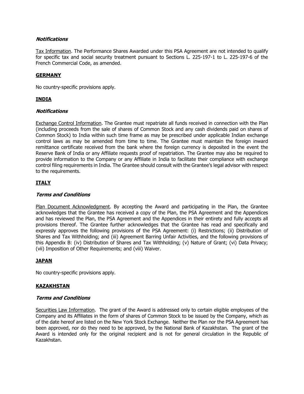Notifications Tax Information. The Performance Shares Awarded under this PSA Agreement are not intended to qualify for specific tax and social security treatment pursuant to Sections L. 225-197-1 to L. 225-197-6 of the French Commercial Code, as amended. GERMANY No country-specific provisions apply. INDIA Notifications Exchange Control Information. The Grantee must repatriate all funds received in connection with the Plan (including proceeds from the sale of shares of Common Stock and any cash dividends paid on shares of Common Stock) to India within such time frame as may be prescribed under applicable Indian exchange control laws as may be amended from time to time. The Grantee must maintain the foreign inward remittance certificate received from the bank where the foreign currency is deposited in the event the Reserve Bank of India or any Affiliate requests proof of repatriation. The Grantee may also be required to provide information to the Company or any Affiliate in India to facilitate their compliance with exchange control filing requirements in India. The Grantee should consult with the Grantee’s legal advisor with respect to the requirements. ITALY Terms and Conditions Plan Document Acknowledgment. By accepting the Award and participating in the Plan, the Grantee acknowledges that the Grantee has received a copy of the Plan, the PSA Agreement and the Appendices and has reviewed the Plan, the PSA Agreement and the Appendices in their entirety and fully accepts all provisions thereof. The Grantee further acknowledges that the Grantee has read and specifically and expressly approves the following provisions of the PSA Agreement: (i) Restrictions; (ii) Distribution of Shares and Tax Withholding; and (iii) Agreement Barring Unfair Activities, and the following provisions of this Appendix B: (iv) Distribution of Shares and Tax Withholding; (v) Nature of Grant; (vi) Data Privacy; (vii) Imposition of Other Requirements; and (viii) Waiver. JAPAN No country-specific provisions apply. KAZAKHSTAN Terms and Conditions Securities Law Information. The grant of the Award is addressed only to certain eligible employees of the Company and its Affiliates in the form of shares of Common Stock to be issued by the Company, which as of the date hereof are listed on the New York Stock Exchange. Neither the Plan nor the PSA Agreement has been approved, nor do they need to be approved, by the National Bank of Kazakhstan. The grant of the Award is intended only for the original recipient and is not for general circulation in the Republic of Kazakhstan.