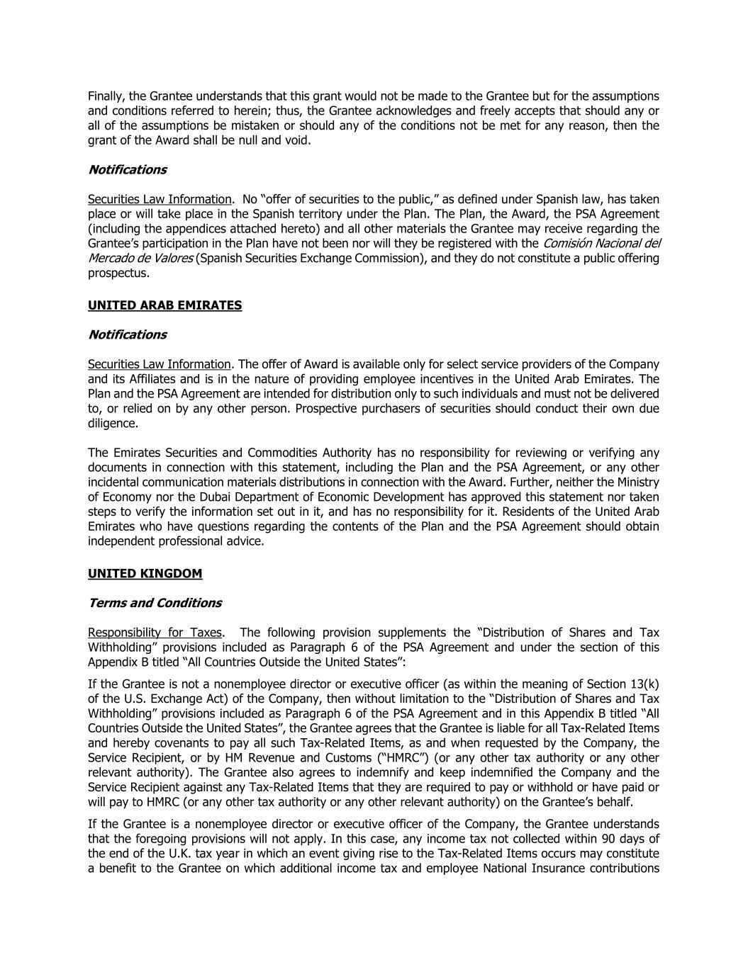 Finally, the Grantee understands that this grant would not be made to the Grantee but for the assumptions and conditions referred to herein; thus, the Grantee acknowledges and freely accepts that should any or all of the assumptions be mistaken or should any of the conditions not be met for any reason, then the grant of the Award shall be null and void. Notifications Securities Law Information. No “offer of securities to the public,” as defined under Spanish law, has taken place or will take place in the Spanish territory under the Plan. The Plan, the Award, the PSA Agreement (including the appendices attached hereto) and all other materials the Grantee may receive regarding the Grantee’s participation in the Plan have not been nor will they be registered with the Comisión Nacional del Mercado de Valores (Spanish Securities Exchange Commission), and they do not constitute a public offering prospectus. UNITED ARAB EMIRATES Notifications Securities Law Information. The offer of Award is available only for select service providers of the Company and its Affiliates and is in the nature of providing employee incentives in the United Arab Emirates. The Plan and the PSA Agreement are intended for distribution only to such individuals and must not be delivered to, or relied on by any other person. Prospective purchasers of securities should conduct their own due diligence. The Emirates Securities and Commodities Authority has no responsibility for reviewing or verifying any documents in connection with this statement, including the Plan and the PSA Agreement, or any other incidental communication materials distributions in connection with the Award. Further, neither the Ministry of Economy nor the Dubai Department of Economic Development has approved this statement nor taken steps to verify the information set out in it, and has no responsibility for it. Residents of the United Arab Emirates who have questions regarding the contents of the Plan and the PSA Agreement should obtain independent professional advice. UNITED KINGDOM Terms and Conditions Responsibility for Taxes. The following provision supplements the “Distribution of Shares and Tax Withholding” provisions included as Paragraph 6 of the PSA Agreement and under the section of this Appendix B titled “All Countries Outside the United States”: If the Grantee is not a nonemployee director or executive officer (as within the meaning of Section 13(k) of the U.S. Exchange Act) of the Company, then without limitation to the “Distribution of Shares and Tax Withholding” provisions included as Paragraph 6 of the PSA Agreement and in this Appendix B titled “All Countries Outside the United States”, the Grantee agrees that the Grantee is liable for all Tax-Related Items and hereby covenants to pay all such Tax-Related Items, as and when requested by the Company, the Service Recipient, or by HM Revenue and Customs (“HMRC”) (or any other tax authority or any other relevant authority). The Grantee also agrees to indemnify and keep indemnified the Company and the Service Recipient against any Tax-Related Items that they are required to pay or withhold or have paid or will pay to HMRC (or any other tax authority or any other relevant authority) on the Grantee’s behalf. If the Grantee is a nonemployee director or executive officer of the Company, the Grantee understands that the foregoing provisions will not apply. In this case, any income tax not collected within 90 days of the end of the U.K. tax year in which an event giving rise to the Tax-Related Items occurs may constitute a benefit to the Grantee on which additional income tax and employee National Insurance contributions