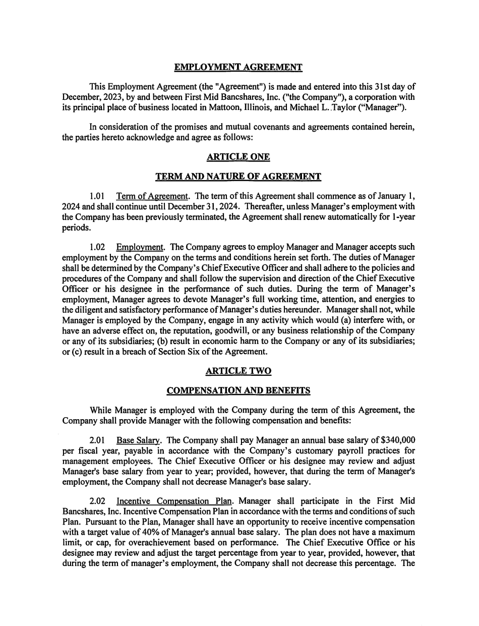 EMPLOYMENT AGREEMENT This Employment Agreement (the "Agreement") is made and entered into this 31 st day of December, 2023 , by and between First Mid Bancshares, Inc . ("the Company"), a corporation with its principal place of business located in Mattoon, Illinois, and Michael L .. Taylor ("Manager") . In consideration of the promises and mutual covenants and agreements contained herein, the parties hereto acknowledge and agree as follows : ARTICLE ONE TERM AND NATURE OF AGREEMENT 1. Term of Agreement . The term of this Agreement shall commence as of January 1 , 2024 and shall continue until December 31 , 2024 . Thereafter, unless Manager's employment with the Company has been previously terminated, the Agreement shall renew automatically for I - year periods . 2. Employment . The Company agrees to employ Manager and Manager accepts such employment by the Company on the terms and conditions herein set forth . The duties of Manager shall be determined by the Company's Chief Executive Officer and shall adhere to the policies and procedures of the Company and shall follow the supervision and direction of the Chief Executive Officer or his designee in the performance of such duties . During the term of Manager's employment, Manager agrees to devote Manager's full working time, attention, and energies to the diligent and satisfactory performance of Manager's duties hereunder . Manager shall not, while Manager is employed by the Company, engage in any activity which would (a) interfere with, or have an adverse effect on, the reputation, goodwill, or any business relationship of the Company or any of its subsidiaries ; (b) result in economic harm to the Company or any of its subsidiaries ; or (c) result in a breach of Section Six of the Agreement . ARTICLE TWO COMPENSATION AND BENEFITS While Manager is employed with the Company during the term of this Agreement, the Company shall provide Manager with the following compensation and benefits : 1. Base Salary . The Company shall pay Manager an annual base salary of $ 340 , 000 per fiscal year, payable in accordance with the Company's customary payroll practices for management employees . The Chief Executive Officer or his designee may review and adjust Manager's base salary from year to year ; provided, however, that during the term of Manager's employment, the Company shall not decrease Manager's base salary . 2. Incentive Compensation Plan . Manager shall participate in the First Mid Bancshares, Inc . Incentive Compensation Plan in accordance with the terms and conditions of such Plan . Pursuant to the Plan, Manager shall have an opportunity to receive incentive compensation with a target value of 40 % of Manager's annual base salary . The plan does not have a maximum limit, or cap, for overachievement based on performance . The Chief Executive Office or his designee may review and adjust the target percentage from year to year, provided, however, that during the term of manager's employment, the Company shall not decrease this percentage . The