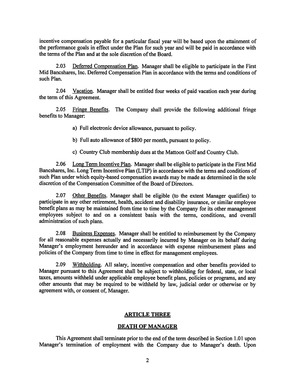 incentive compensation payable for a particular fiscal year will be based upon the attainment of the performance goals in effect under the Plan for such year and will be paid in accordance with the terms of the Plan and at the sole discretion of the Board . 3. Deferred Compensation Plan . Manager shall be eligible to participate in the First Mid Bancshares, Inc . Deferred Compensation Plan in accordance with the terms and conditions of such Plan . 4. Vacation . Manager shall be entitled four weeks of paid vacation each year during the term of this Agreement . 5. Fringe Benefits . The Company shall provide the following additional fringe benefits to Manager : a) Full electronic device allowance, pursuant to policy. b) Full auto allowance of $800 per month, pursuant to policy. c) Country Club membership dues at the Mattoon Golf and Country Club. 6. Long Term Incentive Plan . Manager shall be eligible to participate in the First Mid Bancshares, Inc . Long Term Incentive Plan (LTIP) in accordance with the terms and conditions of such Plan under which equity - based compensation awards may be made as determined in the sole discretion of the Compensation Committee of the Board of Directors . 7. Other Benefits . Manager shall be eligible (to the extent Manager qualifies) to participate in any other retirement, health, accident and disability insurance, or similar employee benefit plans as may be maintained from time to time by the Company for its other management employees subject to and on a consistent basis with the terms, conditions, and overall administration of such plans . 8. Business Expenses . Manager shall be entitled to reimbursement by the Company for all reasonable expenses actually and necessarily incurred by Manager on its behalf during Manager's employment hereunder and in accordance with expense reimbursement plans and policies of the Company from time to time in effect for management employees . 9. Withholding . All salary, incentive compensation and other benefits provided to Manager pursuant to this Agreement shall be subject to withholding for federal, state, or local taxes, amounts withheld under applicable employee benefit plans, policies or programs, and any other amounts that may be required to be withheld by law, judicial order or otherwise or by agreement with, or consent of, Manager . 2 ARTICLE THREE DEATH OF MANAGER This Agreement shall terminate prior to the end of the term described in Section 1.01 upon Manager's termination of employment with the Company due to Manager's death. Upon